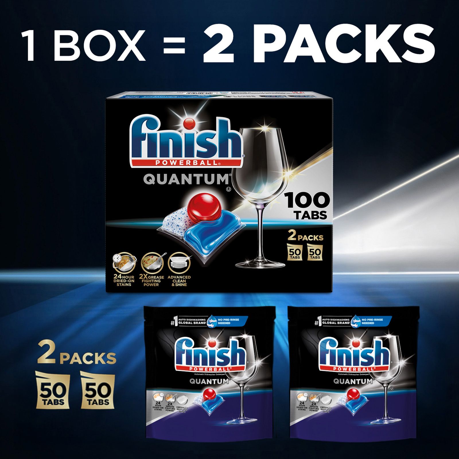Two doy bags of 50 tabs (total 100 tabs) #1 world's recommended brand, recommended by more dishwasher brands worldwide Ultimate clean, shine, and film protection Three separate fast dissolving chambers, delivering three different power actions Powder: scrubbing power to break down & remove toughest stuck on food in one wash Gel: Grease cutting power handles even the toughest messes Liquid Powerball: Filled with power actions that dry and deliver a finishing boost of shine
