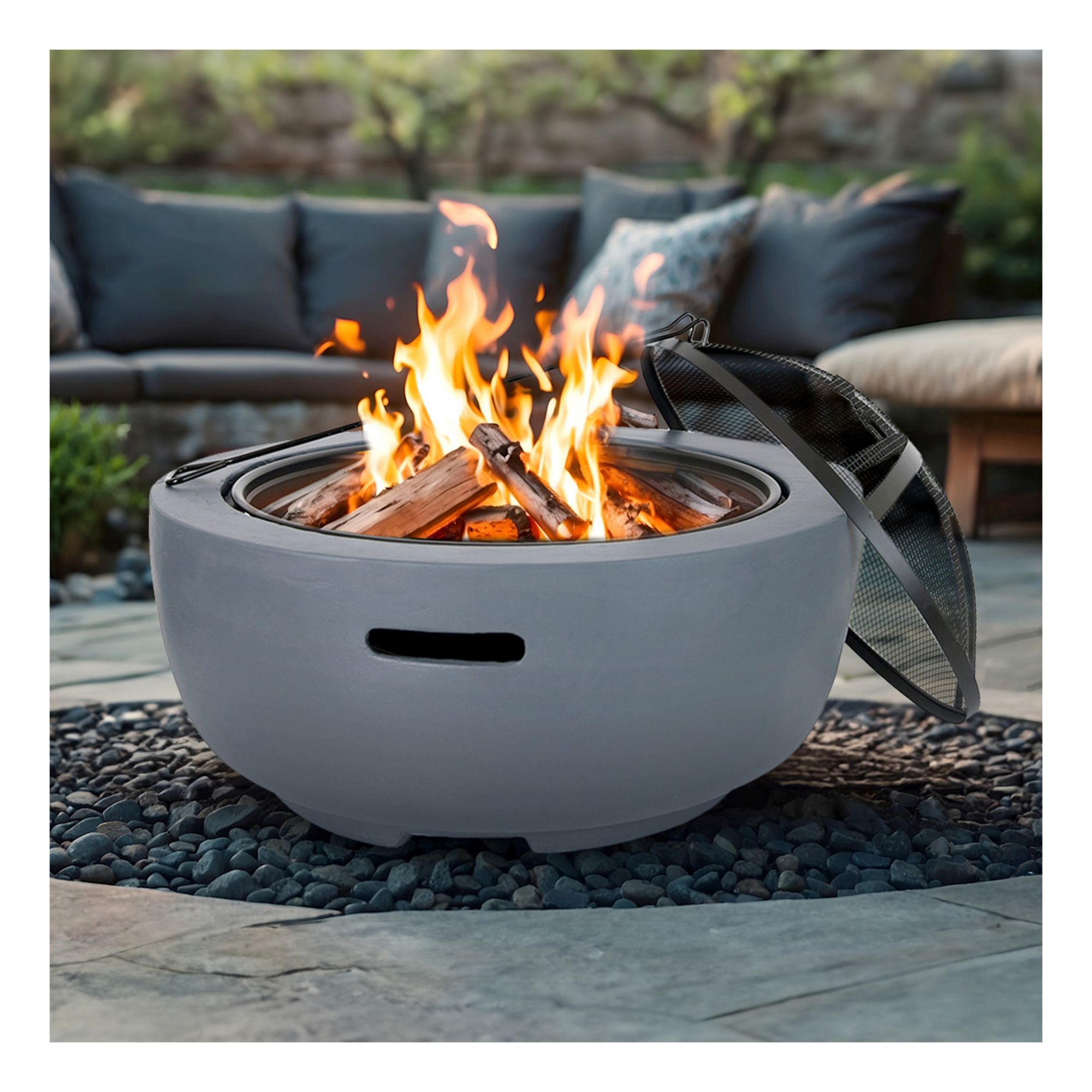 The included mesh fire screen protects against jumping sparks and provides for safe viewing of the fire
