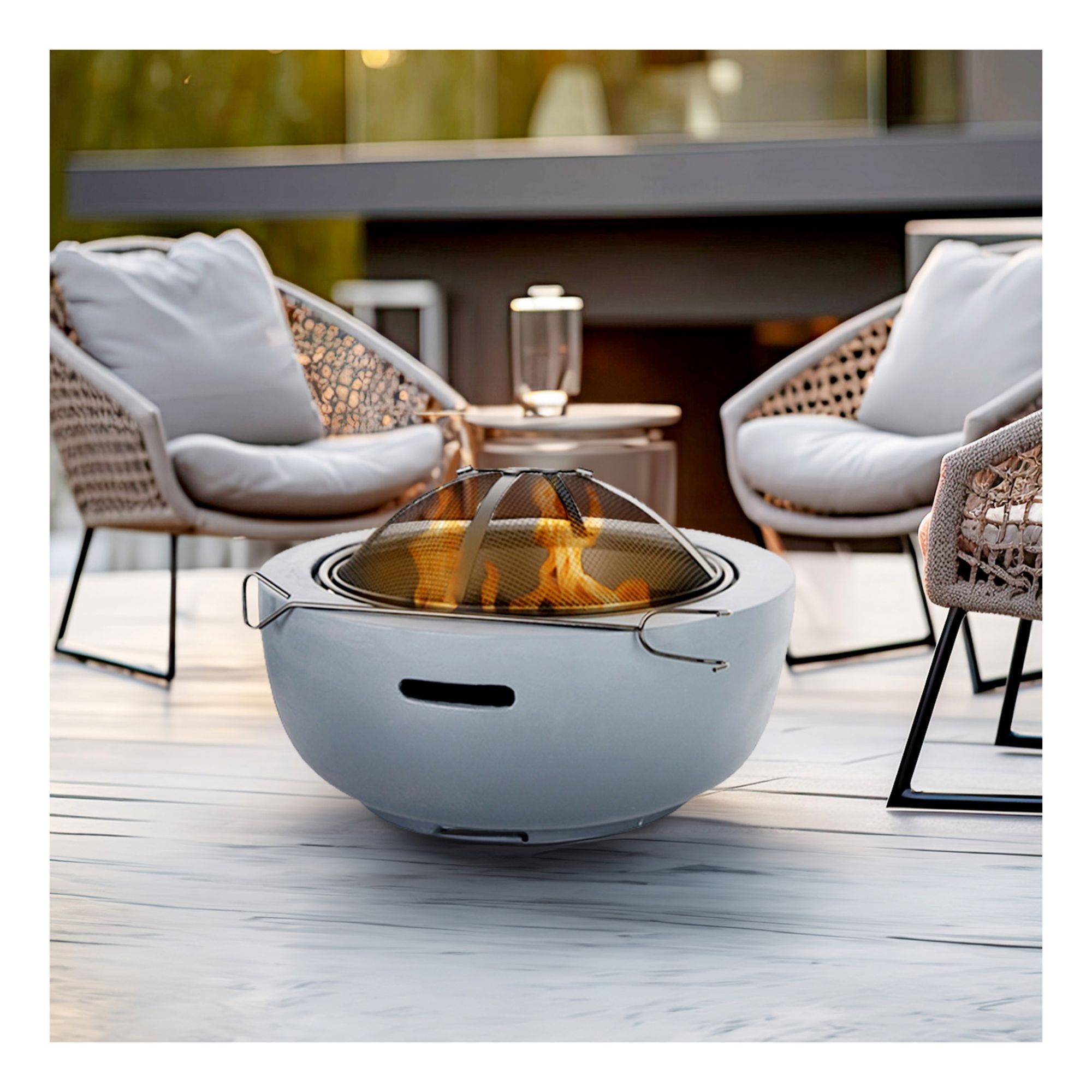 The concrete look combines functionality with modern aesthetics, providing a stylish focal point for your outdoor gatherings
