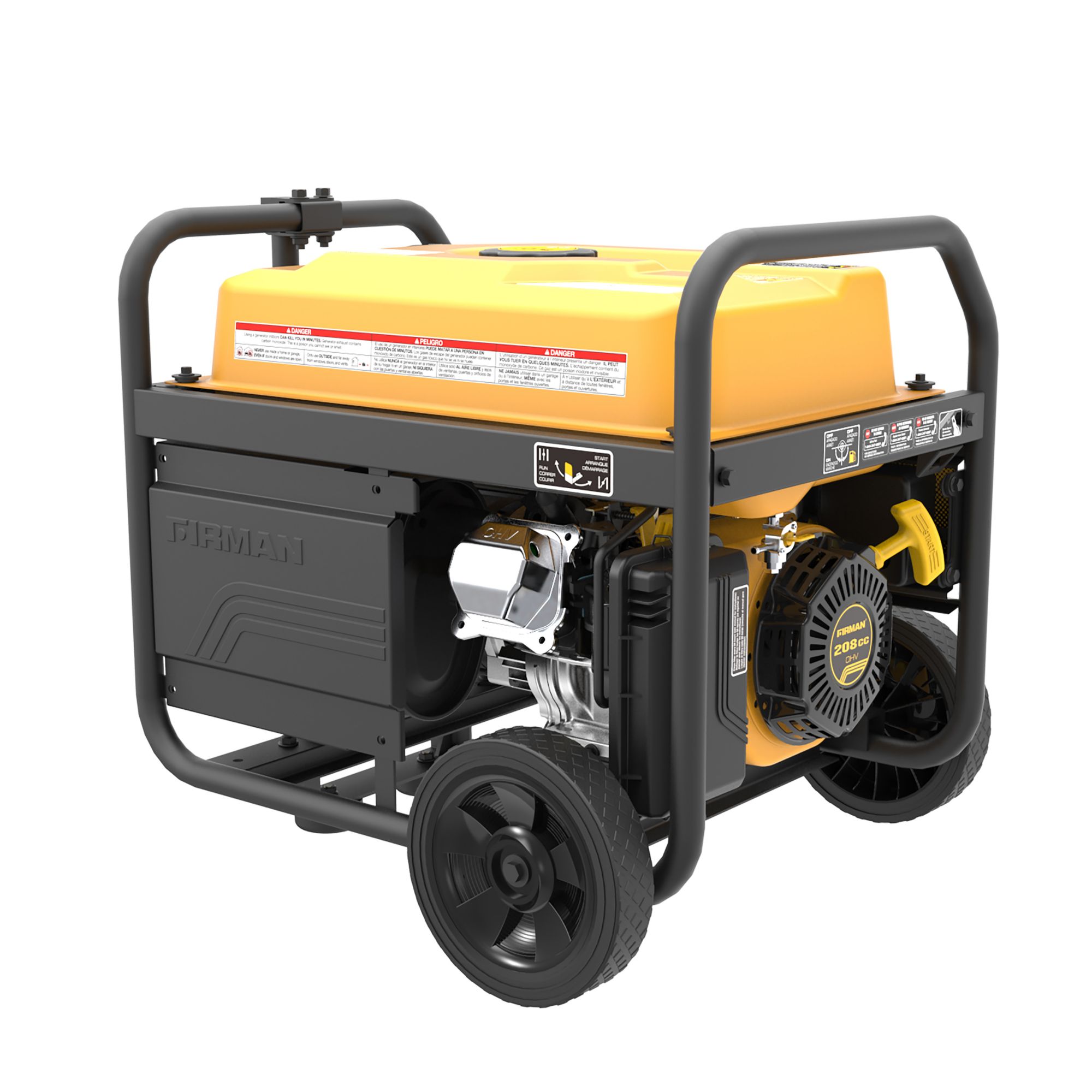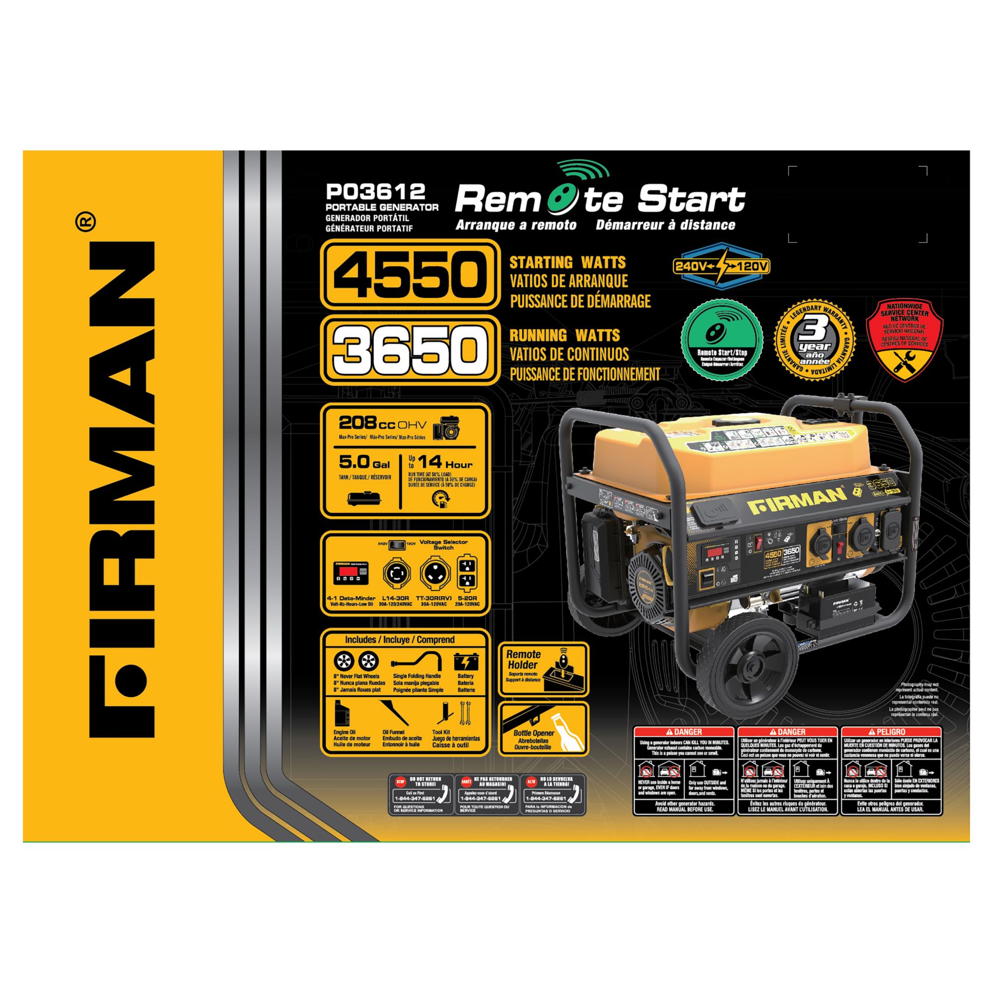 The FIRMAN P03612 is part of one of our most popular series of powerful generators. With 3650 watts running at 67dB, the P03612 is a remote start generator with 30A plugs, 8” wheel kit, folding handle, and is Canada emissions certified. Our Max Pro Series 208cc engine runs cool and efficient thanks to the Phoenix Fat Head Block. Equipped with a 5gal fuel tank, this generator will run for 14hrs. Easy information is at your fingertips with a 4-in-1 data minder measuring Volts, Hertz, hrs. and low oil indicator. Convenience and power truly are wrapped up in one for the P03612. Get the job done! Note: Everything you need is in the box including: oil, funnel, operator's manual, and spark plug wrench.