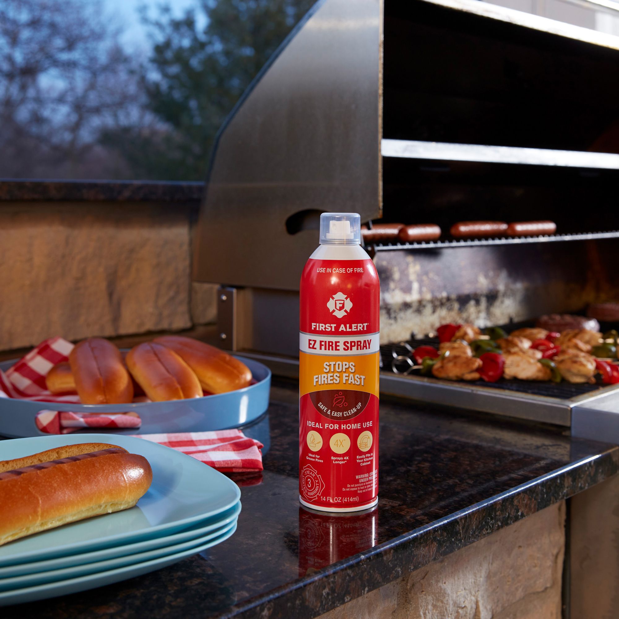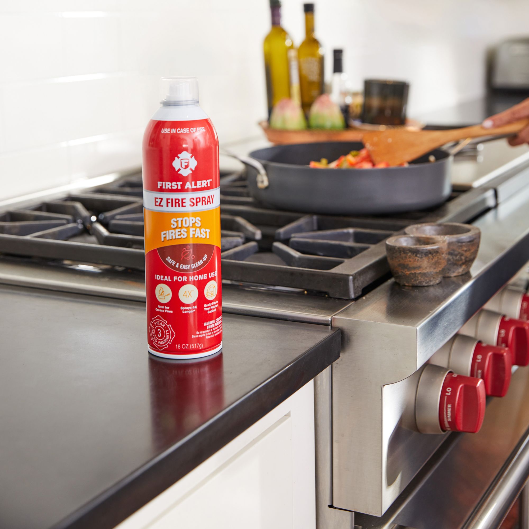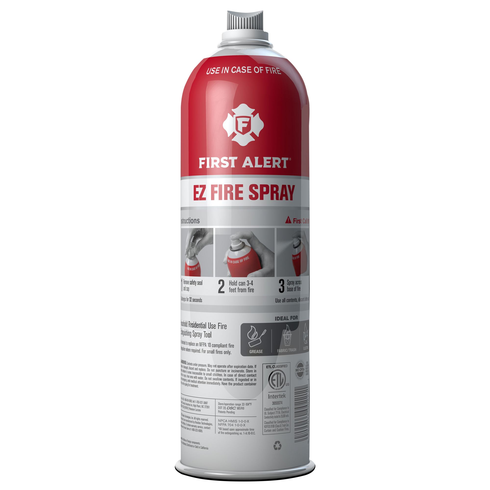 Equip yourself with First Alert’s EZ Fire Spray to help be prepared and stop fires fast! This aerosol fire extinguishing spray is compact, lightweight, and safe for indoor and outdoor use, making it an ideal product to have at home and on the go. It discharges four times longer and is easier to use than a traditional fire extinguisher. The portable size and aerosol spray nozzle make using this product fast and simple for common types of fires, including grease fires. Keep EZ Fire Spray in the kitchen, by the grill, in the RV, or take with you when camping to help be prepared.