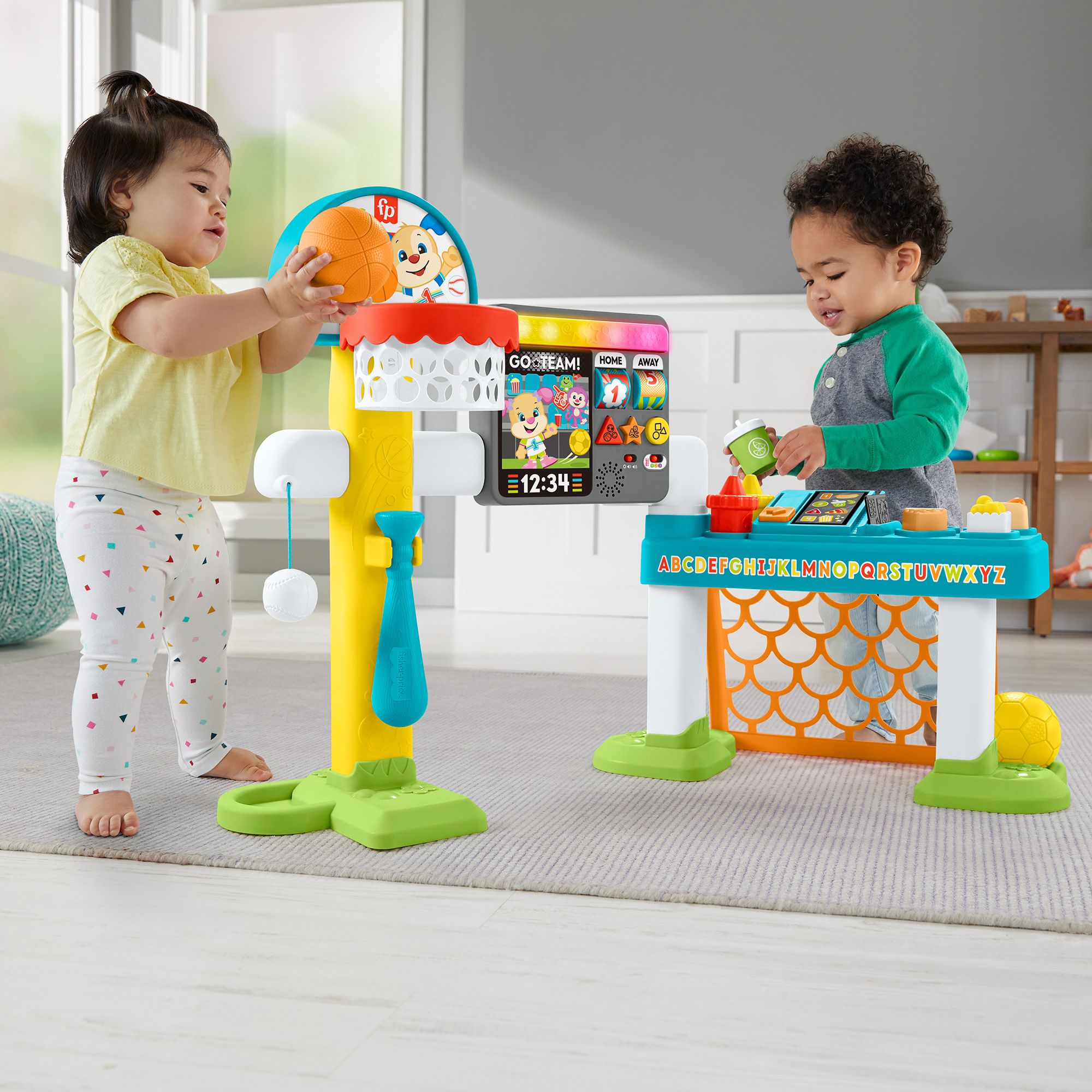Four ways to play. Basketball, soccer, and baseball sports toys plus pretend concession stand and light-up interactive scoreboard