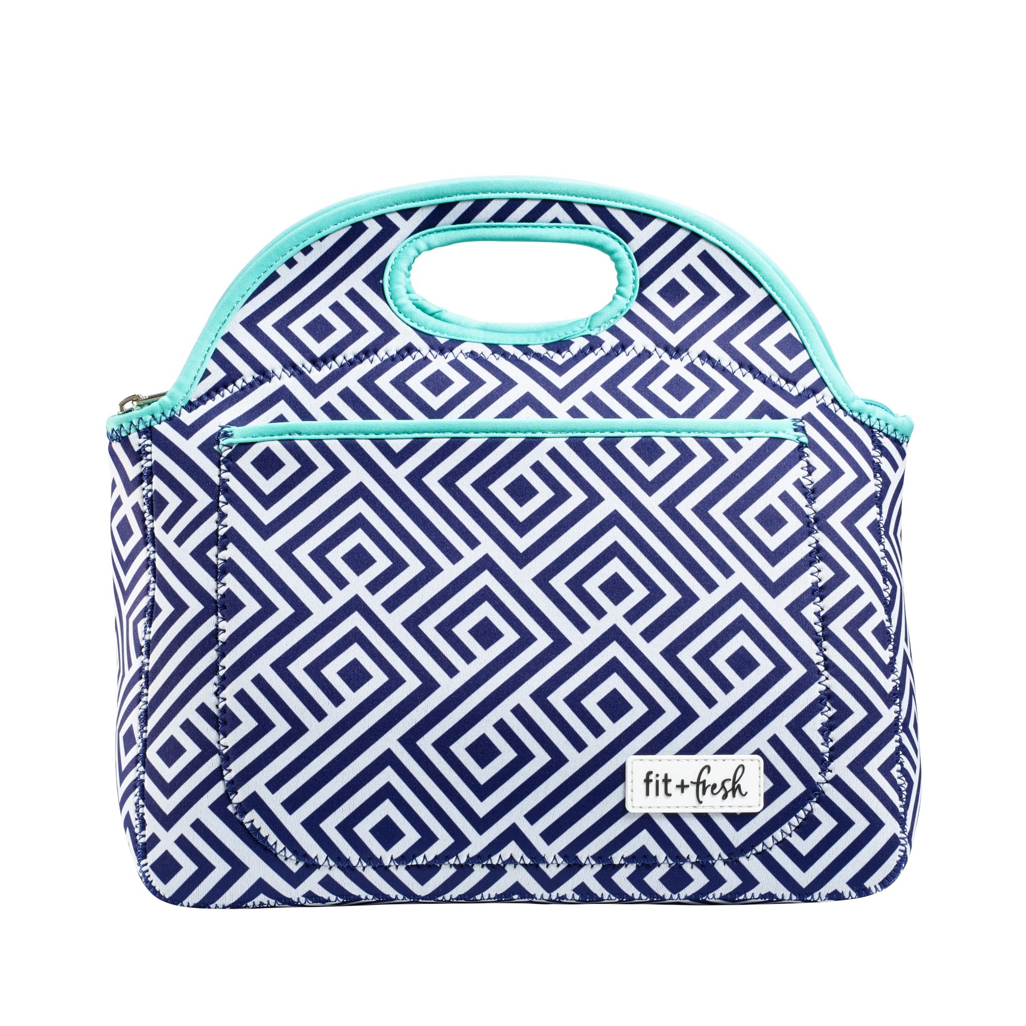 Pack your lunch in this stylish Fit and Fresh Rosewood Bag. This classic style neoprene lunch bag is available in a hip navy lattice print. Kit includes sandwich container that is BPA Free, microwave and dishwasher safe.