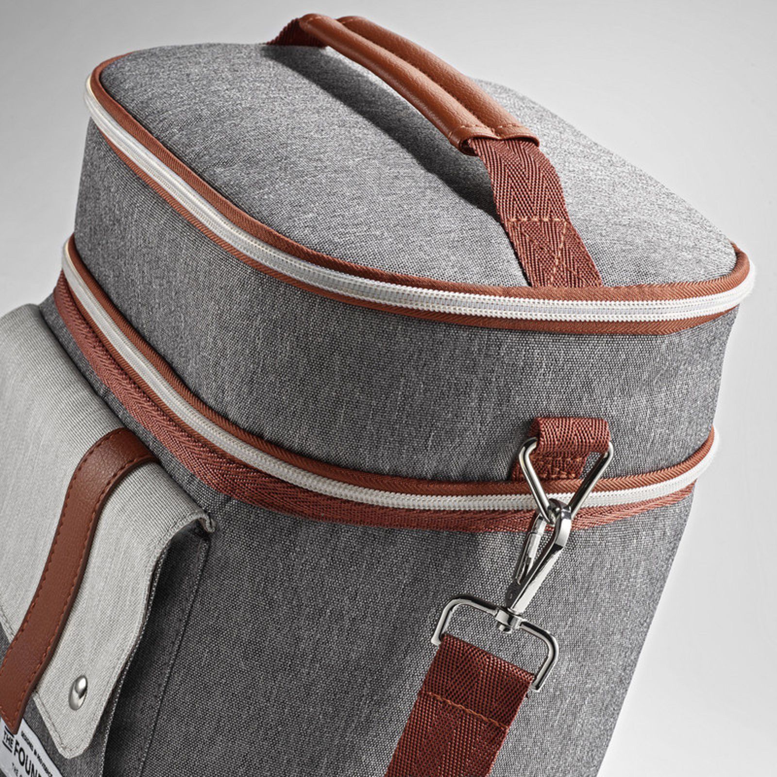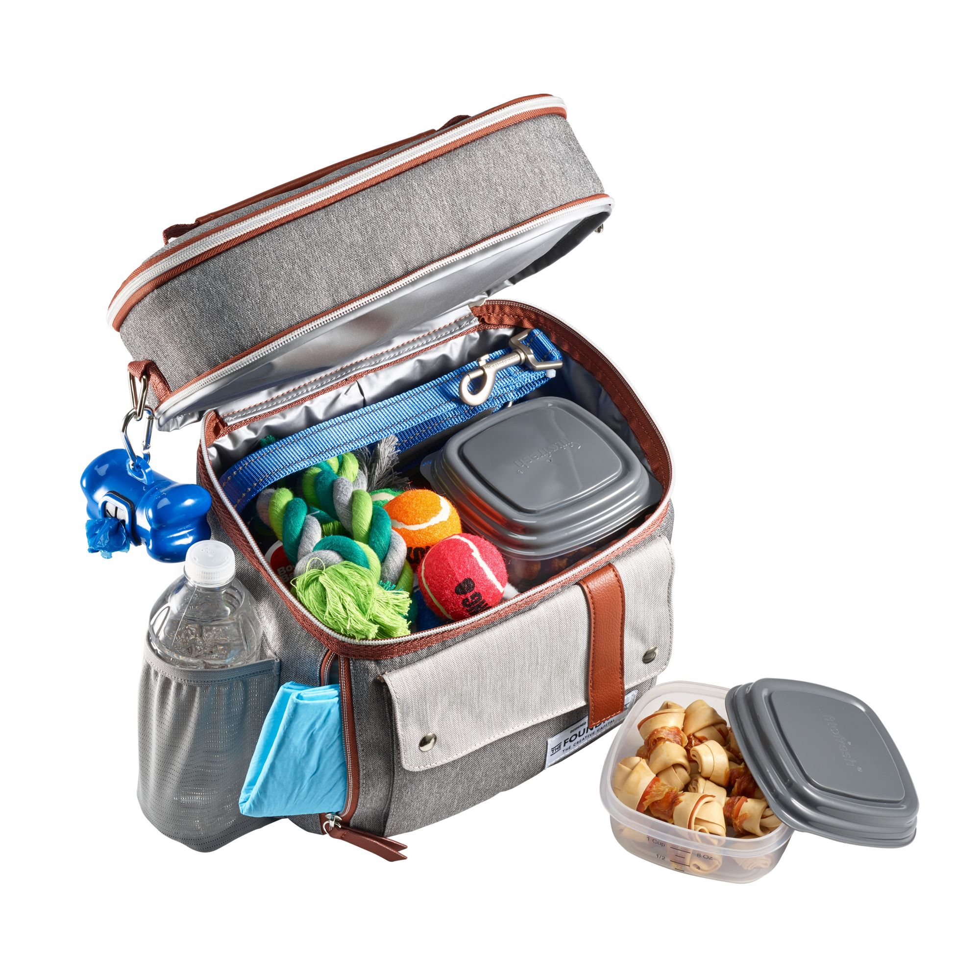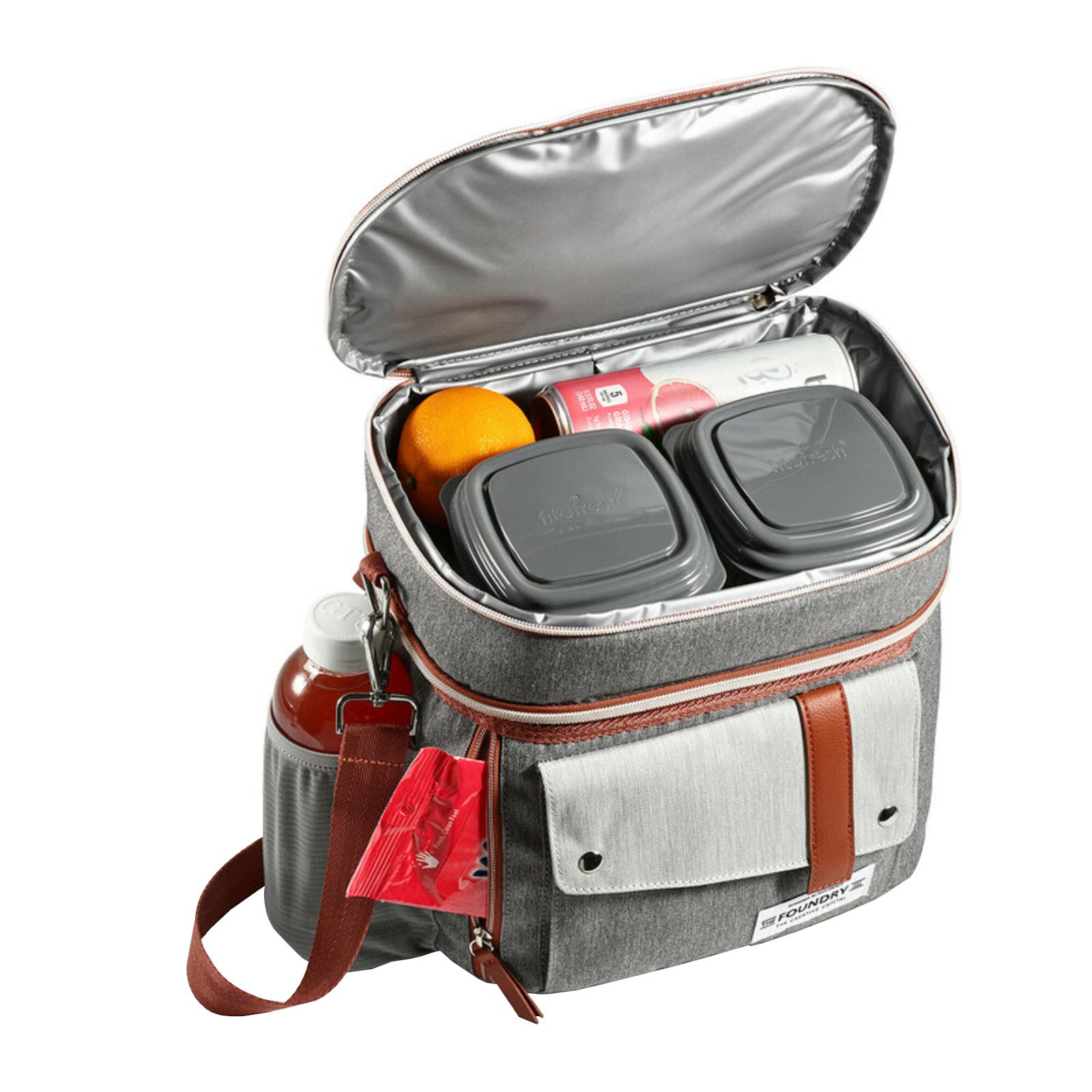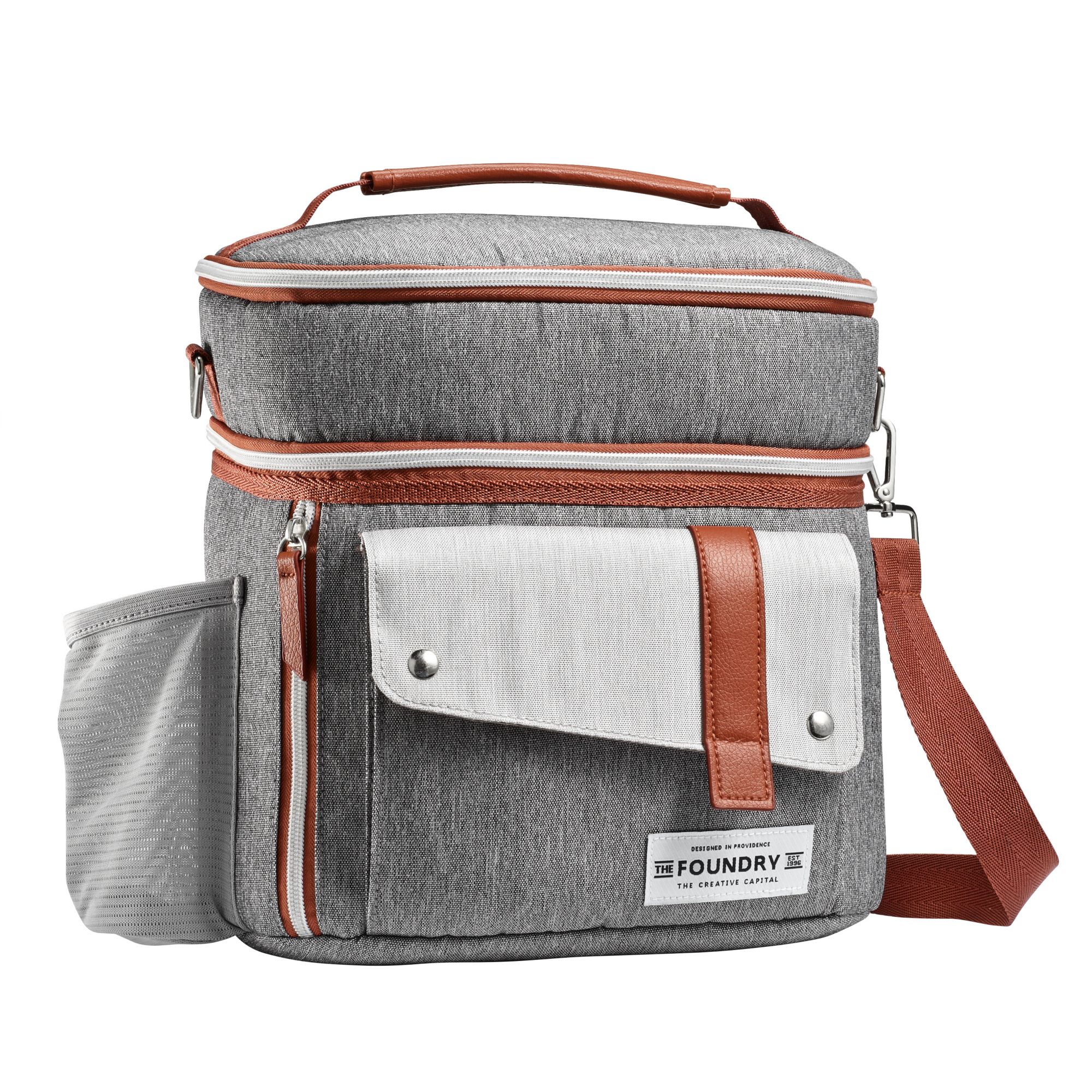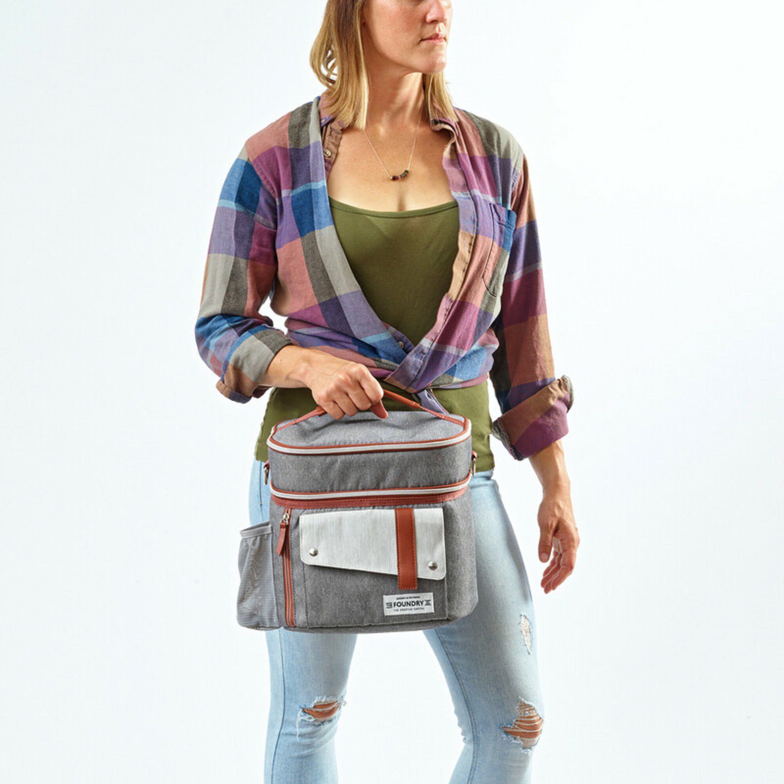 This thick insulated bag can be a lunch bag by day, a cooler bag by night, a bag for your pets, the sky is the limit! There are two compartments, the bottom larger pocket has a large capacity for lunch, snacks or drinks. The top compartment can hold smaller or delicate items. There is a front button pocket and a zipper pocket to hold items you need easy access to.