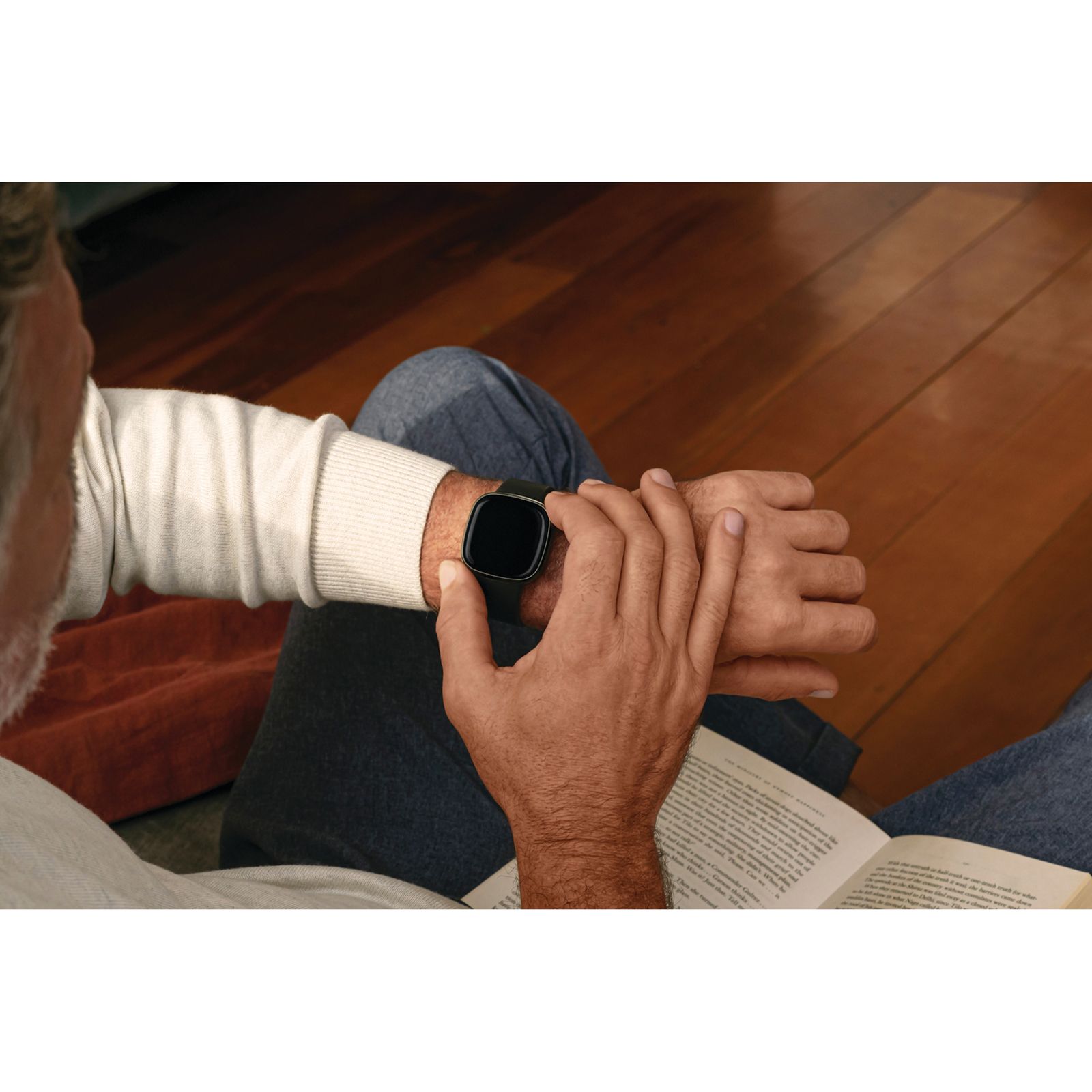 Meet Fitbit Sense, the advanced smartwatch that helps you tune in to your body and guides you toward better health. Assess your heart for atrial fibrillation (Afib) with a compatible ECG app right on your wrist, track and manage stress, better understand your sleep quality and even keep an eye on patterns in your skin temperature. Track SpO2 to help you learn when there may be an indication of important changes in your wellbeing. Plus, sense unlocks a six-month free trial of personalized guidance and advanced insights from Fitbit Premium for new Premium users. The bundle includes a graphite stainless steel smartwatch, carbon classic infinity bands (small and large), a bonus black sports accessory band (large), and a charging cable. The Fitbit ECG app is only available in select countries. Not intended for use by people under 22 years old.
