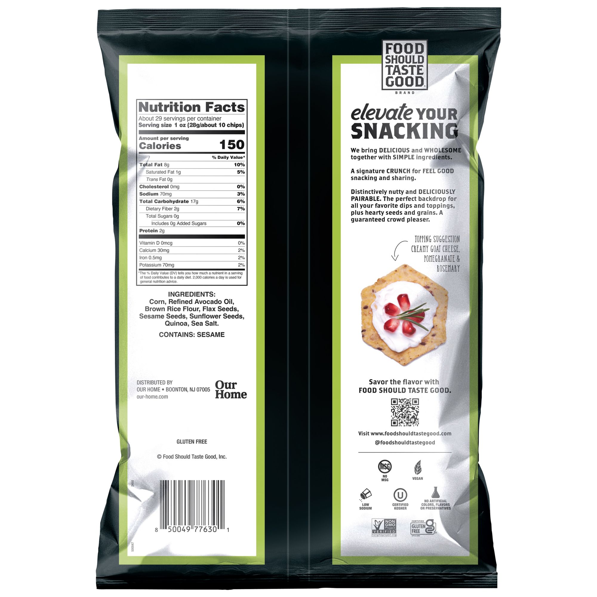 Ingredients: Corn, Refined Avocado Oil, Brown Rice Flour, Flax Seeds, Sesame Seeds, Sunflower Seeds, Quinoa, Sea Salt.