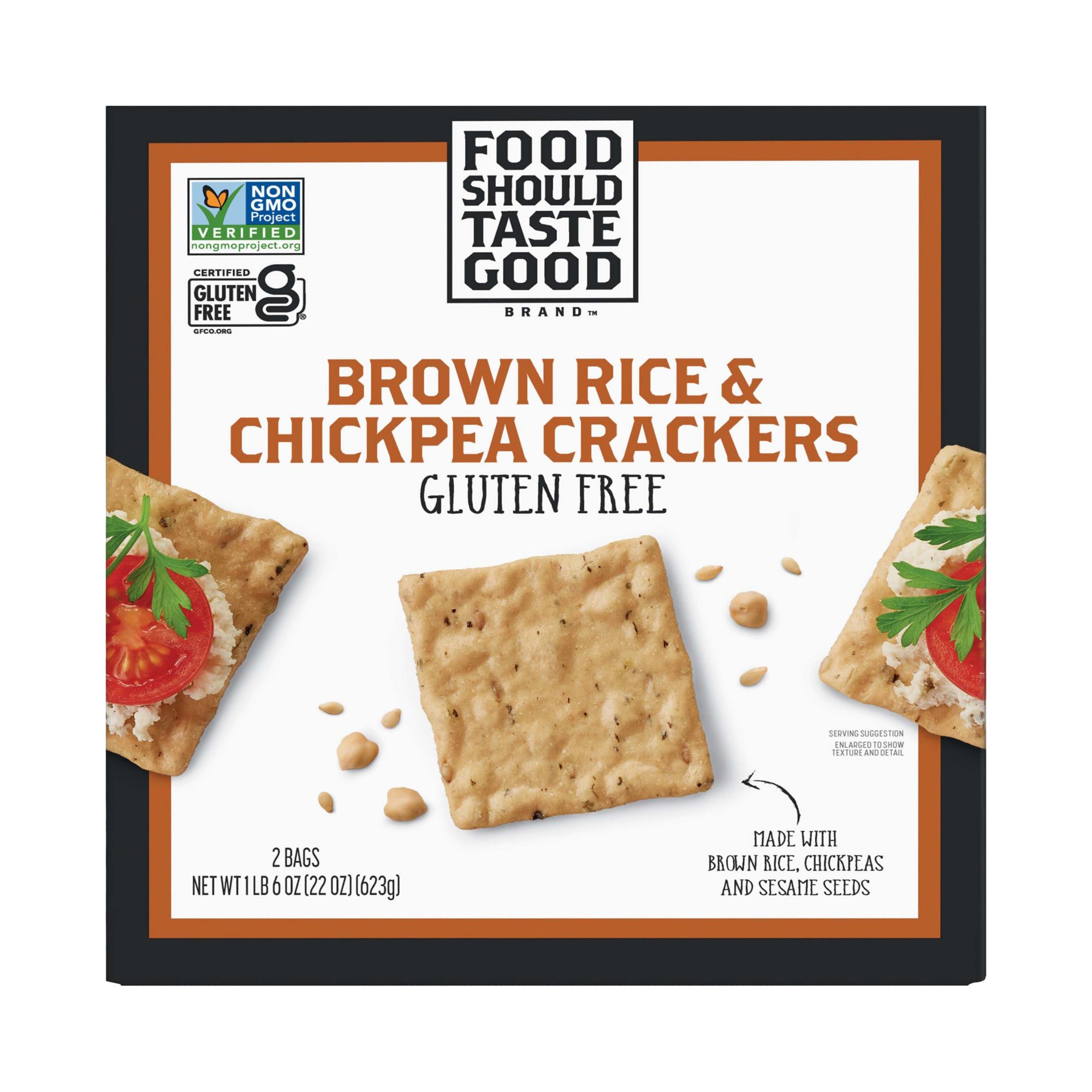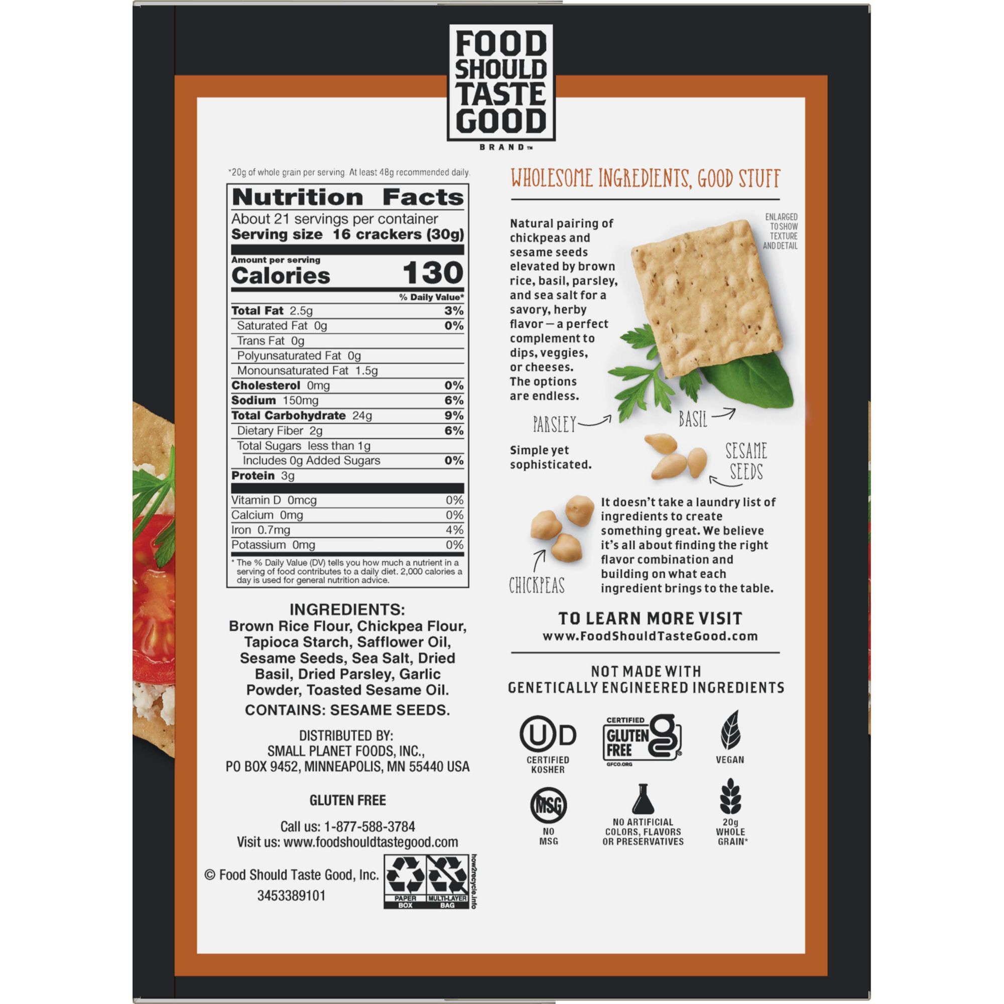 Food Should Taste Good Brown Rice & Chickpea Crackers are a natural pairing of chickpeas and sesame seeds elevated by brown rice, basil, parsley, and sea salt for a savory, herby flavor - a perfect complement to dips, veggies, or cheeses. The options are endless. Great for Topping or Snacking. Simple yet sophisticated. It doesn't take a laundry list of ingredients to create something great. We believe it's all about finding the right flavor combination and building on what each ingredient brings to the table. These crackers are made with 20g of whole grain in every serving and no artificial colors, flavors, or preservatives. Just Wholesome Ingredients. Good Stuff. We believe food should taste good. We also believe every craving can be satisfied with real food. We use nothing but wholesome ingredients to create a unique and flavorful snack you can feel good about. Box contains 2 bags of crackers.