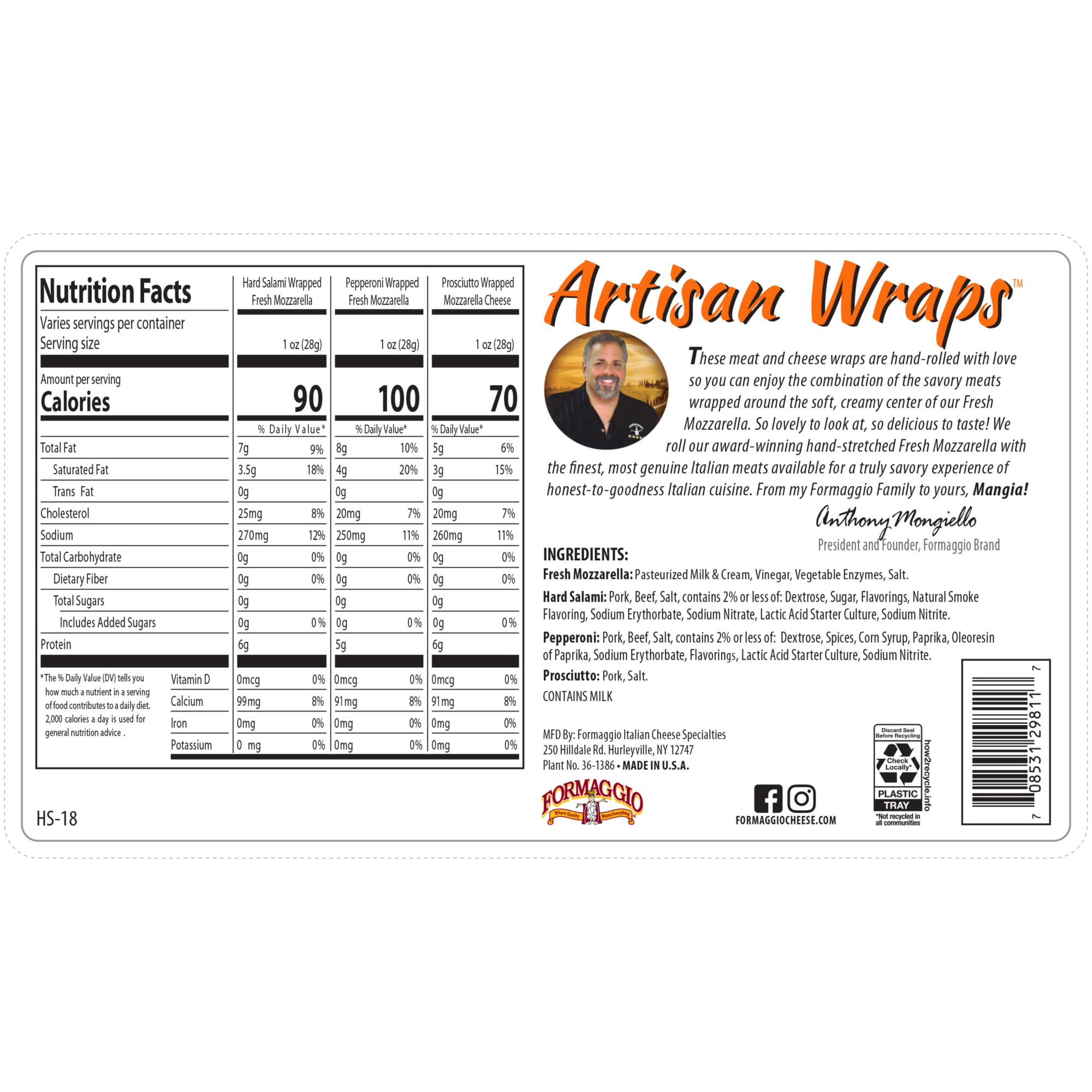 Includes 18 oz. tray of artisan wraps made of fresh mozzarella enrobed by pepperoni, prosciutto, and hard salami