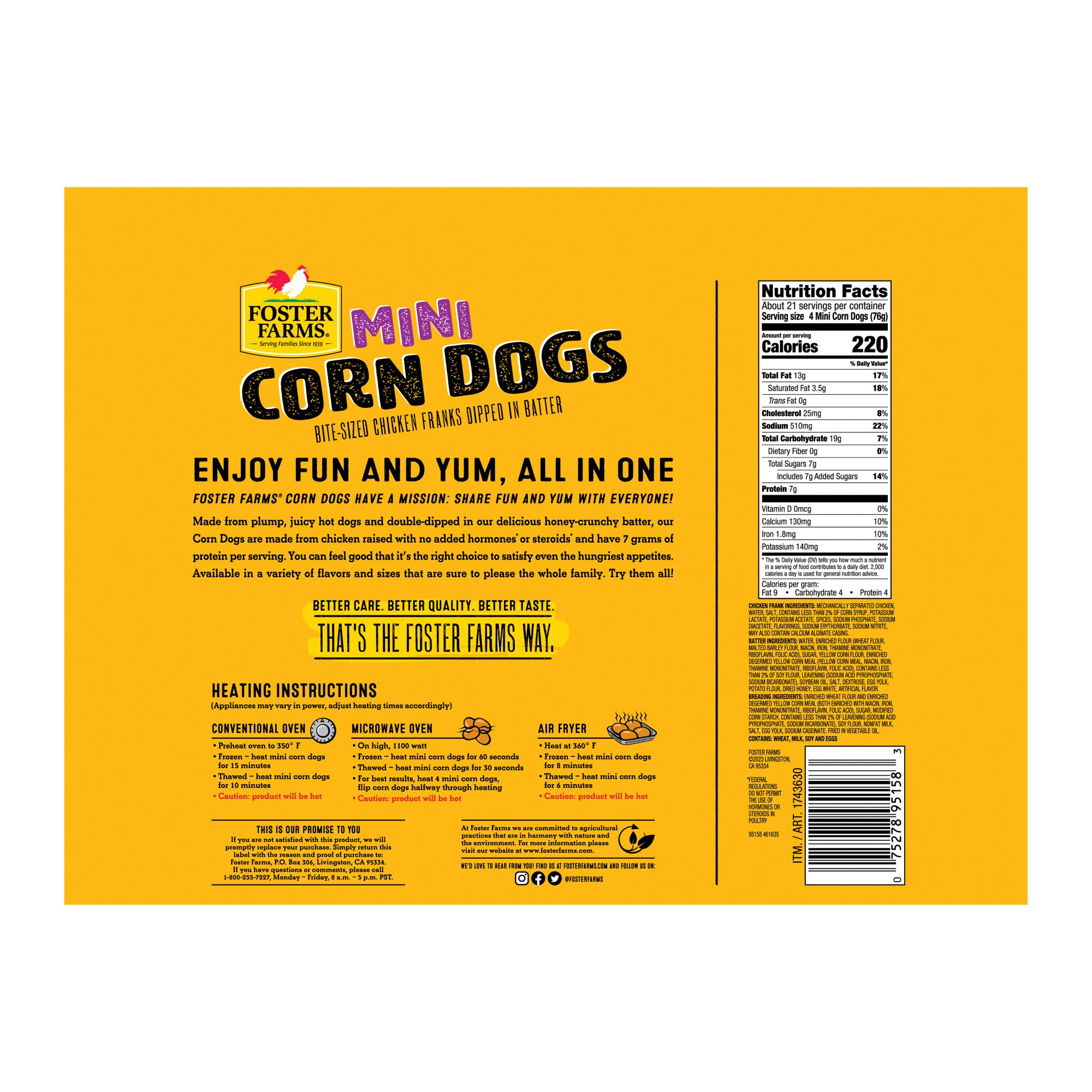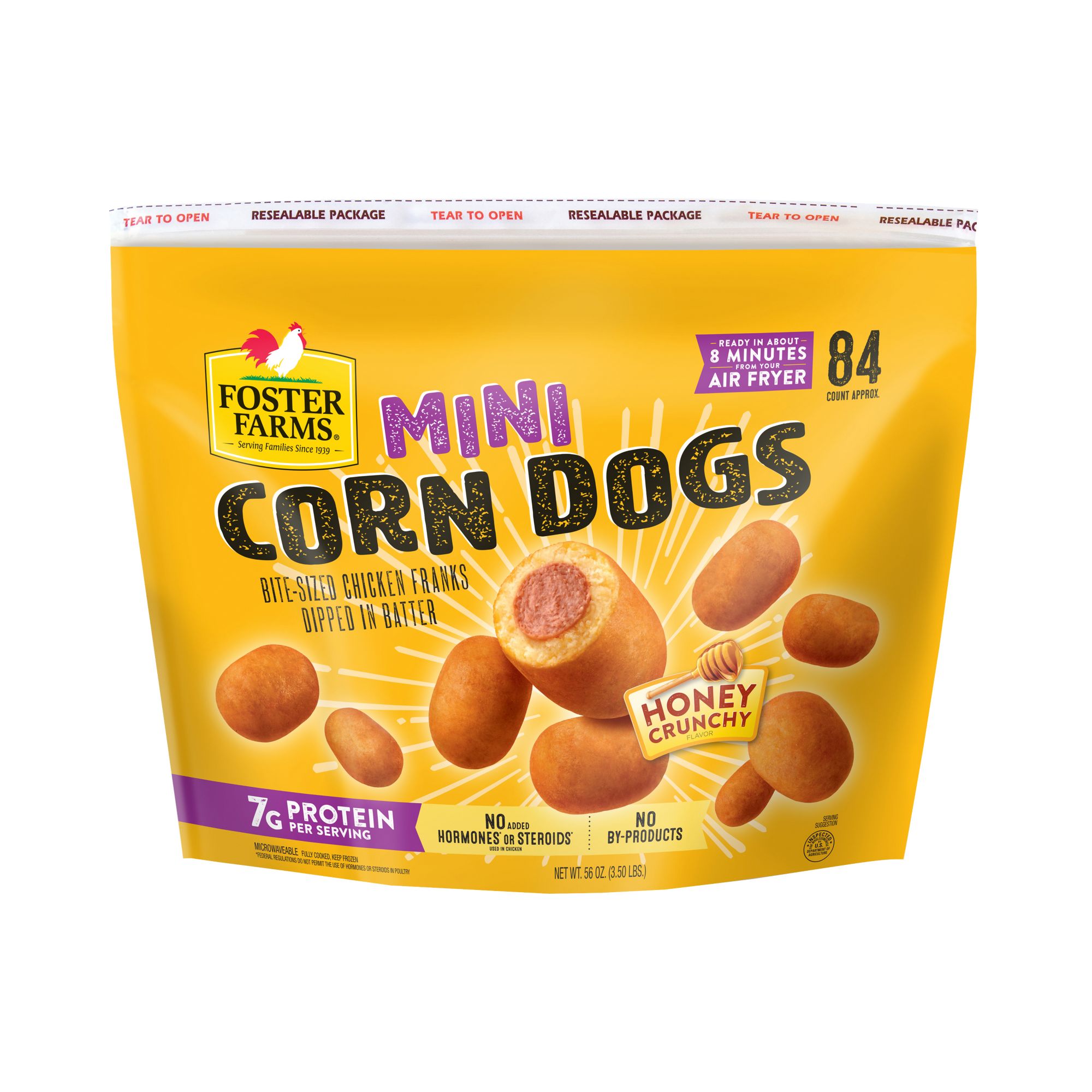 Made from plump, juicy hot dogs and double dipped in a delicious honey crunch batter, these corn dogs are made from chicken raised with no added hormones or steroids, and have 7 grams of protein per serving.