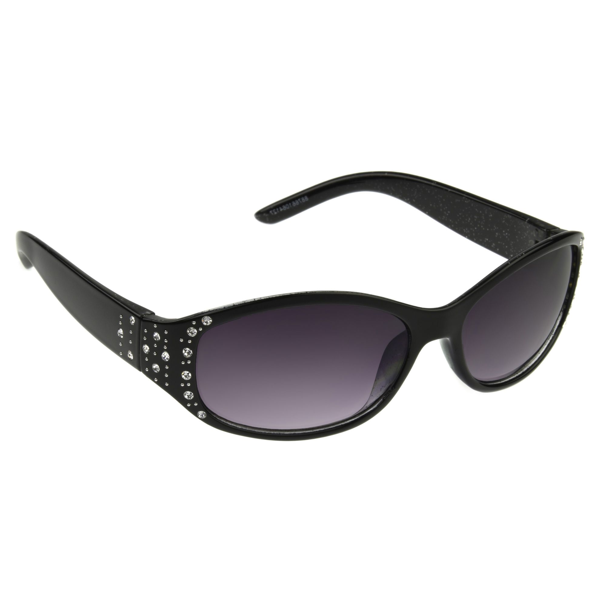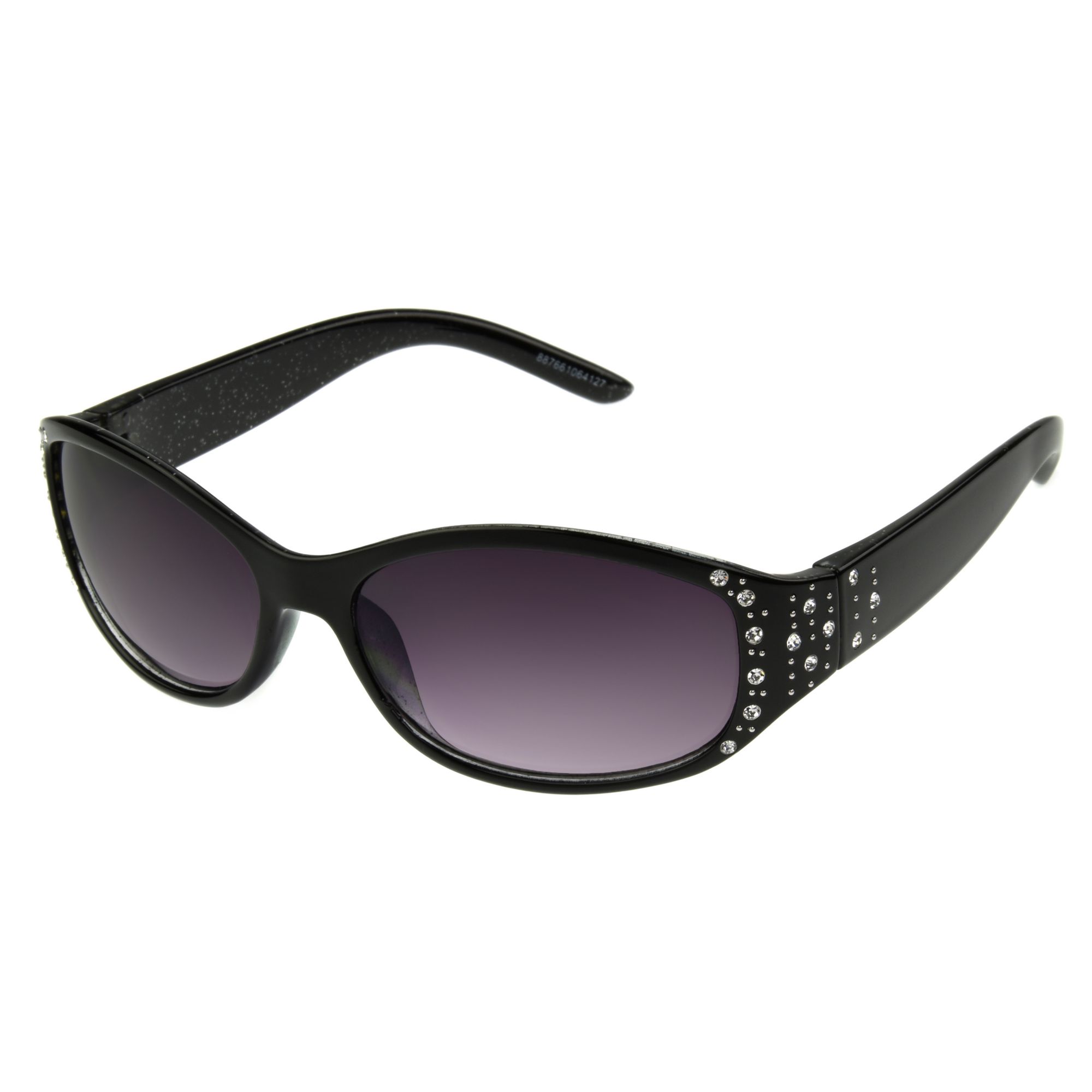 These Foster Grant women's fashion sunglasses, feature narrow oval frame fronts in a black finish. Crystal details on the temples elevate the look. The dark lenses are not only fashion-forward but are also equipped with scratch and impact-resistant technology, ensuring they stay in pristine condition. With 100% UVA-UVB lens protection, these sunglasses seamlessly blend chic design with essential eye care.