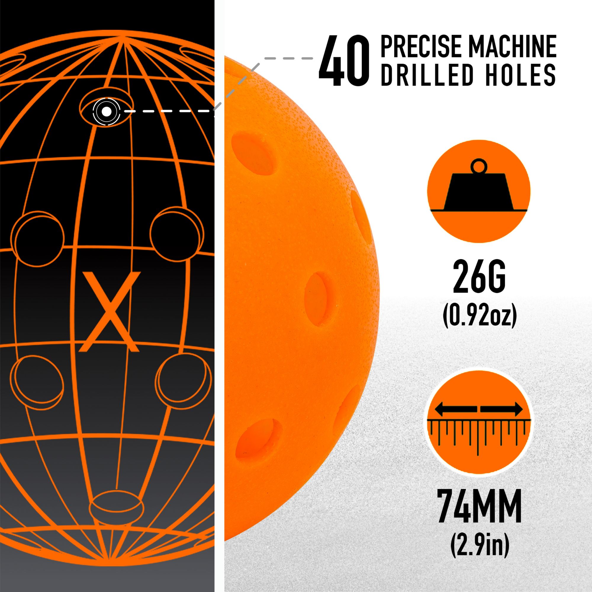 Rotationally molded balls feature superb visibility and 40 precisely drilled holes to create a balanced flight pattern