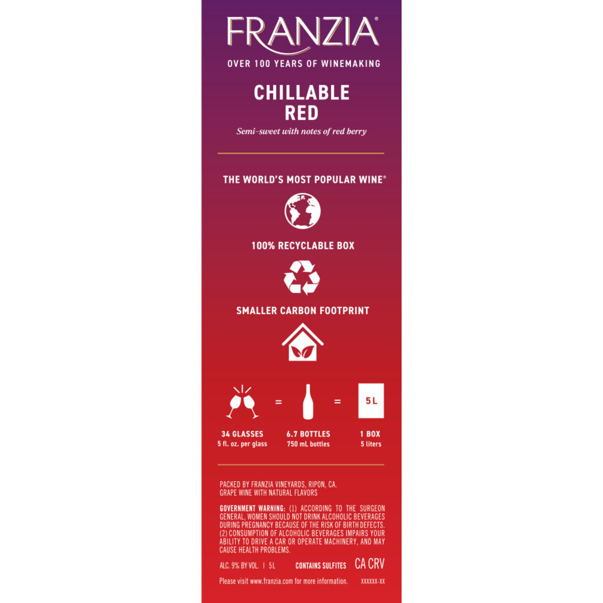 Franzia Chillable Red red wine is a light-bodied red wine with full red berry aromas. Chillable Red has more body and flavor than blush wine and is softer than traditional red wines. This Chillable Red pairs well with chicken and green salad and is ideal for enjoying on warm summer nights. With an alcohol content of 9% ABV, it's perfect for casual gatherings or relaxed evenings. The wine stays fresh for up to 6 weeks after opening, making it convenient for any occasion. Franzia has a rich history of producing quality wines since 1906. For a limited time, packaging may vary.
