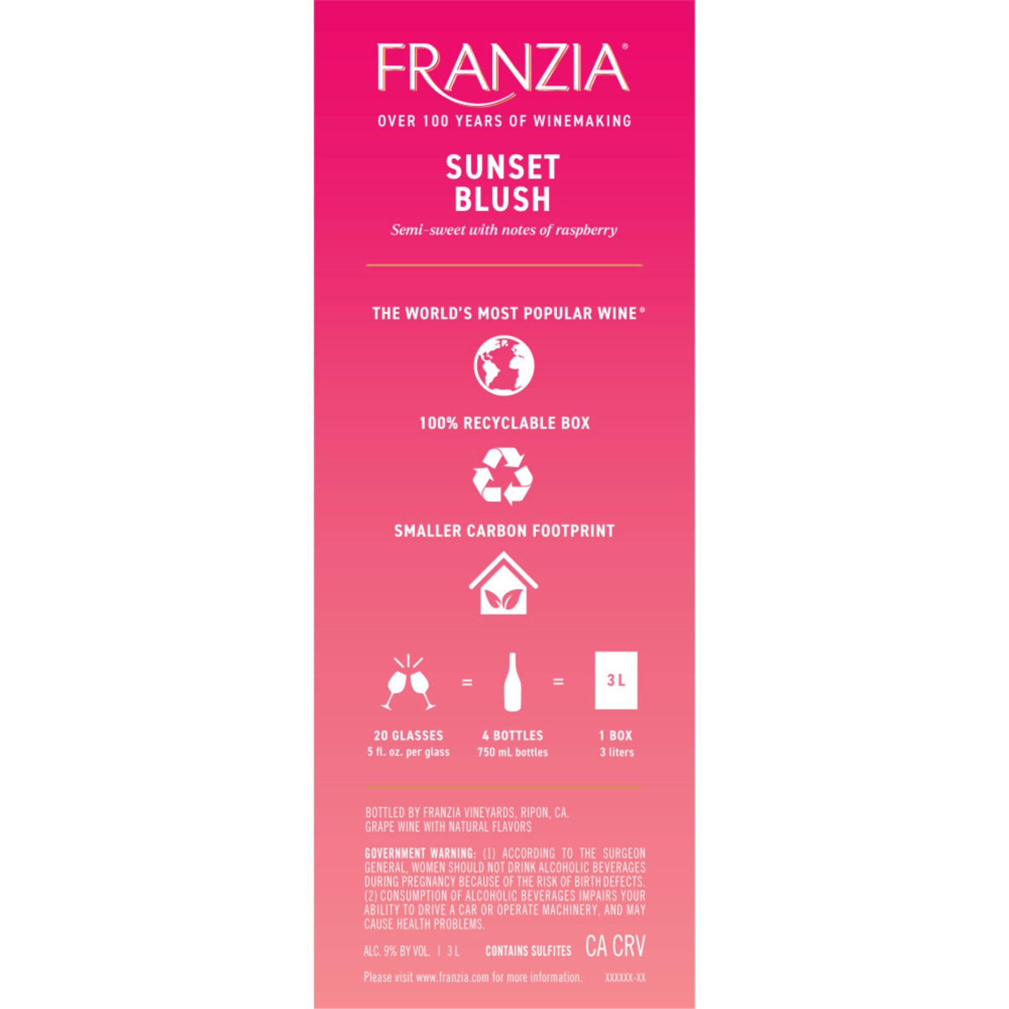 Franzia Sunset Blush Pink Wine is a delightful semi-sweet and refreshing wine with red berry flavors. This light-bodied pink wine from the American appellation is perfect for pairing with pork and fresh fruit. With a 9% alcohol by volume (ABV), it offers a pleasurable drinking experience. Ideal for social gatherings, each 3L box serves up to 20 five-ounce glasses of wine. Store it in a refrigerator or a cool, dry place and serve chilled to enjoy its full flavors. Franzia Sunset Blush pink wine stays fresh for up to six weeks after opening, making it a convenient choice. For a limited time, packaging may vary.