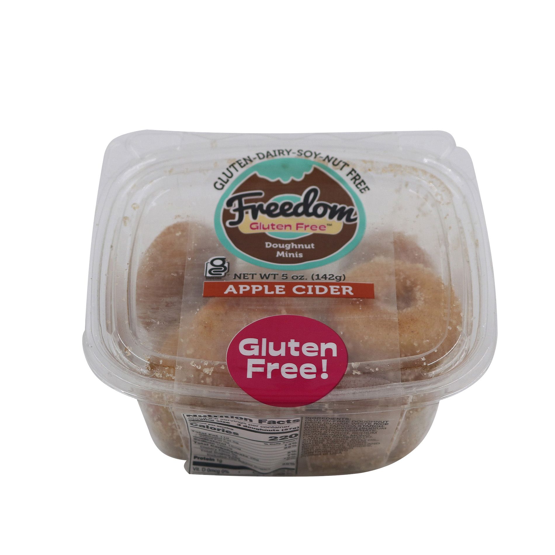 Freedom Gluten-Free Apple Cider Mini Donuts are soft, sugar-coated, and packed with cozy apple cider flavor. Each handcrafted donut delivers the warm, spiced taste of apple cider in every nostalgic, satisfying bite. Made without gluten, these donuts offer all the joy of a classic donut shop experience—just in a feel-good, allergen-friendly form. Made in a dedicated gluten-free and allergen-controlled facility, these donuts are free from wheat, milk, soy, peanuts, tree nuts, sesame, shellfish, and seafood—so you can indulge with confidence. Perfect for snacking, sharing, or treating yourself to a sweet moment anytime.