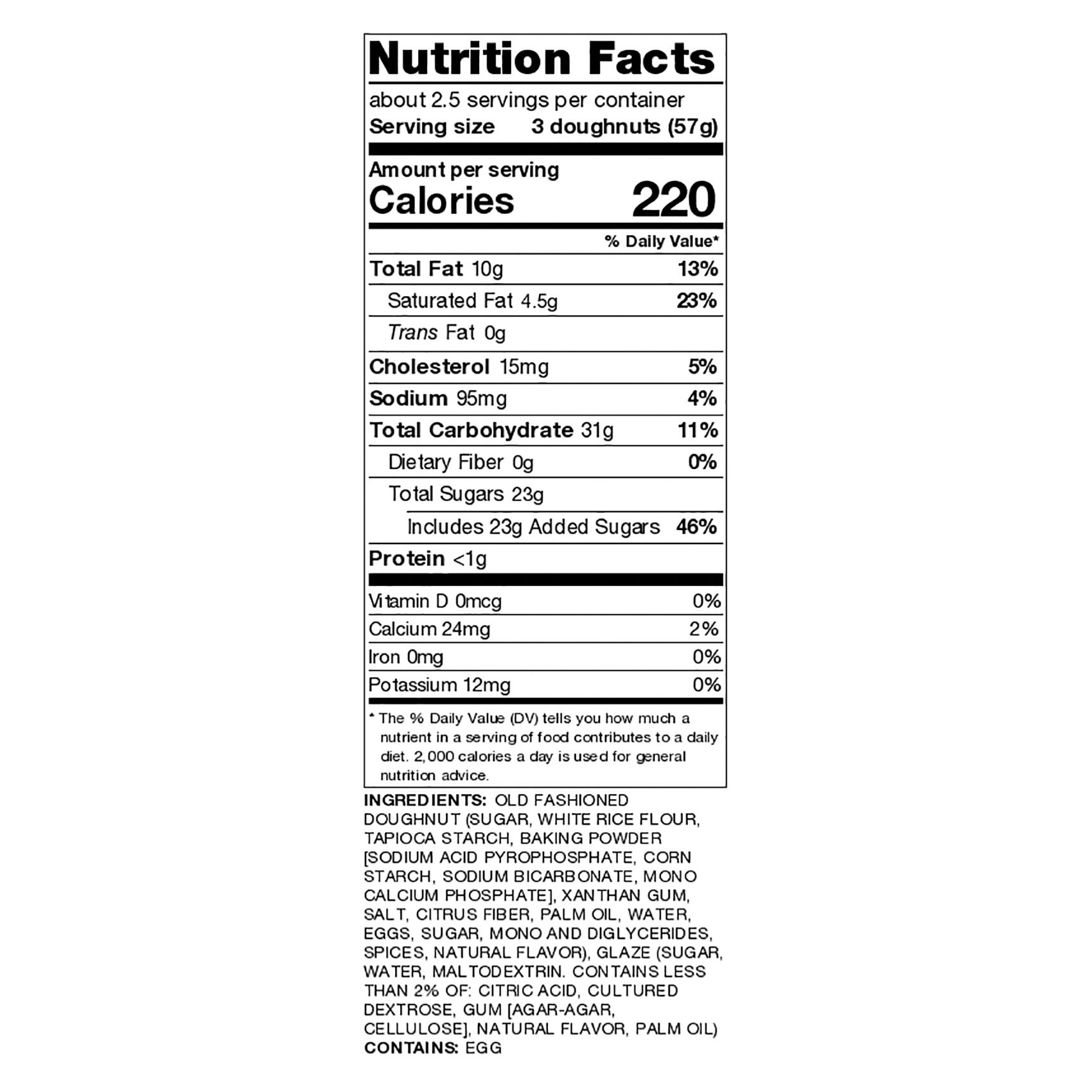 Ingredients: Old Fashioned Doughnut (Sugar, White Rice Flour, Tapioca Starch, Baking Powder [Sodium Acid Pyrophosphate, Corn Starch, Sodium Bicarbonate, Mono Calcium Phosphate], Xanthan Gum, Salt, Citrus Fiber, Palm Oil, Water, Eggs, Sugar, Mono And Diglycerides, Spices, Natural Flavor), Glaze (Sugar, Water, Maltodextrin. Contains Less Than 2% Of: Citric Acid, Cultured Dextrose, Gum [Agar-agar, Cellulose], Natural Flavor, Palm Oil). Contains: Eggs