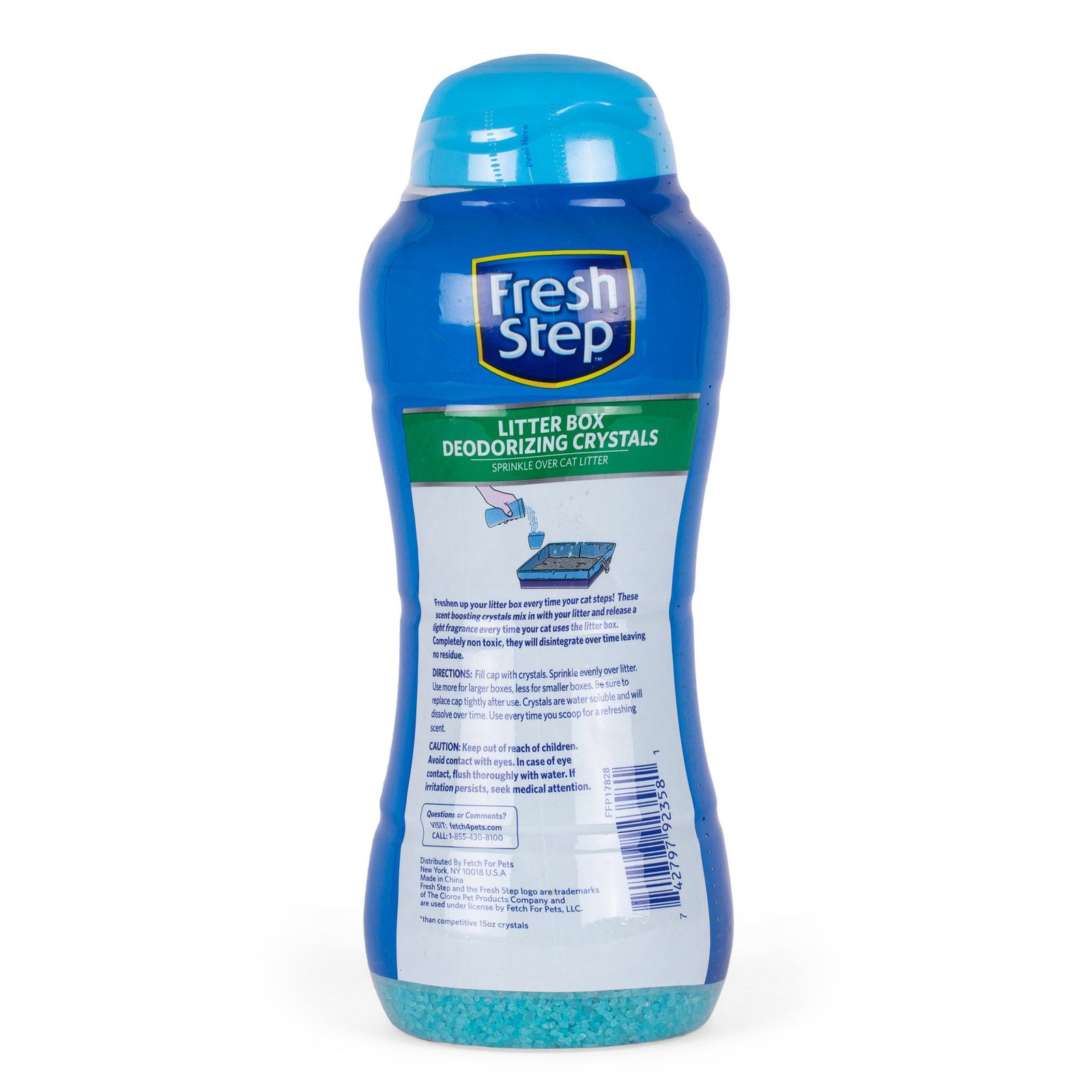 Fresh Step is a brand committed to making the world a more welcoming place for feline friends and their owners. When a cat has found his rightful place in your home, no matter how he got there, Fresh Step is here to step in and ensure that your house still smells like you, and not your new four-legged companion. Keeping your cat's litter box and surrounding area clean is necessary for the health and wellness of the home. It's this rationale that drove the development of the Fresh Step litter box products. With clever design and innovation, kitty cleanup just got easier. Fresh Step Litter Box Scent Crystals are a convenient and clean way to maintain your kitty litter box. Litter crystals are the perfect addition to any litter box and are sure to make a difference in your cat pen. Litter box crystals are a necessary component in keeping a clean pet environment; they work as a litter box deodorizer to create a wonderfully fresh and hygienic litter box. These cat litter crystals will ensure that your litter box always smells fresh. Every time your cat steps, the crystals will activate, acting as a cat litter deodorizer. The Fresh Step crystals come in a Fresh scent, so your cat's litter box area will have that clean smell. This litter box odor eliminator is non-toxic and safe and pet-friendly, so you do not have to worry about exposing your kitty to chemicals. Plus, the litter crystals are water-soluble, so they disintegrate over time, leaving no residue or mess. With Fresh Step litter box scent crystals, your guests will feel welcome in your home. To use Fresh Step cat litter crystals, fill the cap with crystals, and sprinkle them evenly over the litter. Use more for larger boxes and less for smaller boxes. Use every time you scoop for a refreshing scent. Caution: Keep out of reach of children. Avoid contact with eyes. In case of eye contact, flush thoroughly with water. If irritation persists, seek medical attention.