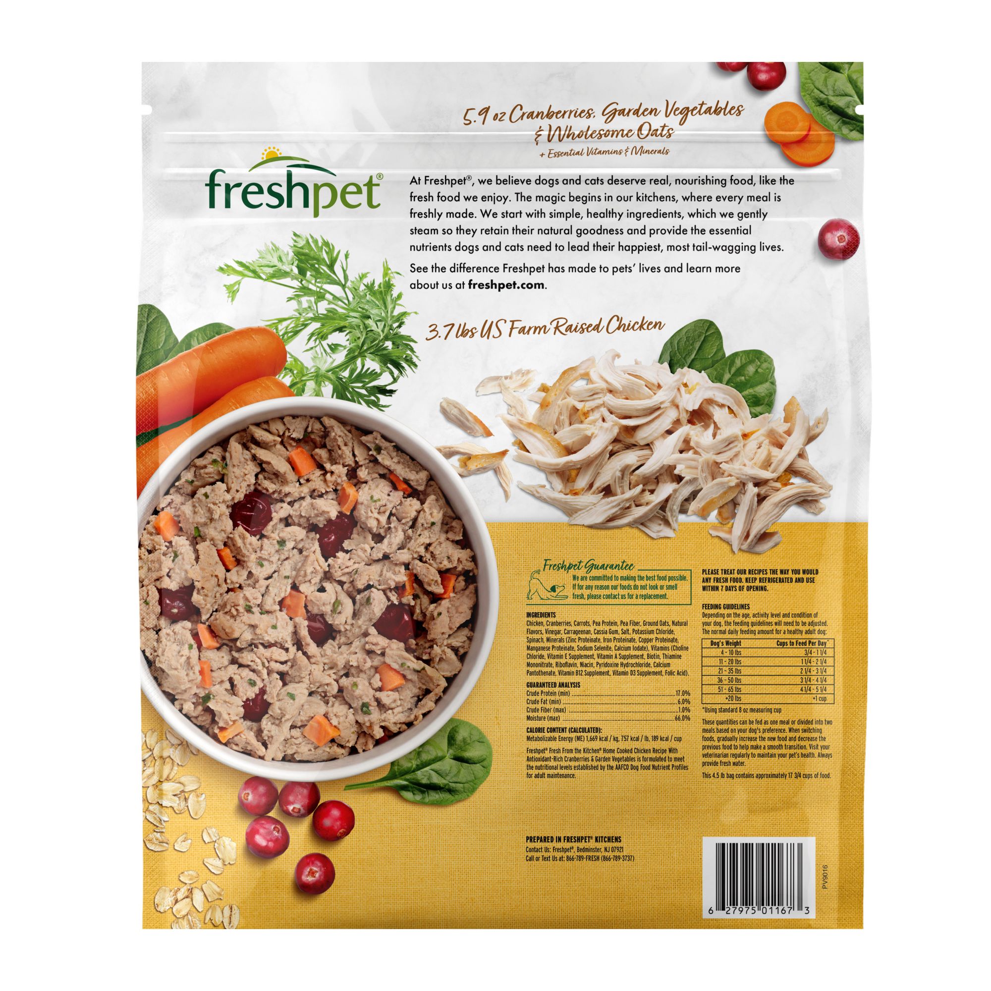 Fresh from Freshpet's Kitchens with locally sourced shredded chicken and essential vitamins from carrots, spinach, and antioxidant-rich cranberries. Now you can easily provide the love of a homemade, high-protein, fresh meal to your dog in a convenient resealable bag.