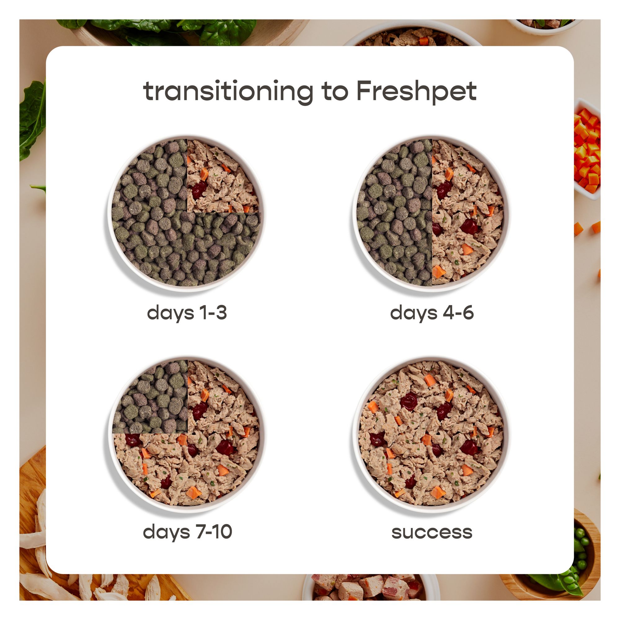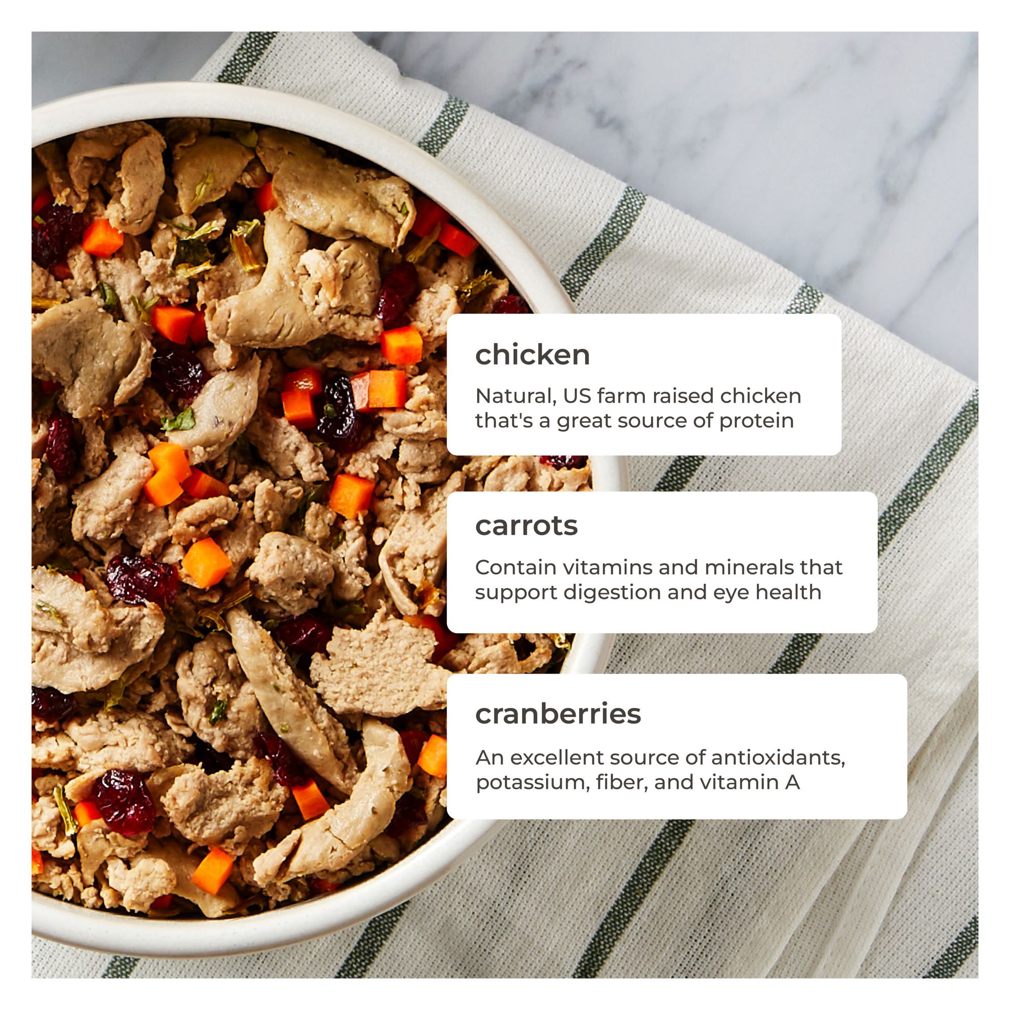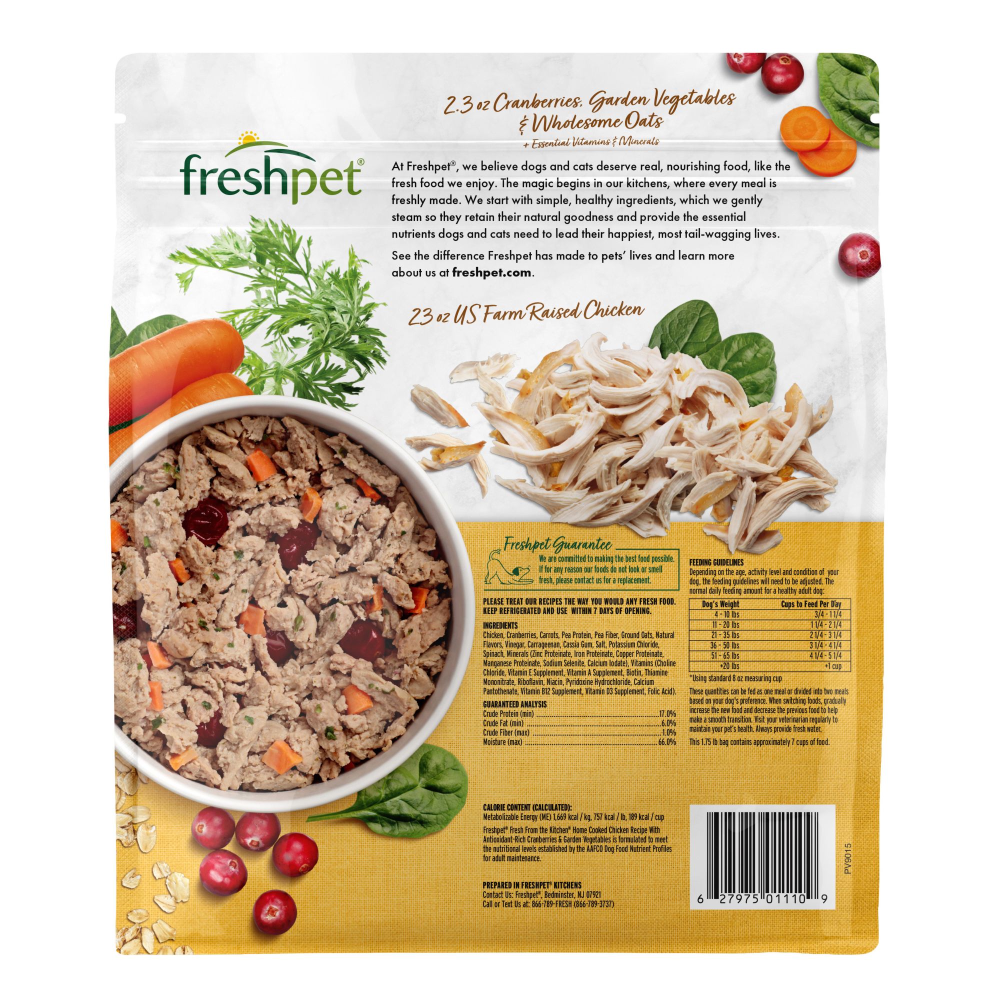 Fresh from Freshpet's Kitchens with locally sourced shredded chicken and essential vitamins from carrots, spinach, and antioxidant-rich cranberries. Now you can easily provide the love of a homemade, high-protein, fresh meal to your dog in a convenient resealable bag.