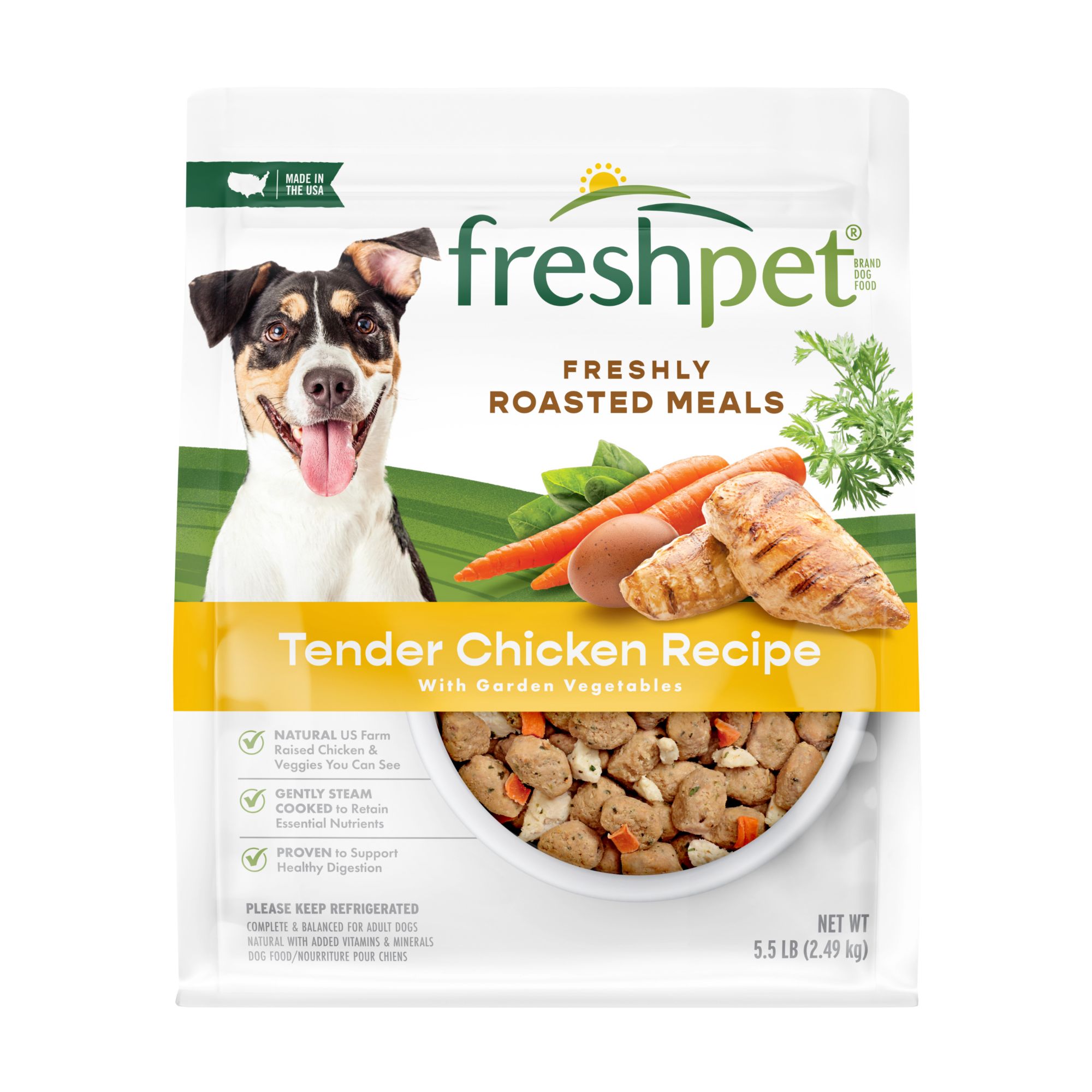 Freshpet tender chicken recipe with garden vegetables includes gently steamed pieces of fresh natural chicken, accented with vitamin-rich carrots and high fiber spinach. This delicious recipe comes in a convenient resealable bag. Freshpet Freshly Roasted Meals are the next best thing to a homemade meal that is healthy for your dog.