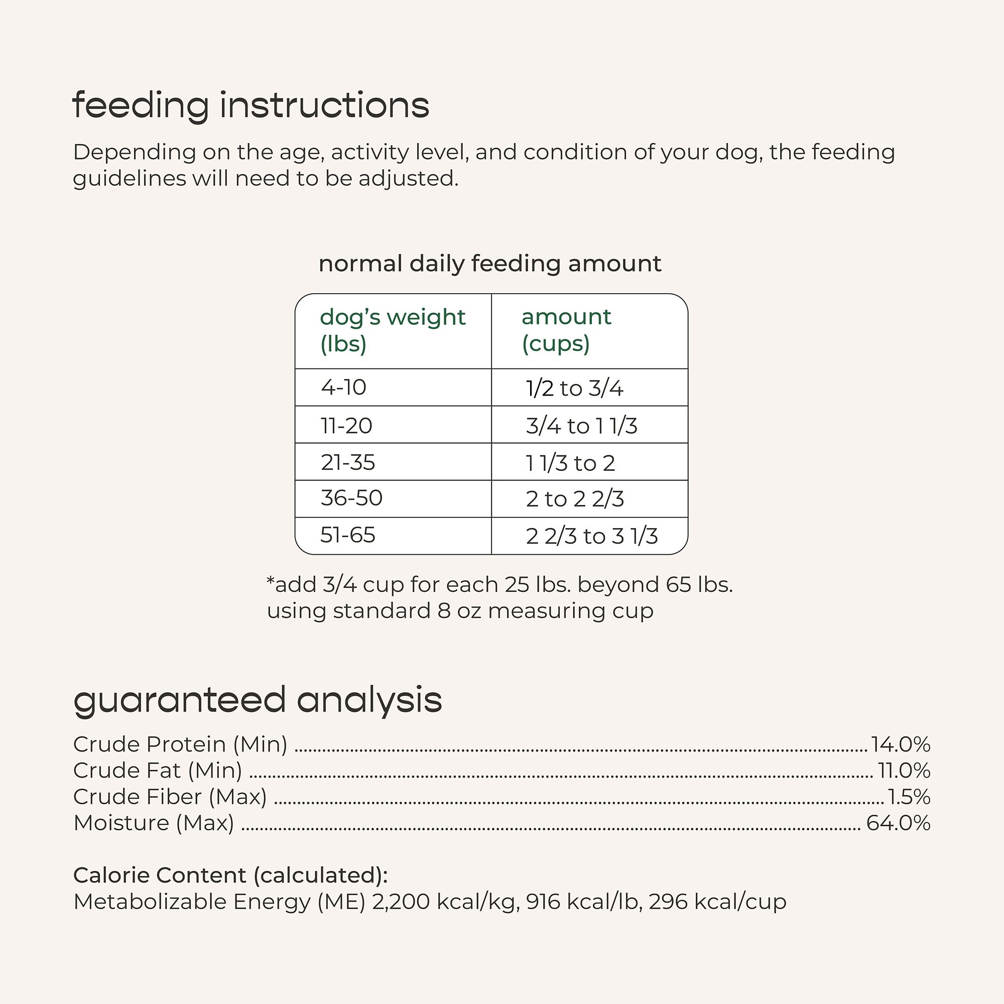 | Ingredients | Chicken, Ground Oats, Chicken Liver, Rice Bran, Eggs, Carrots, Natural Flavors, Spinach, Salt, Vinegar, Beta-Carotene, Minerals (Zinc Proteinate, Iron Proteinate, Manganese Proteinate, Copper Proteinate, Sodium Selenite, Calcium Iodate), Vitamins (Choli |