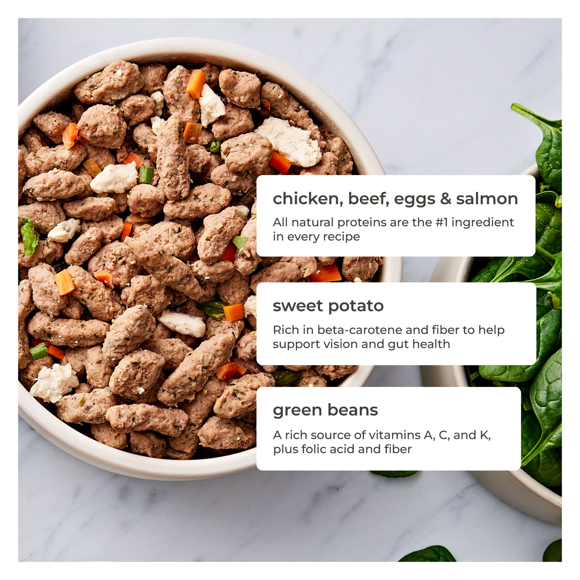 Chicken, Beef, Beef Liver, Eggs, Ground Oats, Salmon, Rice Bran, Sweet Potatoes, Carrots, Green Beans, Natural Flavors, Pea Fiber, Spinach, Salt, Vinegar, Minerals (Zinc Proteinate, Iron Proteinate, Copper Proteinate, Manganese Proteinate, Sodium Selenite, Calcium Iodate), Vitamins (Choline Chloride, Vitamin E Supplement, Riboflavin, Biotin, Calcium Pantothenate, Niacin, Thiamine Mononitrate, Vitamin B12 Supplement, Pyridoxine Hydrochloride, Folic Acid), Celery Powder.