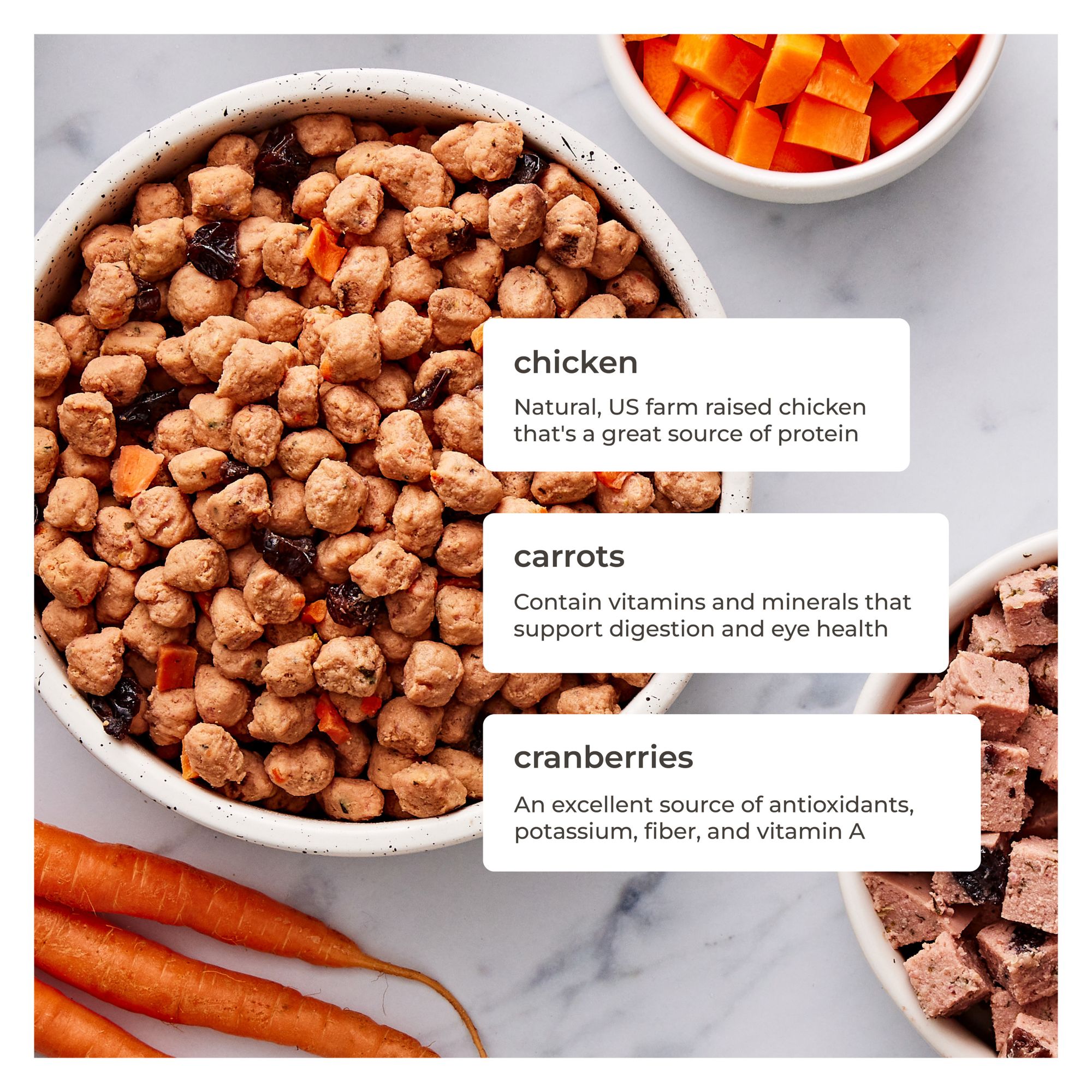 Chicken, Chicken Liver, Carrots, Pea Protein, Eggs, Cranberries, Natural Flavors, Pea Fiber, Vinegar, Minerals (Dicalcium Phosphate, Zinc Proteinate, Iron Proteinate, Manganese Proteinate, Copper Proteinate, Sodium Selenite, Calcium Iodate), Salt, Spinach, Potassium Chloride, Inulin, Fish Oil, Beta-Carotene, Celery Powder, Vitamins (Choline Chloride, Vitamin E Supplement, Niacin, Calcium Pantothenate, Biotin, Riboflavin, Thiamine Mononitrate, Vitamin B12 Supplement, Pyridoxine Hydrochloride, Folic Acid).
