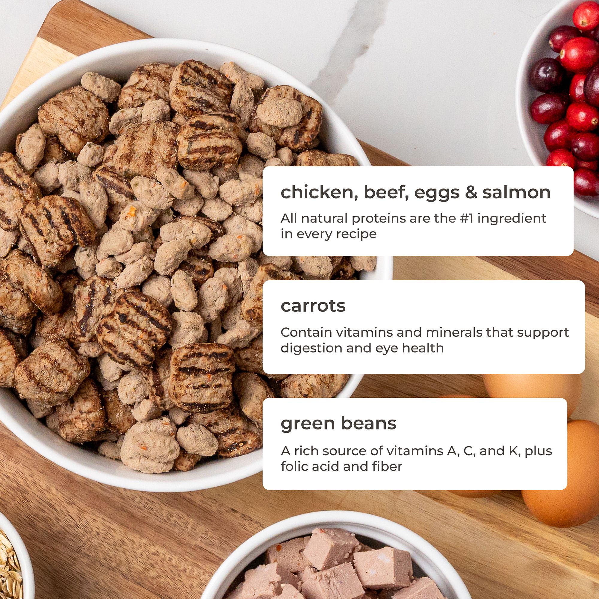 Ingredients: Chicken (Source of Glucosamine & Chondroitin Sulfate), Egg (Source of Glucosamine), Beef, Salmon, Beef Liver, Pea Protein, Carrots, Green Beans, Natural Flavors, Fish Oil, Vinegar, Salt, Potassium Chloride, Taurine, Minerals (Zinc Proteinate, Iron Proteinate, Copper Proteinate, Manganese Proteinate, Sodium Selenite, Calcium Lodate), Vitamins (Choline Chloride, Vitamin E Supplement, Riboflavin, Biotin, Calcium Pantothenate, Niacin, Thiamine Mononitrate, Vitamin B12 Supplement, Pyridoxine Hydrochloride, Folic Acid), Celery Powder, Rosemary.