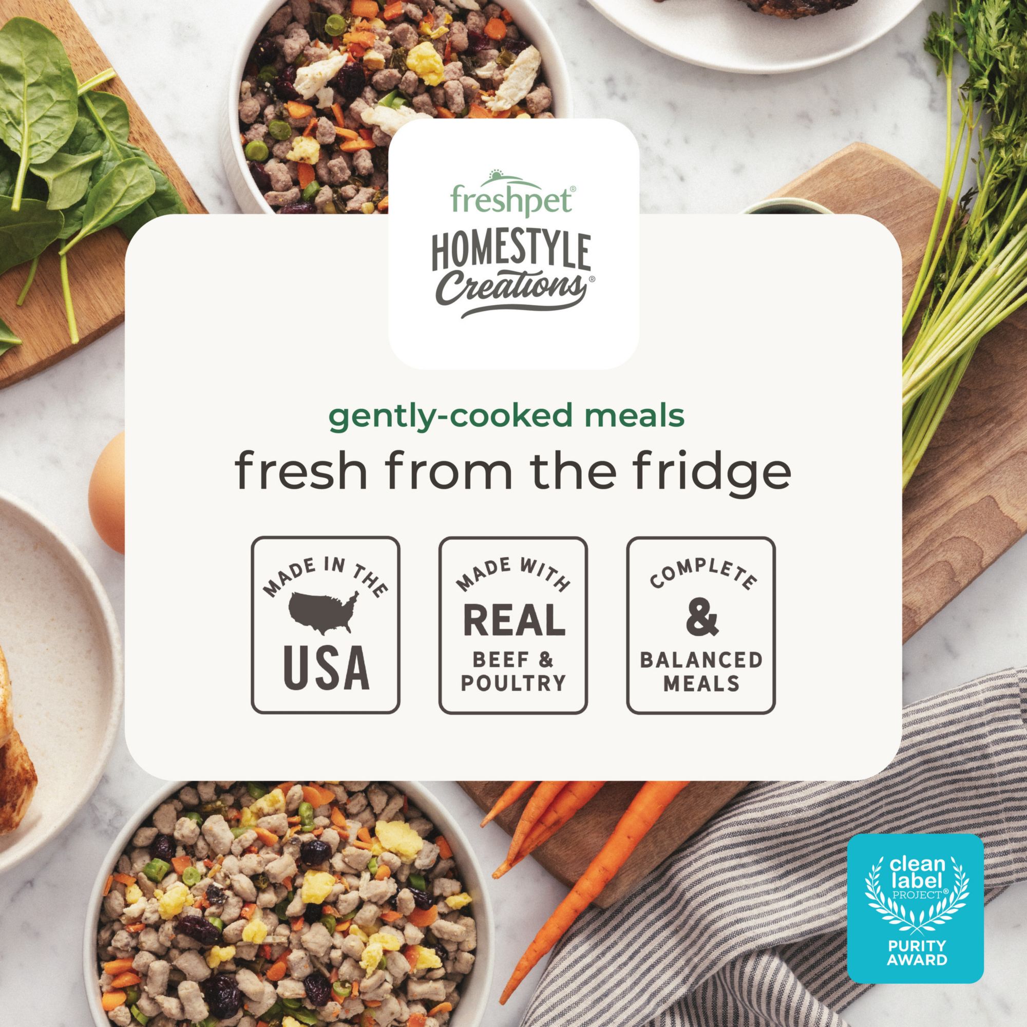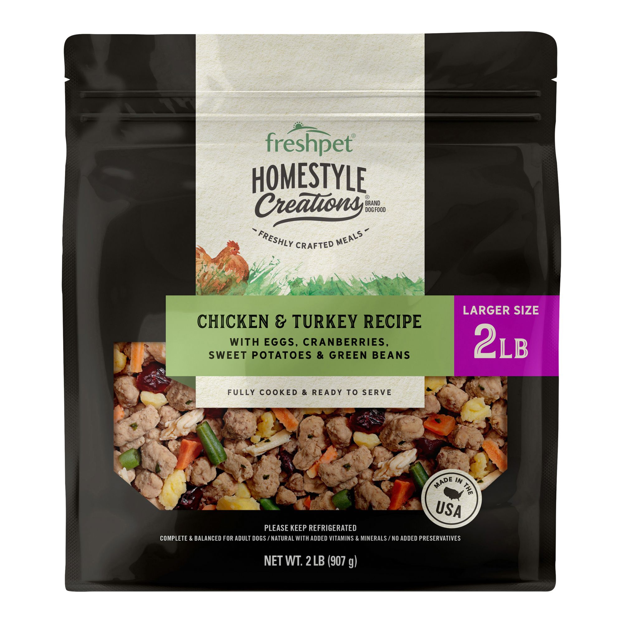 Your favorite meal now available in a larger size! A freshly crafted meal made with real ground chicken & turkey with an anti-oxidantrich medley of fruit and vegetables, including cranberries, sweet potatoes, carrots and green beans. With Homestyle Creations, feeding a freshly crafted meal to your dog has never been easier. Freshpet sources natural proteins and vitamin-rich fruit & vegetables and gently cooks them in small batches to create complete & balanced recipes your dog will love.