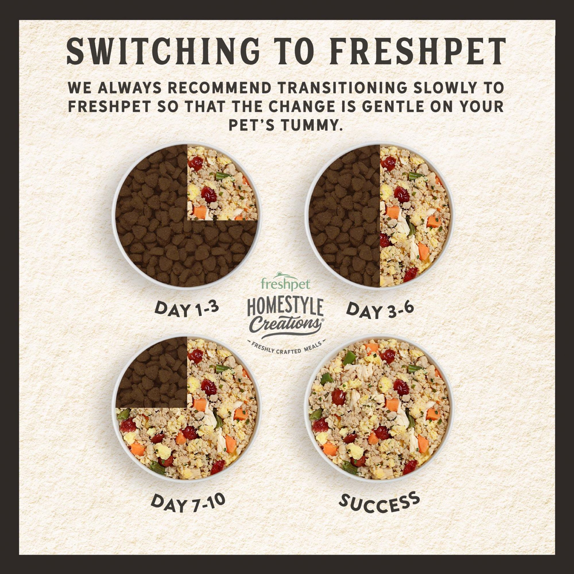 Your favorite meal now available in a larger size! A freshly crafted meal made with real ground chicken & turkey with an anti-oxidantrich medley of fruit and vegetables, including cranberries, sweet potatoes, carrots and green beans. With Homestyle Creations, feeding a freshly crafted meal to your dog has never been easier. Freshpet sources natural proteins and vitamin-rich fruit & vegetables and gently cooks them in small batches to create complete & balanced recipes your dog will love.