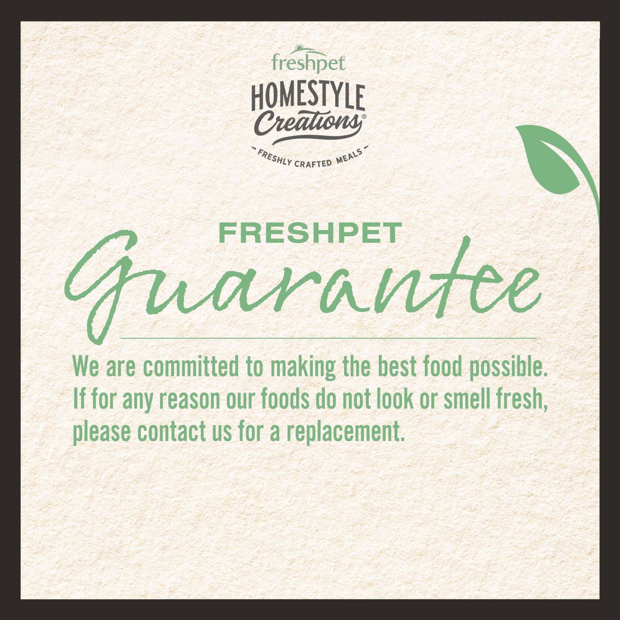 Freshpet Guarantee: Freshpet is committed to making the freshest food possible. If for any reason your foods do not look or smell fresh, please contact them for a replacement.