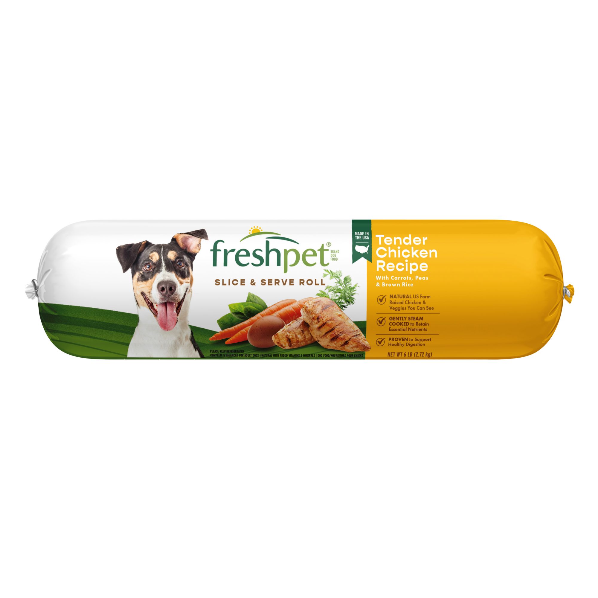 Gently steamed with fresh natural chicken, vitamin-rich peas & carrots, and high fiber brown rice, this recipe comes in a slice-and-serve roll. This is the next best thing to a homemade meal that is healthy for your dog. At Freshpet, we believe dogs and cats deserve real, nourishing food, like the fresh food we enjoy. The magic begins in our kitchens, where every meal is freshly made. We start with simple, healthy ingredients, which we gently steam so they retain their natural goodness and provide the essential nutrients dogs and cats need to lead their happiest, most tail-wagging lives.
