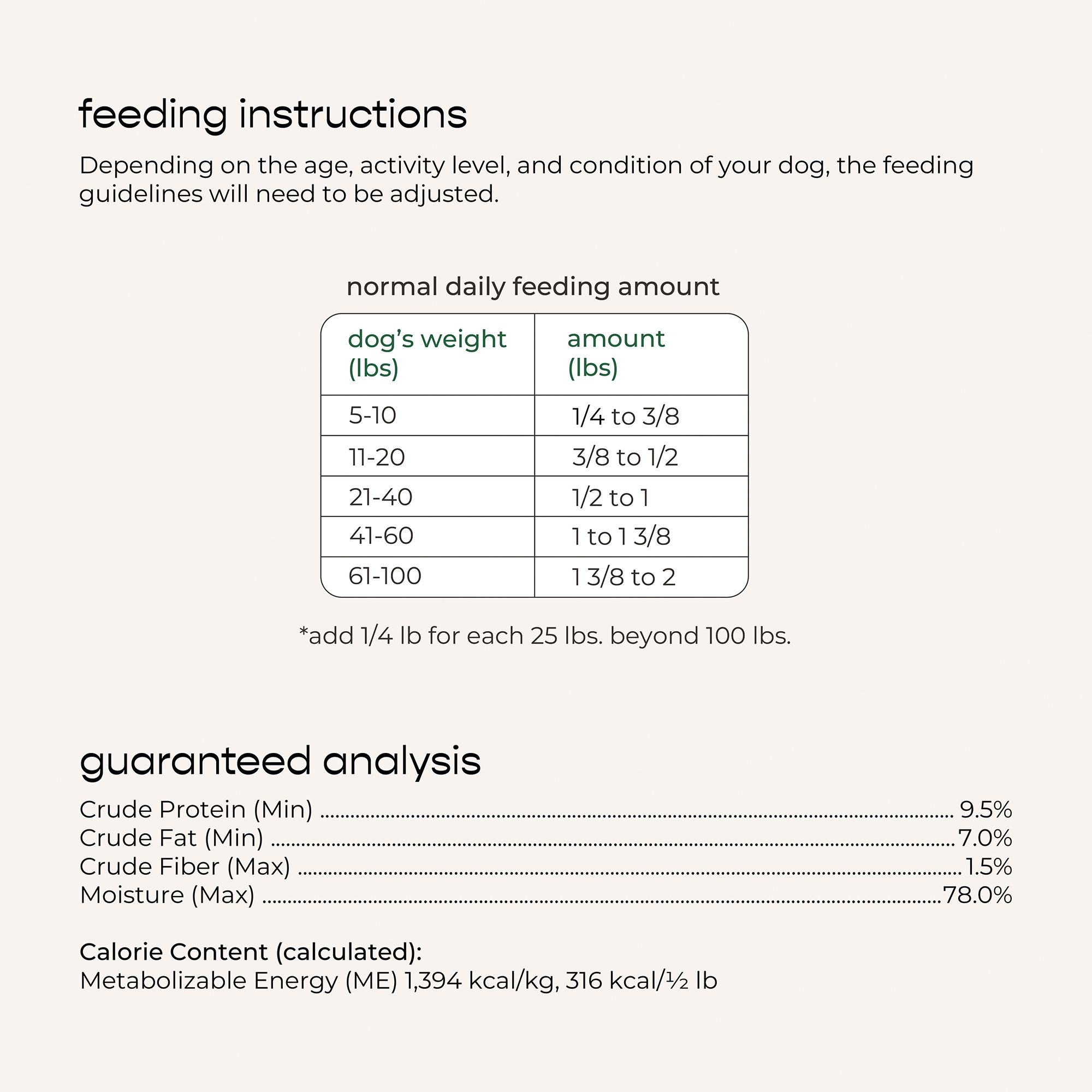 Ingredients: Chicken, Carrots, Chicken Broth, Peas, Egg, Chicken Liver, Brown Rice, Rice Bran, Carrageenan, Natural Flavors, Potassium Chloride, Celery Powder, Minerals (Zinc Proteinate, Iron Proteinate, Copper Proteinate, Manganese Proteinate, Sodium Selenite, Calcium Iodate), Salt, Vitamins (Choline Chloride, Vitamin E Supplement, Riboflavin, Biotin, Calcium Pantothenate, Niacin, Thiamine Mononitrate, Vitamin B12 Supplement, Pyridoxine Hydrochloride, Folic Acid), Spinach.