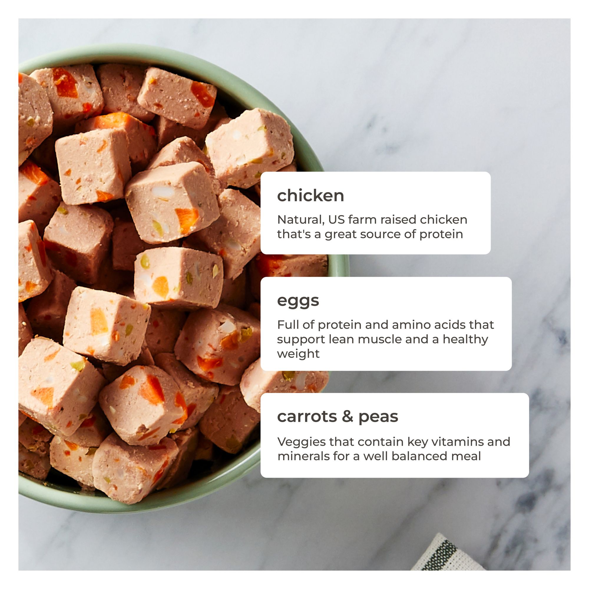 Gently steamed with fresh natural chicken, vitamin-rich peas & carrots, and high fiber brown rice, this recipe comes in a slice-and-serve roll. This is the next best thing to a homemade meal that is healthy for your dog. At Freshpet, we believe dogs and cats deserve real, nourishing food, like the fresh food we enjoy. The magic begins in our kitchens, where every meal is freshly made. We start with simple, healthy ingredients, which we gently steam so they retain their natural goodness and provide the essential nutrients dogs and cats need to lead their happiest, most tail-wagging lives.