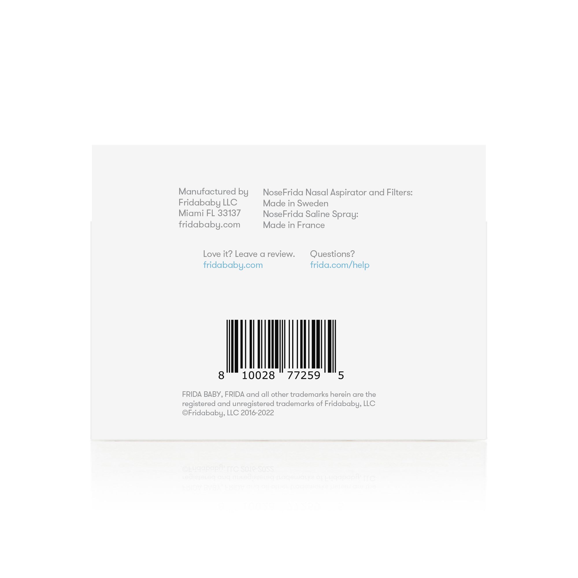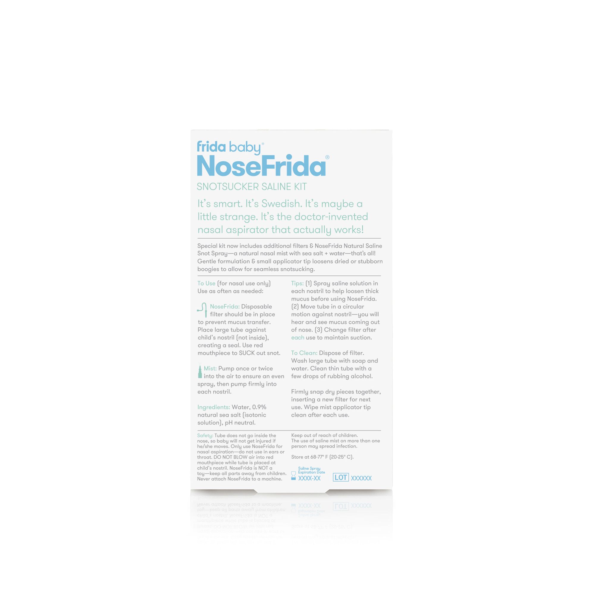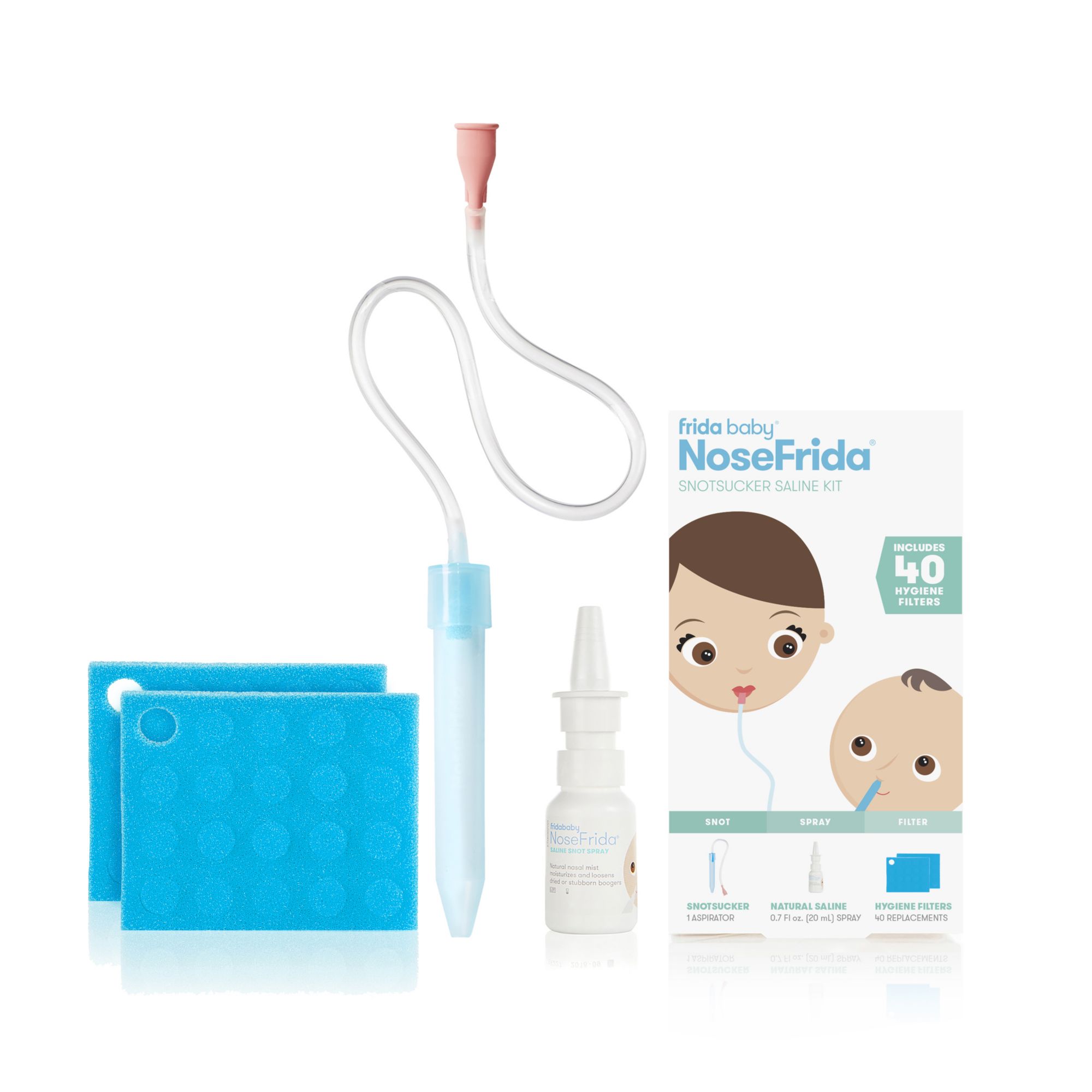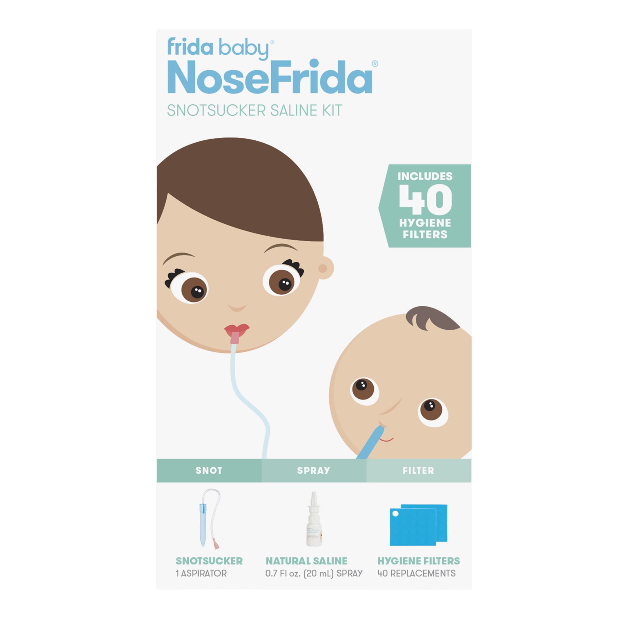 Frida is the solution-based brand that gets parents. This kit includes the SnotSucker nasal aspirator, the NoseFrida saline spray, and 40 disposable hygiene filters. The doctor-invented nasal aspirator is hygienic, comfortable and non-invasive, creating a seal with the outside of the baby's nostril for gentle snotsucking.