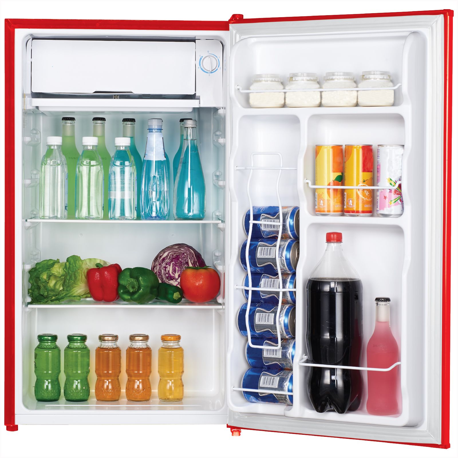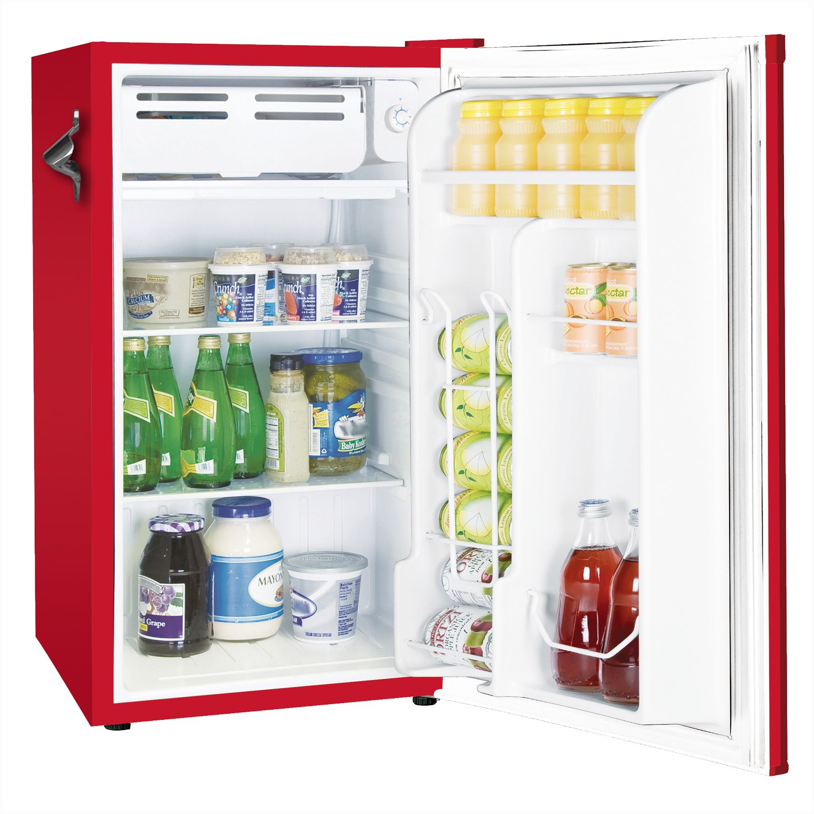Add this retro mini refrigerator to your bar. Complete with a 2L door basket, 3.2 cu. ft. of space and a bottle opener, this refrigerator is everything you need to complete your bar area.