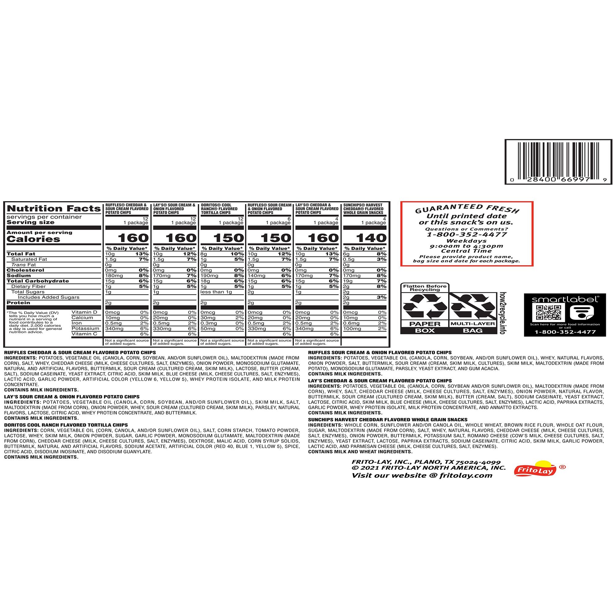 Ingredients: Ruffles Cheddar & Sour Cream Flavored Potato Chips: Potatoes, Vegetable Oil (Sunflower, Corn, and/or Canola Oil), Cheddar & Sour Cream Seasoning (Maltodextrin [Made from Corn], Salt, Whey, Cheddar Cheese [Milk, Cheese Cultures, Salt, Enzymes], Onion Powder, Corn Oil, Monosodium Glutamate, Natural and Artificial Flavor, Buttermilk, Canola Oil, Sour Cream [Cultured Cream, Skim Milk], Lactose, Butter [Cream, Salt], Sodium Caseinate, Yeast Extract, Citric Acid, Skim Milk, Blue Cheese [Milk, Cheese Cultures, Salt, Enzymes], Lactic Acid, Garlic Powder, Artificial Color [Including Yellow 6, Yellow 5], Whey Protein Isolate, Sunflower Oil, and Milk Protein Concentrate). Lay's Sour Cream & Onion Flavored Potato Chips: Potatoes, Vegetable Oil (Canola, Corn, Soybean, And/Or Sunflower Oil), Skim Milk, Salt, Whey, Onion Powder, Parsley, Sour Cream (Cultured Cream, Skim Milk), Dextrose, Maltodextrin (Made From Corn), Natural Flavors, Medium Chain Triglycerides, Lactose, And Citric Acid. Doritos Cool Ranch Flavored Potato Chips: Corn, Vegetable Oil (Corn, Canola, and/or Sunflower Oil), Salt, Corn Starch, Tomato Powder, Lactose, Whey, Skim Milk, Onion Powder, Sugar, Garlic Powder, Monosodium Glutamate, Maltodextrin (Made From Corn), Cheddar Cheese (Milk, Cheese Cultures, Salt, Enzymes), Dextrose, Malic Acid, Corn Syrup Solids, Buttermilk, Natural and Artificial Flavors, Sodium Acetate, Artificial Color (Red 40, Blue 1, Yellow 5), Spice, Citric Acid, Disodium Inosinate, and Disodium Guanylate. Ruffles Sour Cream & Onion Flavored Potato Chips: Potatoes, Vegetable Oil (Canola, Corn, Soybean, And/Or Sunflower Oil), Whey, Natural Flavors, Onion Powder, Salt, Buttermilk, Sour Cream (Cream, Skim Milk, Cultures), Skim Milk, Maltodextrin [Made From Potato], Monosodium Glutamate, Parsley, Yeast Extract, And Gum Acacia. Lay's Cheddar & Sour Cream Flavored Potato Chips: Potatoes, Vegetable Oil (Sunflower, Corn, and/or Canola Oil), Cheddar & Sour Cream Seasoning (Maltodextrin [Made From Corn], Whey, Salt, Cheddar Cheese [Milk, Cheese Cultures, Salt, Enzymes], Onion Powder, Corn Oil, Natural Flavor, Canola Oil, Buttermilk, Sour Cream [Cultured Cream, Skim Milk], Butter [Cream, Salt], Sodium Caseinate, Yeast Extract, Lactose, Citric Acid, Skim Milk, Blue Cheese [Milk, Cheese Cultures, Salt, Enzymes], Lactic Acid, Paprika Extracts, Garlic Powder, Whey Protein Isolate, Milk Protein Concentrate, Annatto Extracts, and Sunflower Oil). SunChips Harvest Cheddar Flavored Whole Grain Snacks: Whole Corn, Sunflower And/Or Canola Oil, Whole Wheat, Brown Rice Flour, Whole Oat Flour, Sugar, Maltodextrin (Made From Corn), Salt, Whey, Natural Flavors, Cheddar Cheese (Milk, Cheese Cultures, Salt, Enzymes), Onion Powder, Buttermilk, Potassium Chloride, Romano Cheese (Cow'S Milk, Cheese Cultures, Salt, Enzymes), Yeast Extract, Lactose, Paprika Extracts, Sodium Caseinate, Citric Acid, Skim Milk, Garlic Powder, Lactic Acid, And Parmesan Cheese (Milk, Cheese Cultures, Salt, Enzymes).