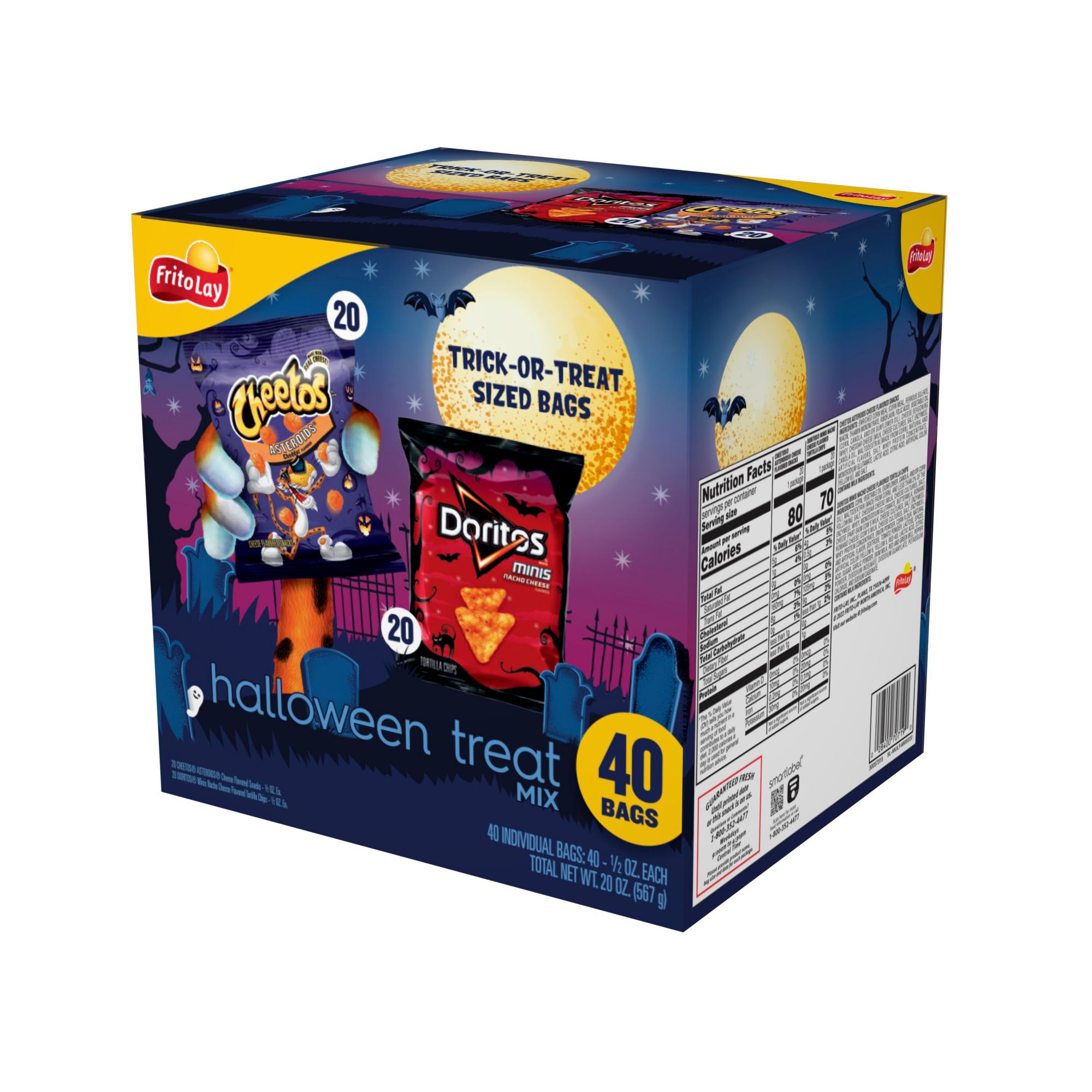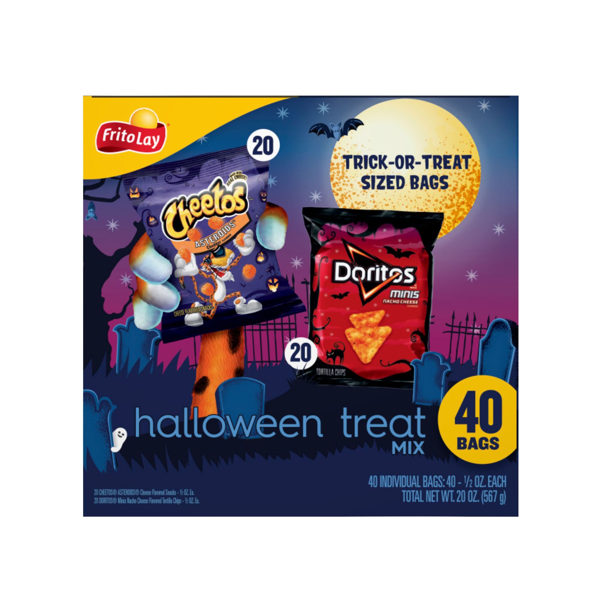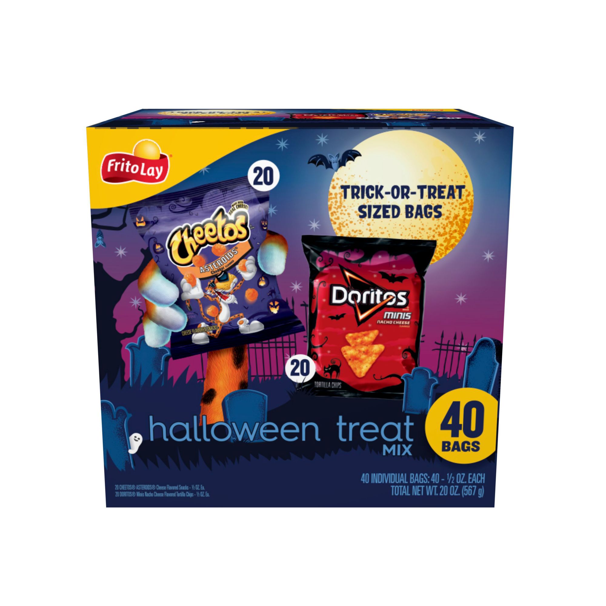 40 bags of snacks in one convenient pack - perfect for giving out as Halloween trick or treat snacks Includes 20 bags of cheetos asteroids cheese snacks and 20 bags of doritos mini nacho cheese flavored tortilla chips Spooky Halloween packaging Available for a limited time only