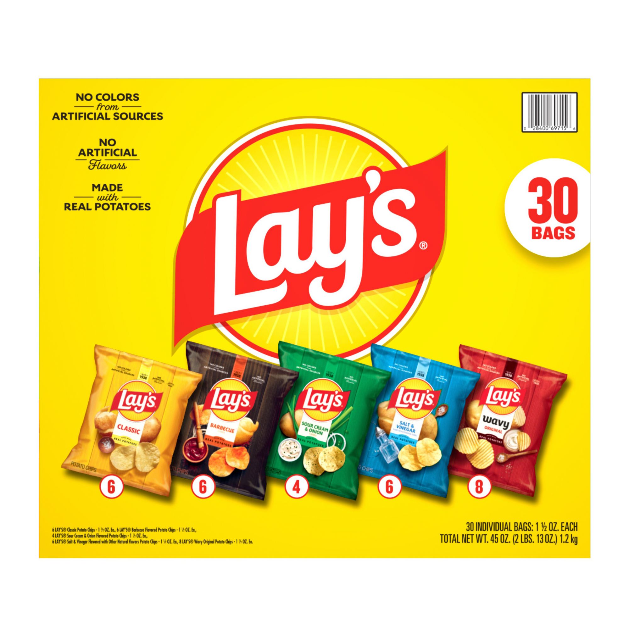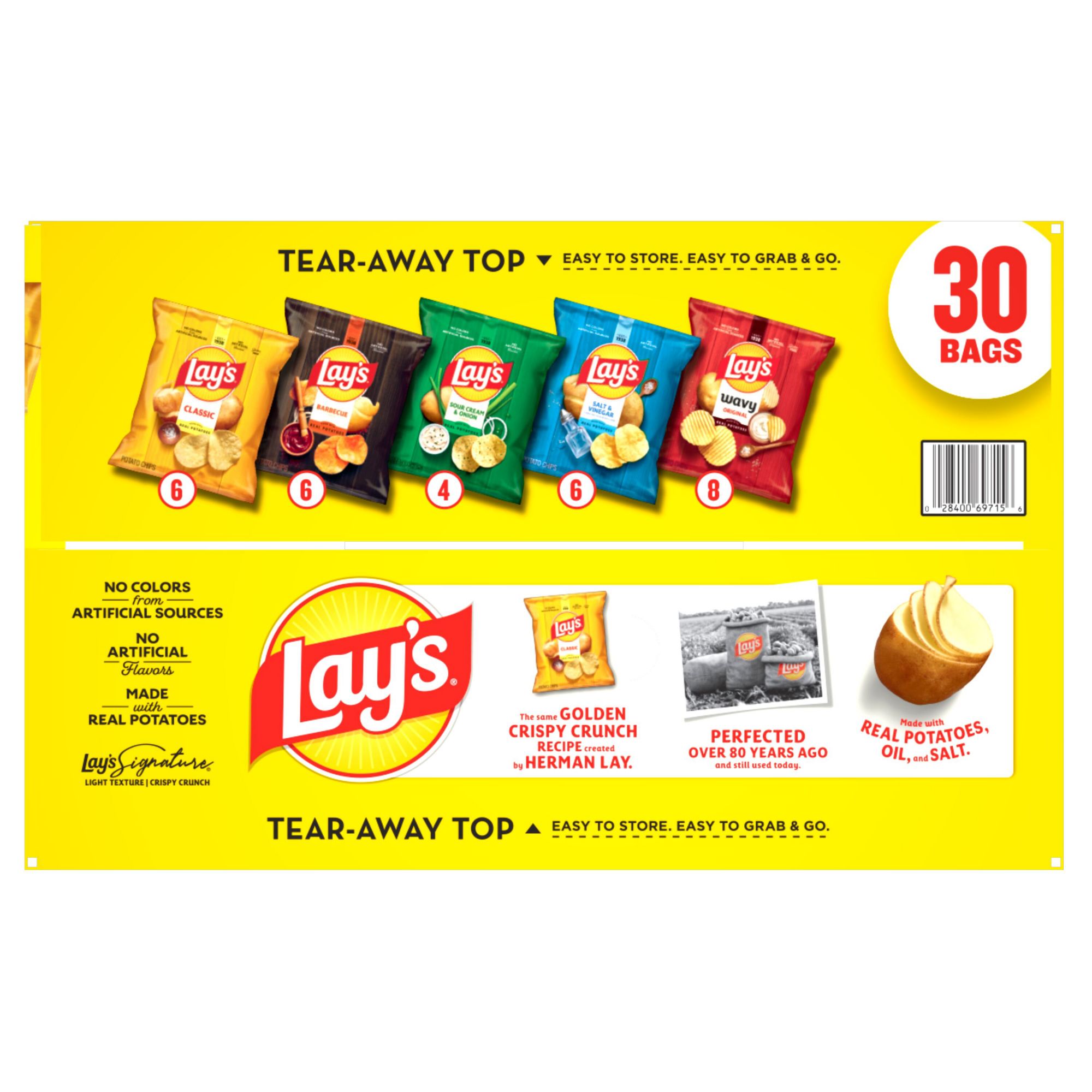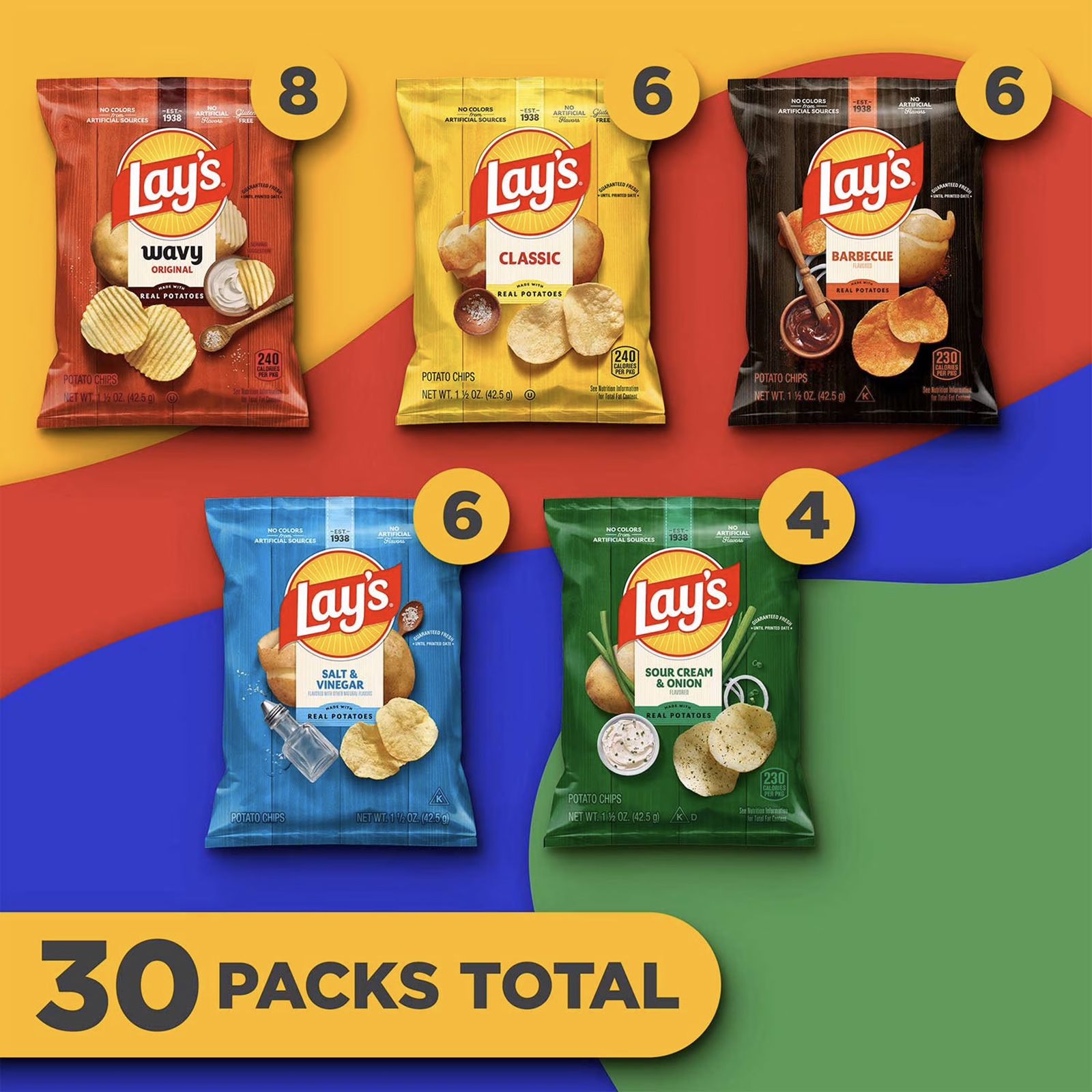 30 bags of snacks in one convenient pack Variety pack lets you choose your favorite - there's something for everyone Single-serve packs help with portion control Includes six bags Lay's salt and vinegar flavored potato chips, eight bags Lay's wavy original potato chips, six bags of Lay's classic potato chips, six bags of Lay's barbecue flavored potato chips, four bags of Lay's sour cream, and onion flavored potato chips