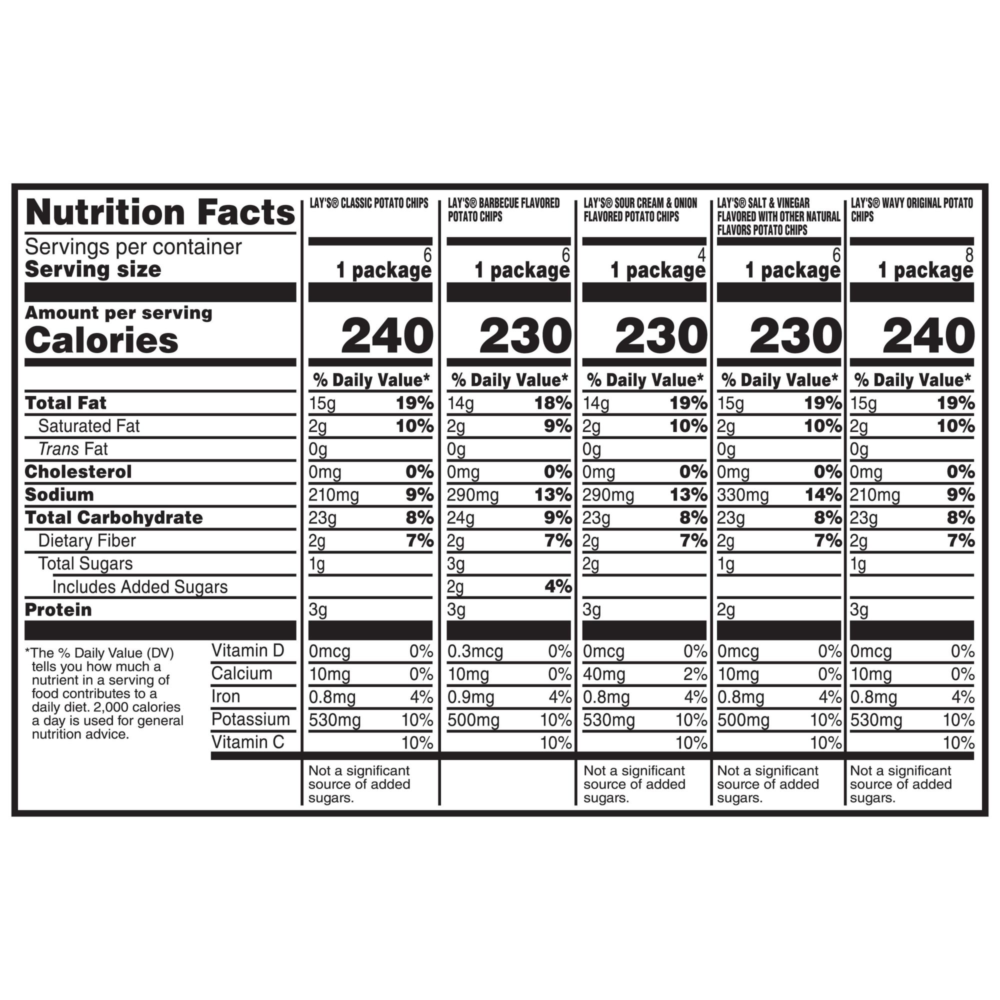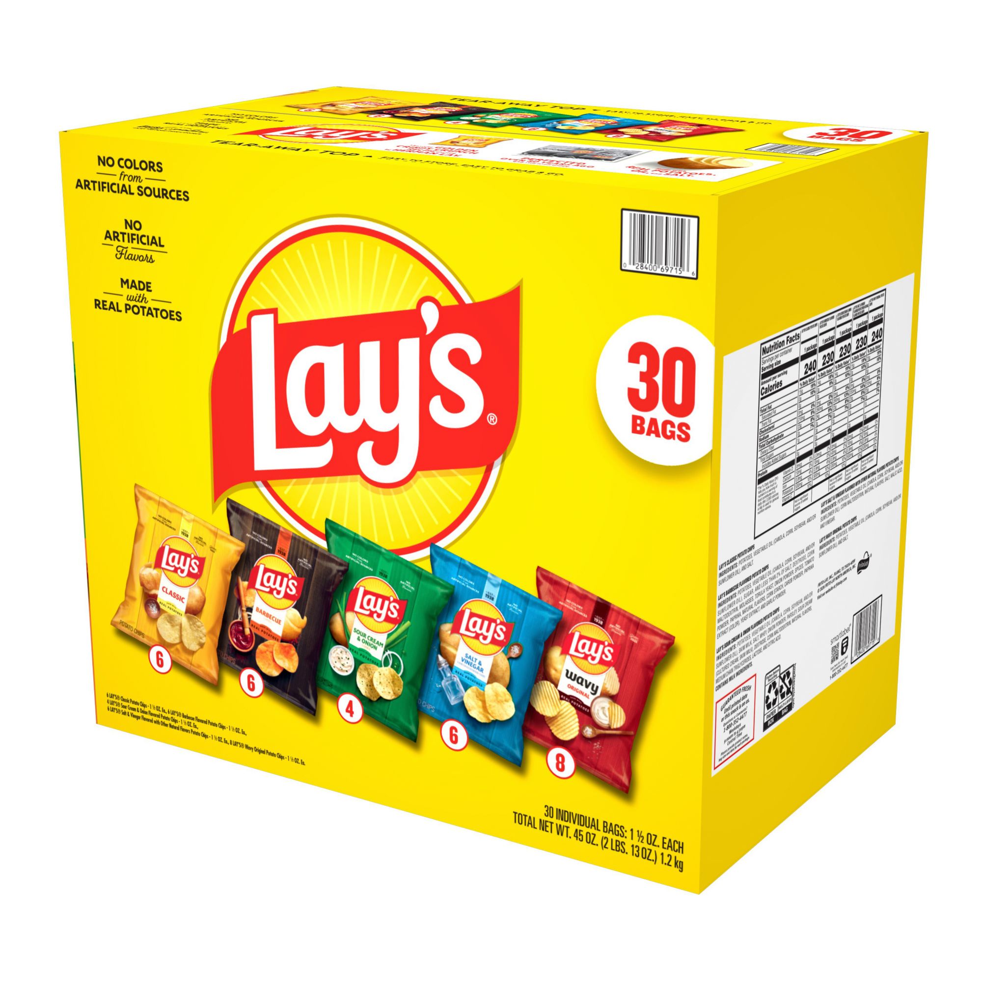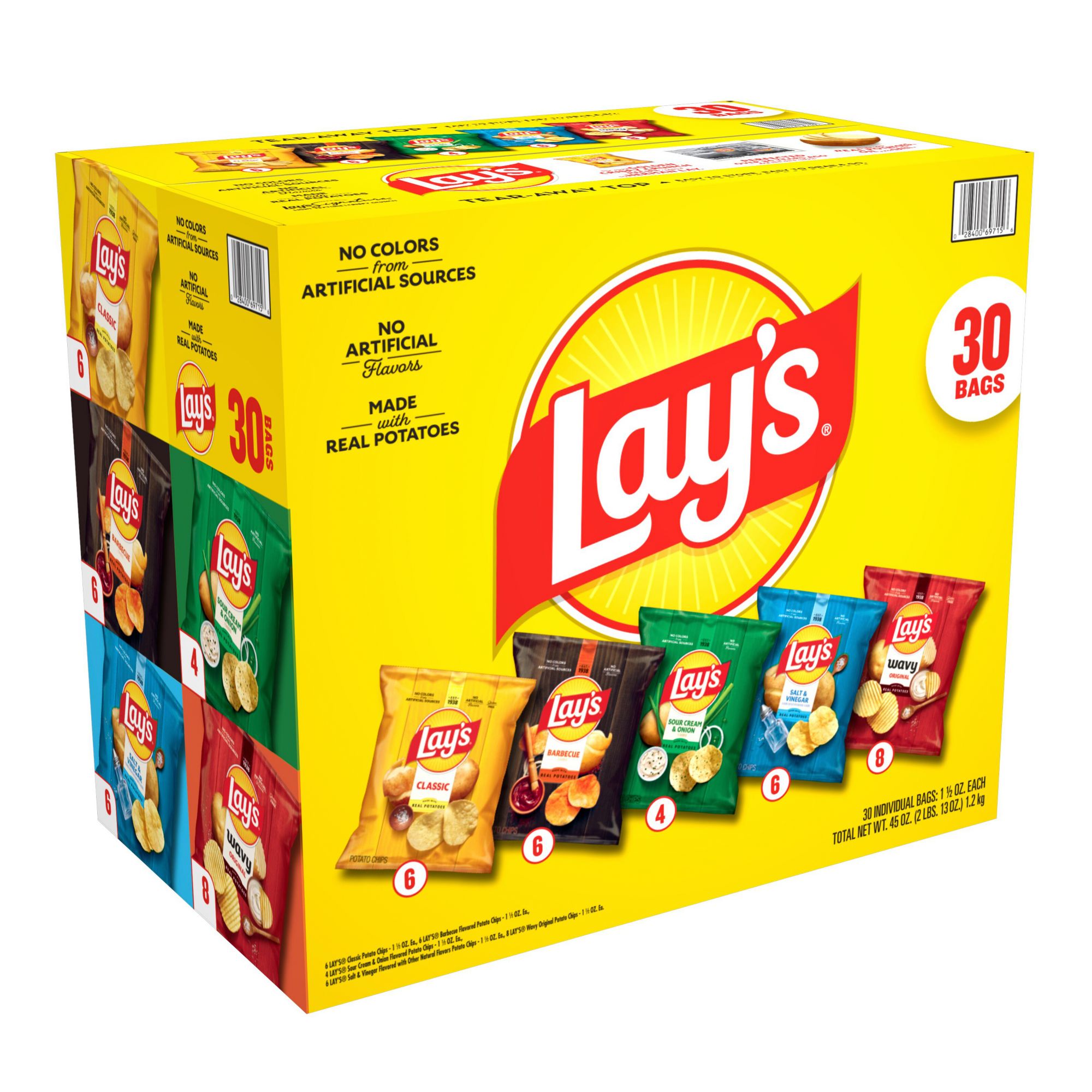 30 bags of snacks in one convenient pack Variety pack lets you choose your favorite - there's something for everyone Single-serve packs help with portion control Includes six bags Lay's salt and vinegar flavored potato chips, eight bags Lay's wavy original potato chips, six bags of Lay's classic potato chips, six bags of Lay's barbecue flavored potato chips, four bags of Lay's sour cream, and onion flavored potato chips