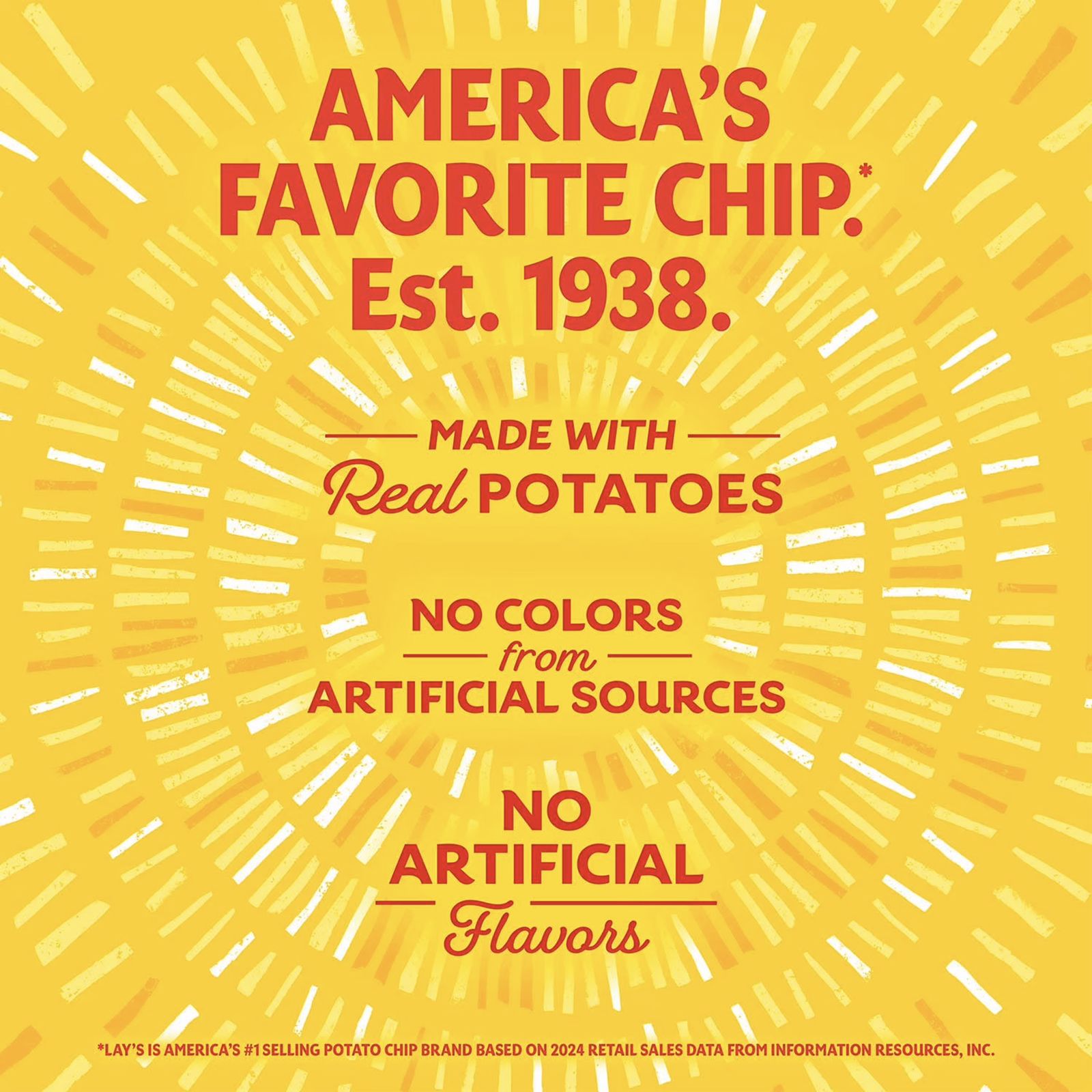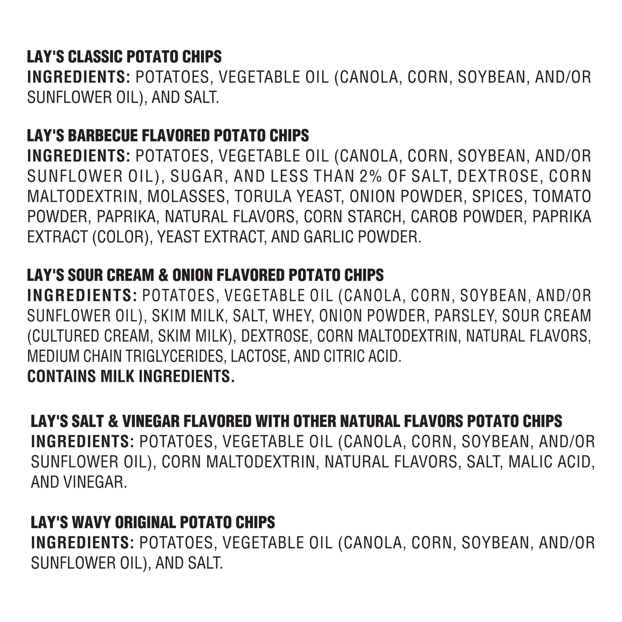 Lay's Salt and Vinegar Flavored Potato Chips: Potatoes, Vegetable Oil (Canola, Corn, Soybean, and/or Sunflower Oil), Maltodextrin (Made From Corn), Natural Flavors, Salt, Malic Acid, and Vinegar Lay's Wavy Original Potato Chips: Potatoes, Vegetable Oil (Sunflower, Corn, and/or Canola Oil), and Salt. Lay's Classic Potato Chips: Potatoes, Vegetable Oil (Canola, Corn, Soybean and/or Sunflower Oil), and Salt. Lay's Barbecue Flavored Potato Chips: Potatoes, Vegetable Oil (Canola, Corn, Soybean, and/or Sunflower Oil), Sugar, and Less Than 2% of the Following: Dextrose, Salt, Maltodextrin (Made From Corn), Molasses, Torula Yeast, Onion Powder, Spices, Tomato Powder, Paprika, Natural Flavors, Corn Starch, Caramel Color, Yeast Extract, Paprika Extracts, Garlic Powder, and Mustard Seed Oil Lay's Sour Cream and Onion Flavored Potato Chips: Potatoes, Vegetable Oil (Canola, Corn, Soybean, and/or Sunflower Oil), Skim Milk, and Less Than 2% of the Following: Salt, Whey, Onion Powder, Parsley, Sour Cream (Cultured Cream, Skim Milk), Dextrose, Maltodextrin (Made From Corn), Natural Flavors, Medium Chain Triglycerides, Lactose, Citric Acid, Buttermilk, and Whey Protein Concentrate. Contains Milk Ingredients.