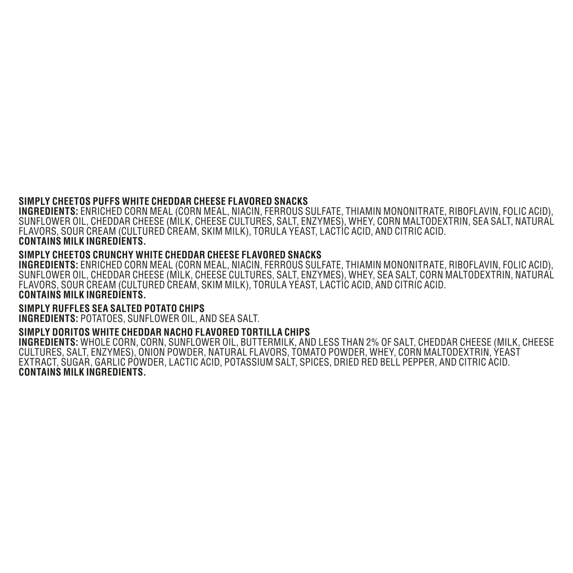 Ingredients: Simply Cheetos Puffs White Cheddar Cheese Flavored Snacks Ingredients: Enriched Corn Meal (Corn Meal, Niacin, Ferrous Sulfate, Thiamin Mononitrate, Riboflavin, Folic Acid), Sunflower Oil, Cheddar Cheese (Milk, Cheese Cultures, Salt, Enzymes), Whey, Corn Maltodextrin, Sea Salt, Natural Flavors, Sour Cream (Cultured Cream, Skim Milk), Torula Yeast, Lactic Acid, And Citric Acid. Contains Milk Ingredients. Simply Cheetos Crunchy White Cheddar Cheese Flavored Snacks Ingredients: Enriched Corn Meal (Corn Meal, Niacin, Ferrous Sulfate, Thiamin Mononitrate, Riboflavin, Folic Acid), Sunflower Oil, Cheddar Cheese (Milk, Cheese Cultures, Salt, Enzymes), Whey, Sea Salt, Corn Maltodextrin, Natural Flavors, Sour Cream (Cultured Cream, Skim Milk), Torula Yeast, Lactic Acid, And Citric Acid. Contains Milk Ingredients. Simply Ruffles Sea Salted Potato Chips Ingredients: Potatoes, Sunflower Oil, And Sea Salt. Simply Doritos White Cheddar Nacho Flavored Tortilla Chips Ingredients: Whole Corn, Corn, Sunflower Oil, Buttermilk, And Less Than 2% Of Salt, Cheddar Cheese (Milk, Cheese Cultures, Salt, Enzymes), Onion Powder, Natural Flavors, Tomato Powder, Whey, Corn Maltodextrin, Yeast Extract, Sugar, Garlic Powder, Lactic Acid, Potassium Salt, Spices, Dried Red Bell Pepper, And Citric Acid. Contains Milk Ingredients.