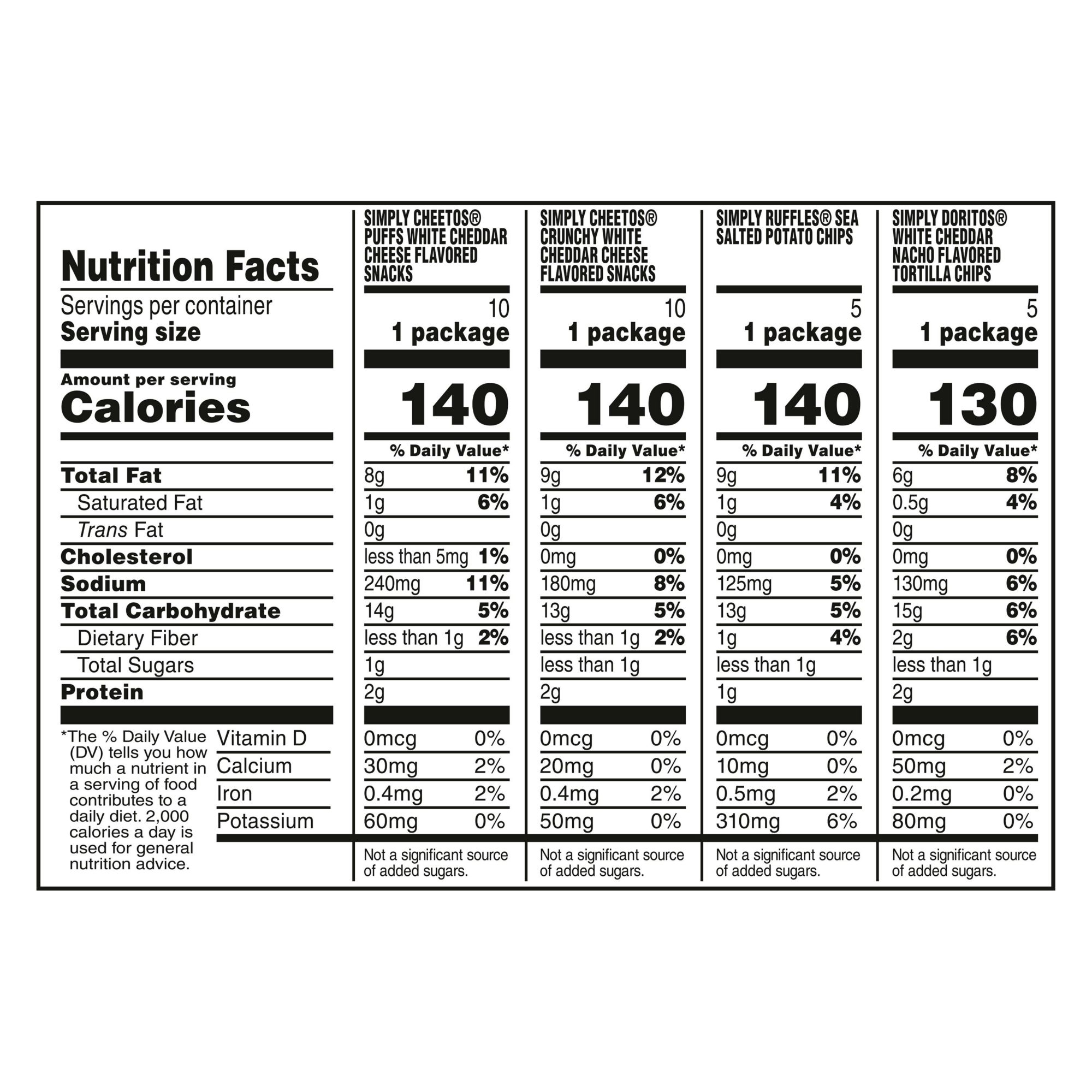 Includes 10 bags Simply Cheetos Puffs White Cheddar cheese snacks, 10 bags Simply Cheetos Crunchy White Cheddar cheese snacks, 5 bags Simply Ruffles Sea Salted potato chips, and 5 bags Simply Doritos White Cheddar Nacho flavored tortilla chips