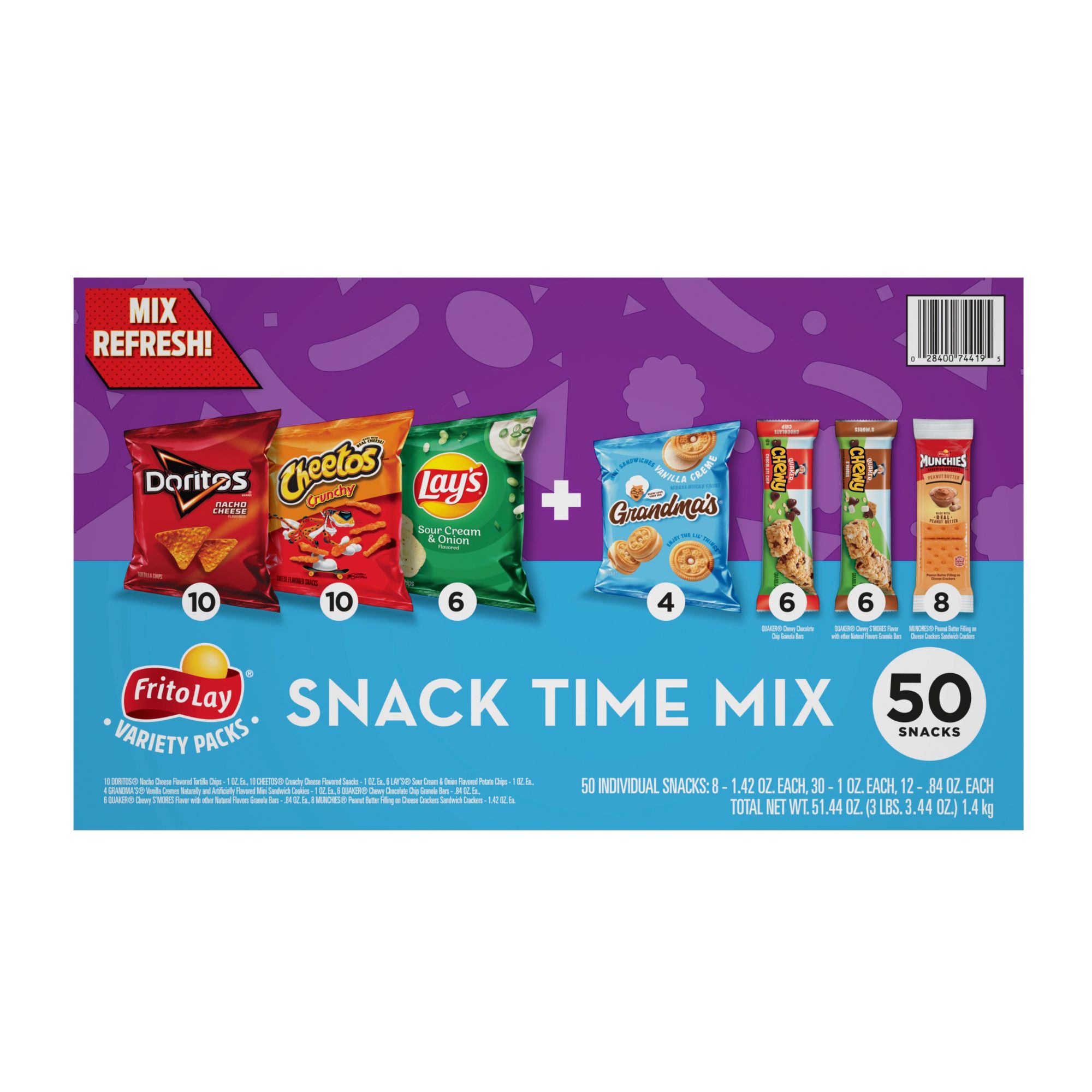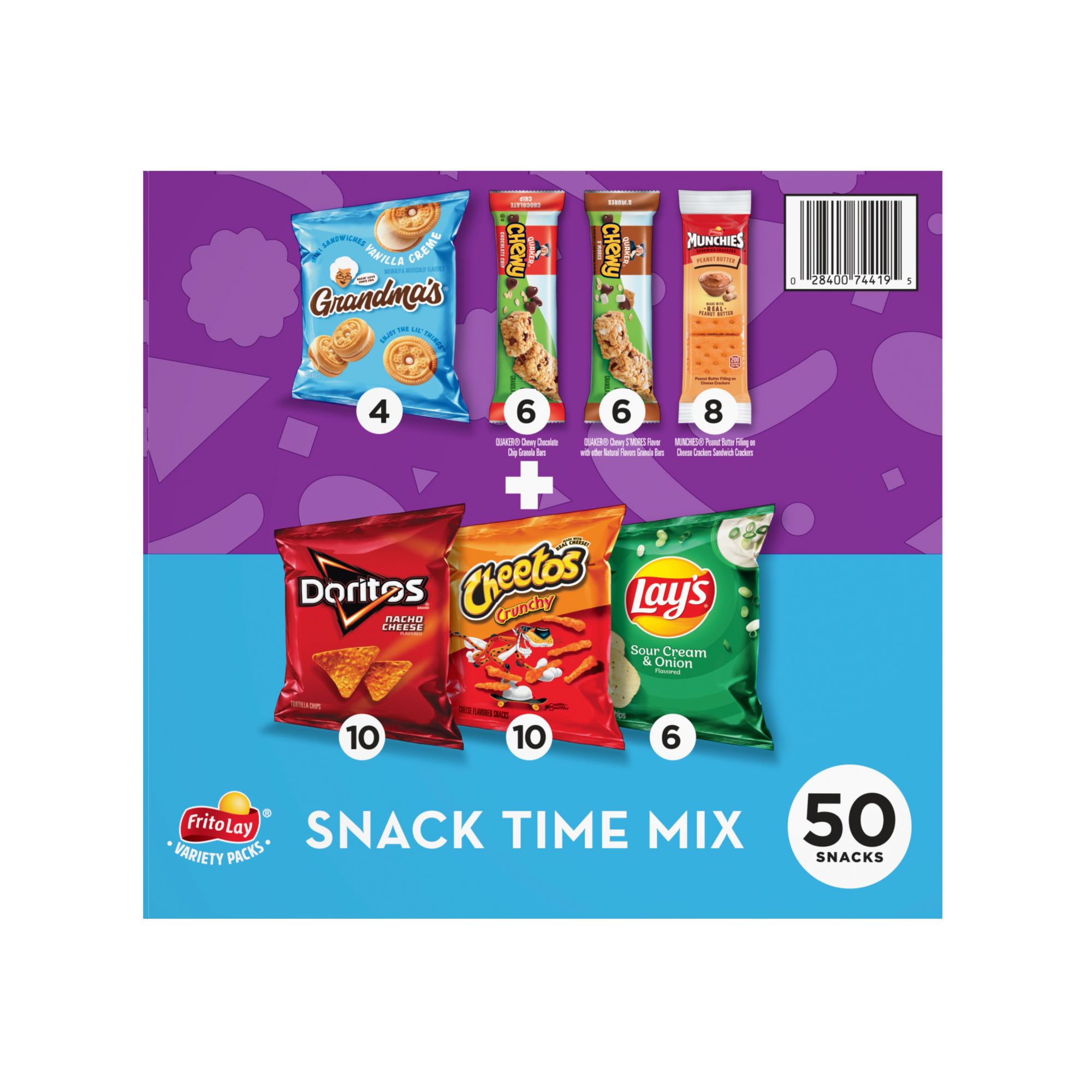 Variety pack features your favorites brands snacks with chips, cookies, granola bars, and crackers Includes 10 bags of Doritos Nacho Cheese flavored tortilla chips, 10 bags of Cheetos Crunchy cheese flavored snacks, 6 bags of Lay's Sour Cream and Onion flavored potato chips, 4 bags of Grandma's Mini Vanila Crème sandwich cookies, 6 Quaker Chewy Chocolate Chip flavored granola bars, 6 Quaker Chewy S'Mores flavored granola bars, and 8 sleeves of Munchies Peanut Butter Cheese sandwich crackers.