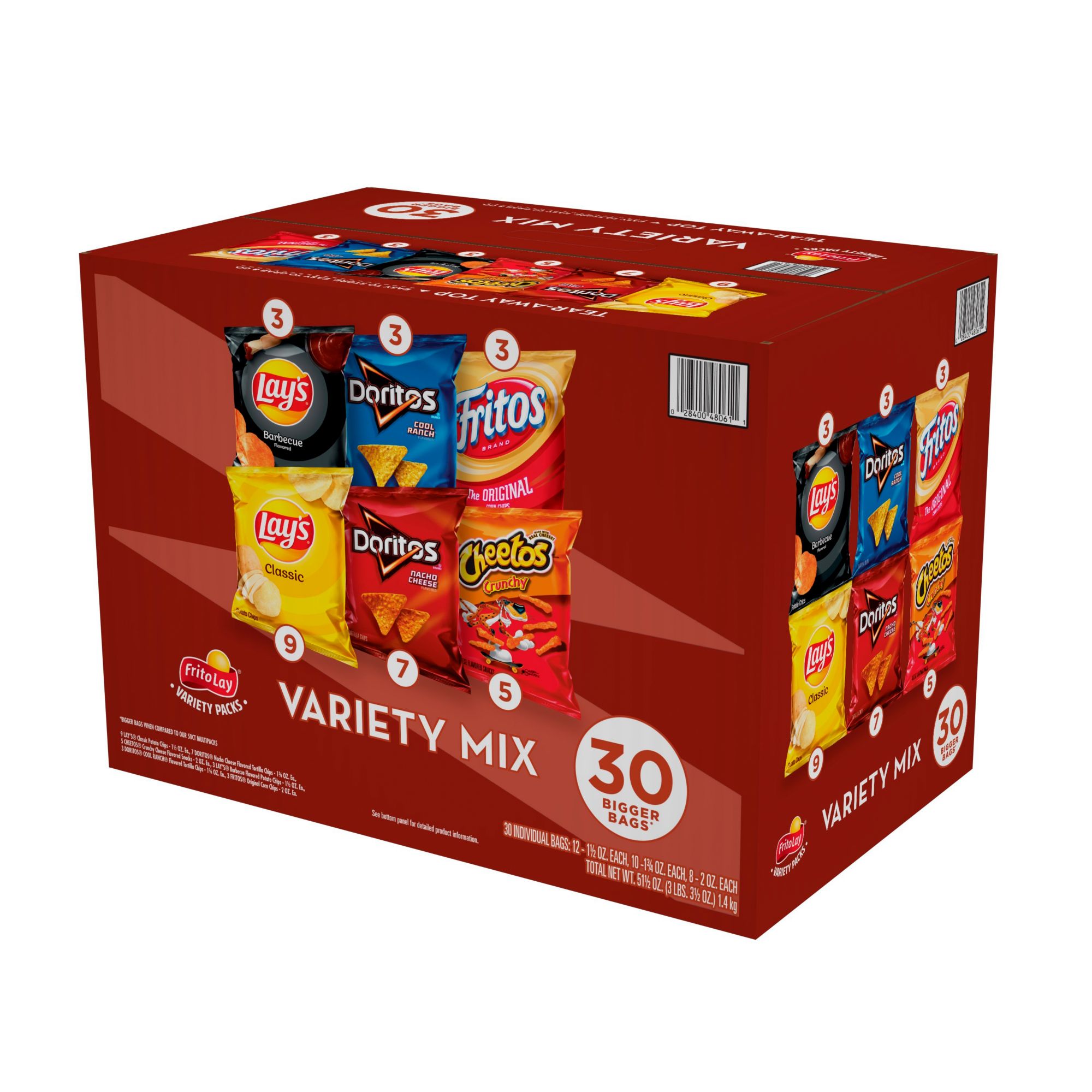 30 bags of snacks in one convenient pack Variety pack lets you choose your favorite - there's something for everyone Single-serve packs help with portion control Portability ensures fresh tasting chips every time Perfect for on-the-go snacking or lunch bags