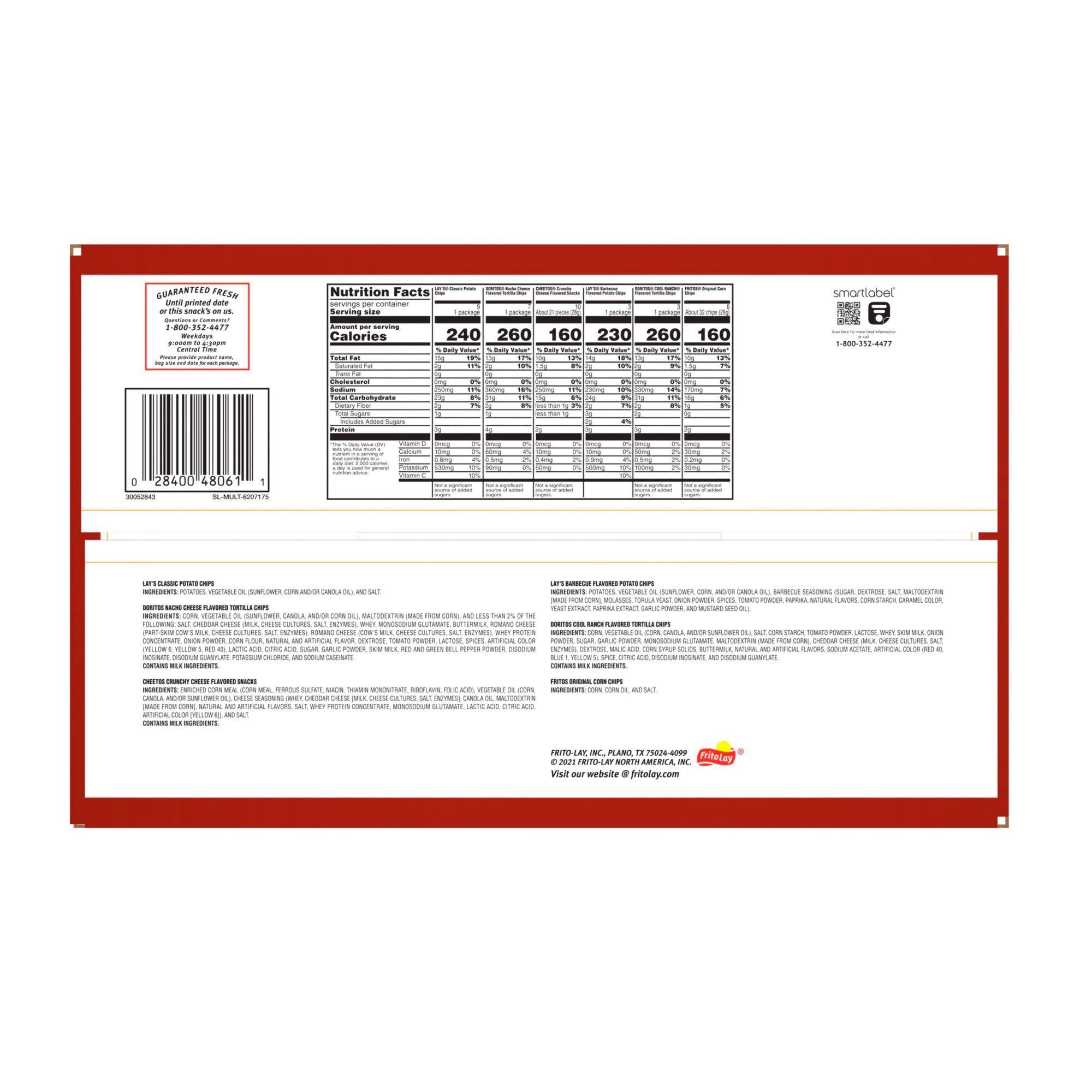Frito-Lay Variety Packs provides the perfect portion size and variety to keep your entire family happy. No matter what the occasion from stocking the pantry, to your next family party, to the lunch box, or even a desk break, all you have to do is grab a pack and go! Whether you're in the mood for a cheesy snack or classic Lay's chips, this variety pack has it all.