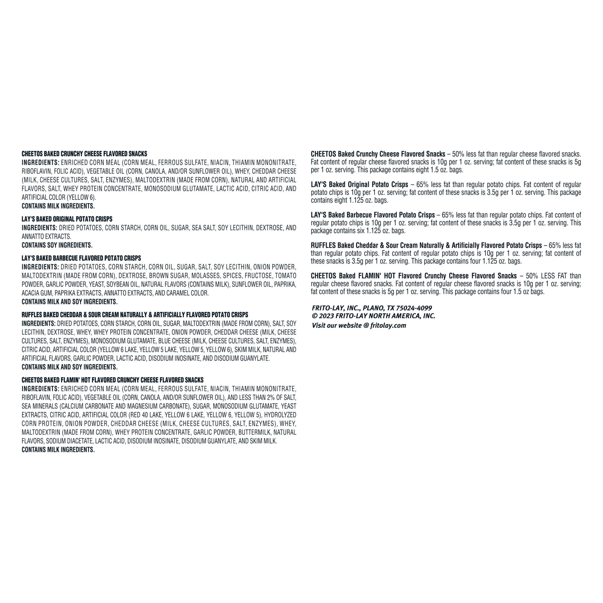 Ruffles Baked Cheddar and Sour Cream Potato Chips, Cheetos Baked Flamin' Hot Cheese Snacks, Cheetos Baked Crunchy Cheese Snacks, Lay's Baked Original Potato Chips, and Lay's Baked Barbecue Flavored Potato Chips