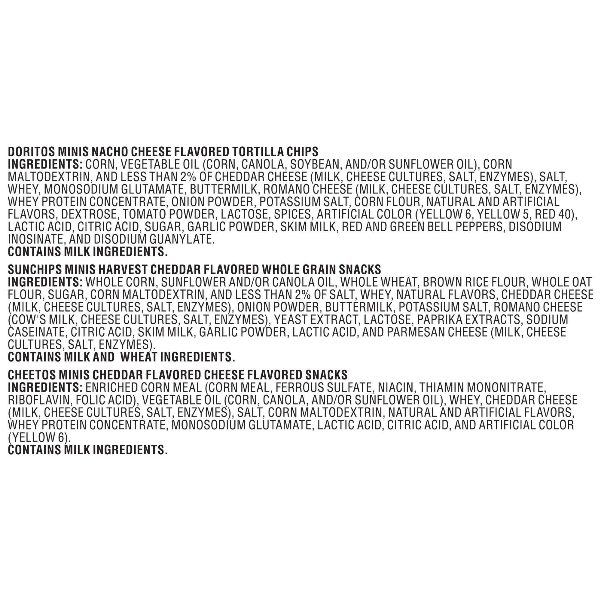 Ingredients: Doritos Minis Nacho Cheese Flavored Tortilla Chips Ingredients: Corn, Vegetable Oil (Corn, Canola, Soybean, And/Or Sunflower Oil), Corn Maltodextrin, And Less Than 2% Of Cheddar Cheese (Milk, Cheese Cultures, Salt, Enzymes), Salt, Whey, Monosodium Glutamate, Buttermilk, Romano Cheese (Milk, Cheese Cultures, Salt, Enzymes), Whey Protein Concentrate, Onion Powder, Potassium Salt, Corn Flour, Natural And Artificial Flavors, Dextrose, Tomato Powder, Lactose, Spices, Artificial Color (Yellow 6, Yellow 5, Red 40), Lactic Acid, Citric Acid, Sugar, Garlic Powder, Skim Milk, Red And Green Bell Peppers, Disodium Inosinate, And Disodium Guanylate Contains Milk Ingredients. SunChips Minis Harvest Cheddar Flavored Whole Grain Snacks Ingredients: Whole Corn, Sunflower And/Or Canola Oil, Whole Wheat, Brown Rice Flour, Whole Oat Flour, Sugar, Corn Maltodextrin, And Less Than 2% Of Salt, Whey, Natural Flavors, Cheddar Cheese (Milk, Cheese Cultures, Salt, Enzymes), Onion Powder, Buttermilk, Potassium Salt, Romano Cheese (Cow's Milk, Cheese Cultures, Salt, Enzymes), Yeast Extract, Lactose, Paprika Extracts, Sodium Caseinate, Citric Acid, Skim Milk, Garlic Powder, Lactic Acid, And Parmesan Cheese (Milk, Cheese Cultures, Salt, Enzymes).Contains Milk And Wheat Ingredients. Cheetos Minis Cheddar Flavored Cheese Flavored Snacks Ingredients: Enriched Corn Meal (Corn Meal, Ferrous Sulfate, Niacin, Thiamin Mononitrate, Riboflavin, Folic Acid), Vegetable Oil (Corn, Canola, And/Or Sunflower Oil), Whey, Cheddar Cheese (Milk, Cheese Cultures, Salt, Enzymes), Salt, Corn Maltodextrin, Natural And Artificial Flavors, Whey Protein Concentrate, Monosodium Glutamate, Lactic Acid, Citric Acid, And Artificial Color (Yellow 6). Contains Milk Ingredients.