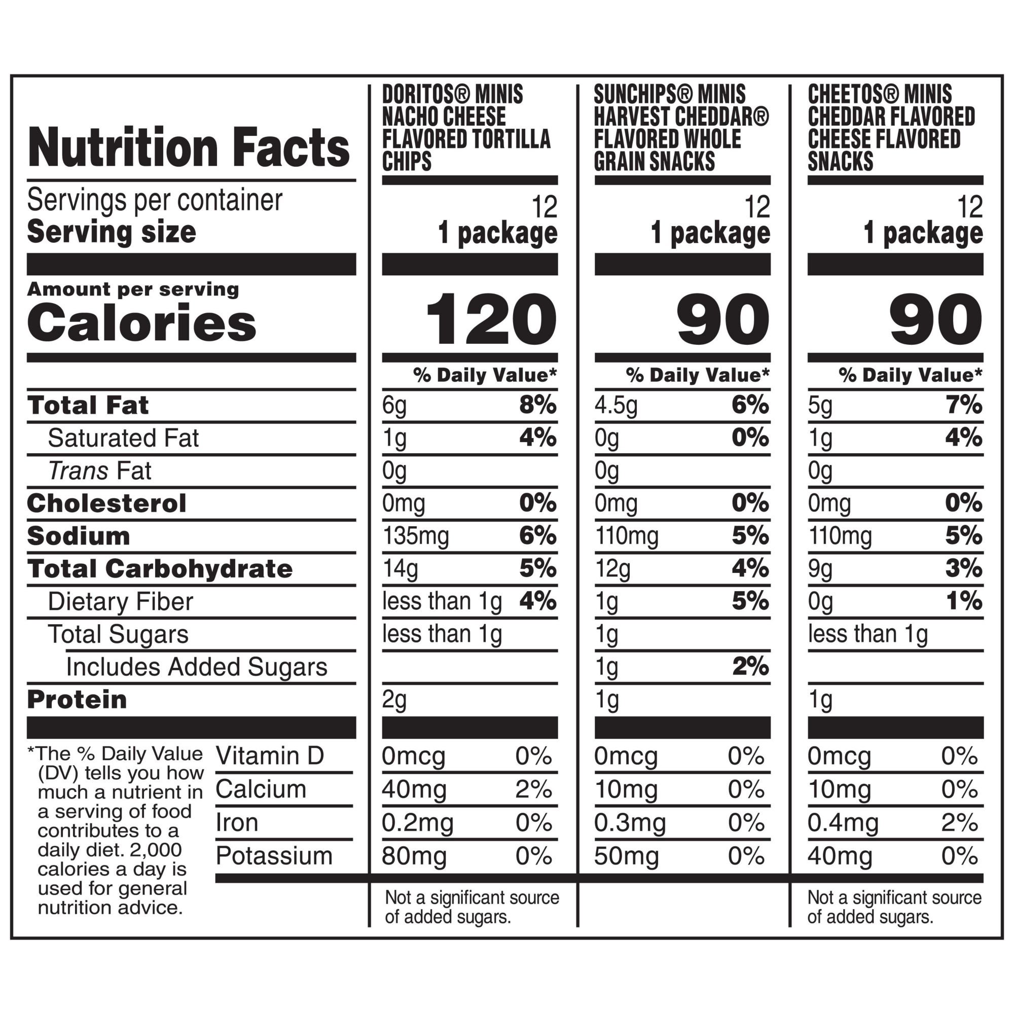 Includes 12 cups of Doritos Minis Nacho Cheese flavored tortilla chips, 12 cups of SunChips Minis Harvest Cheddar flavored multigrain snacks, 12 cups of Cheetos Minis Cheddar Cheese flavored cheese snacks