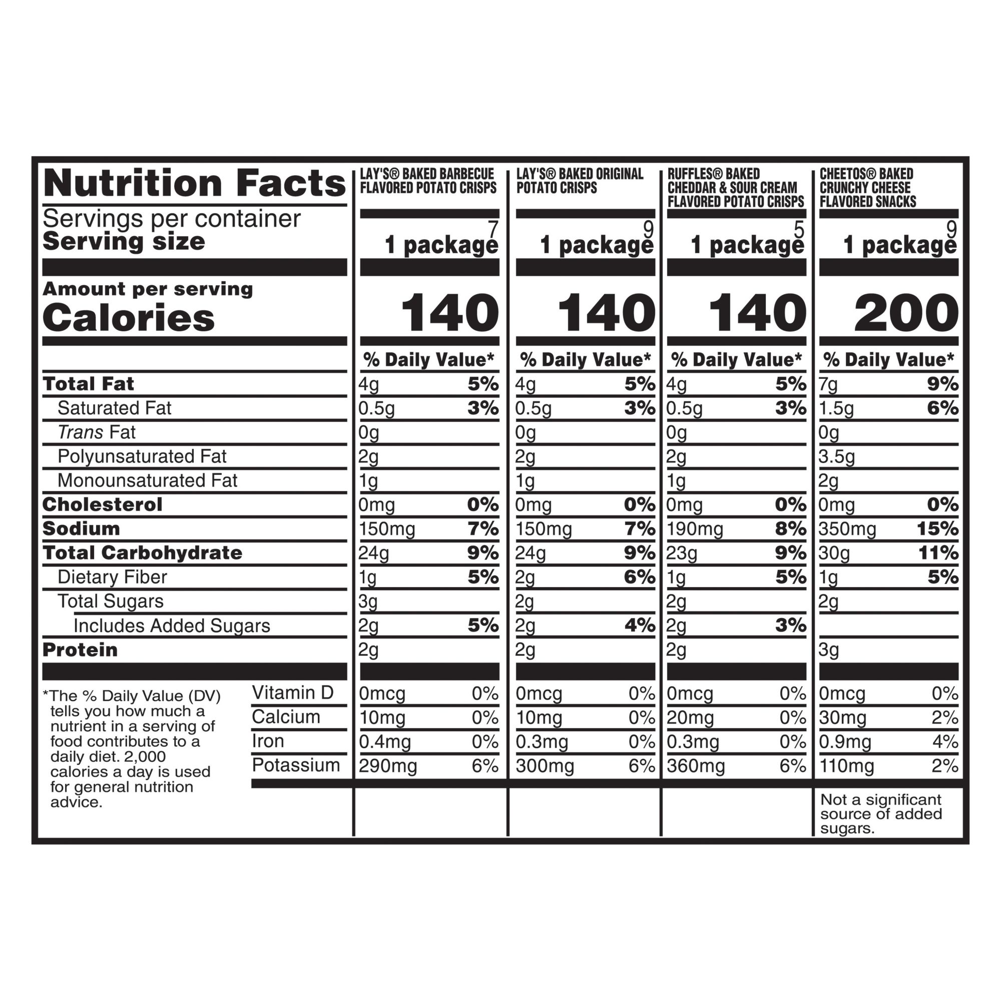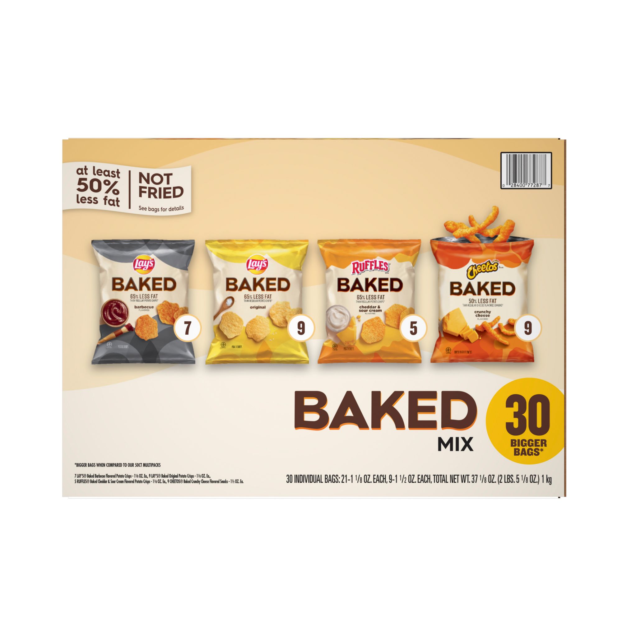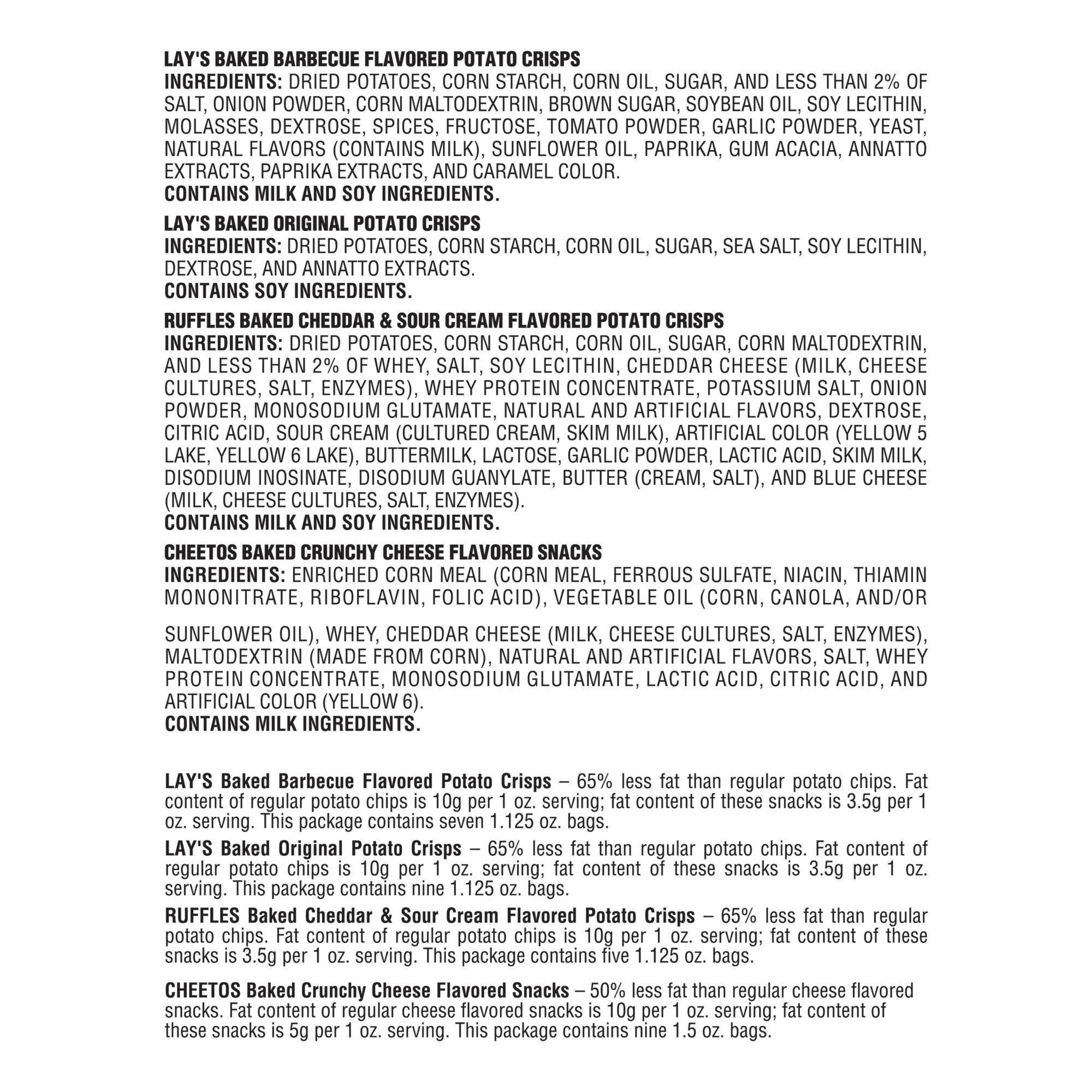 Includes 7 bags of Lay's Baked Barbecue flavored potato chips, 9 bags of Lay's Baked Original potato chips, 5 bags of Ruffles Baked Cheddar and Sour Cream potato chips, and 9 bags Cheetos Baked Crunchy Cheese snacks