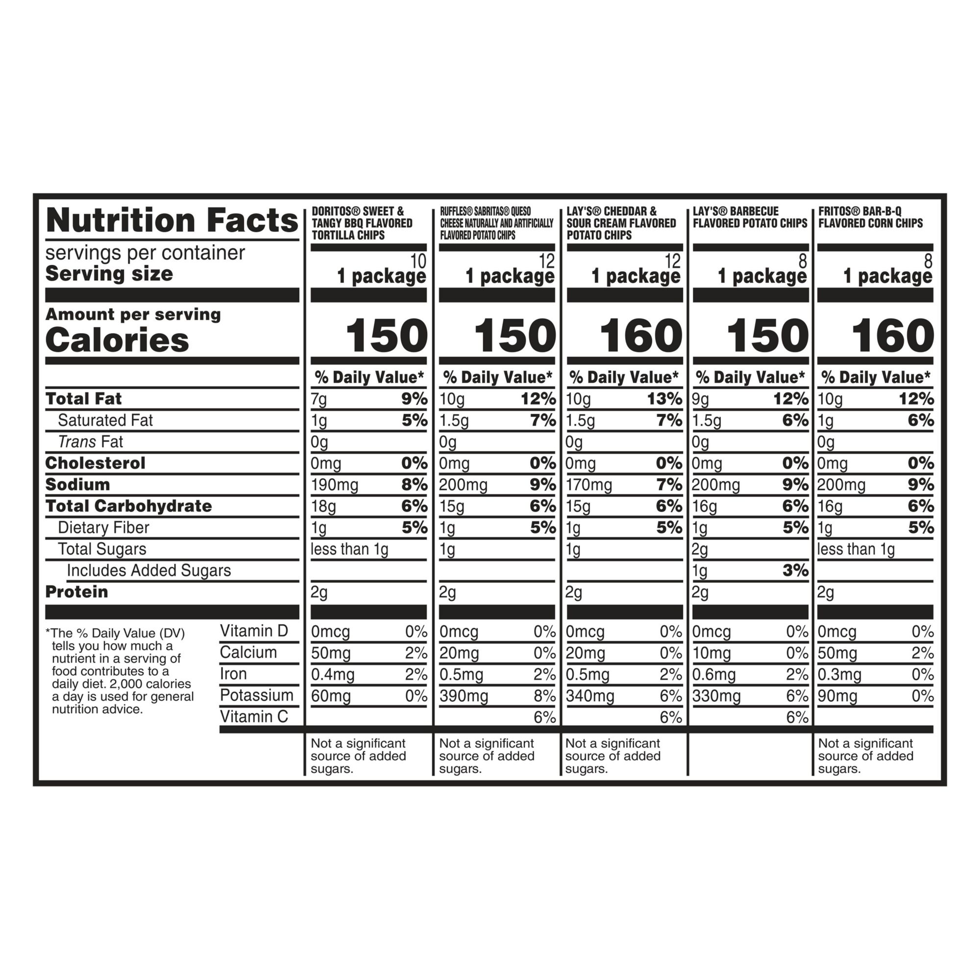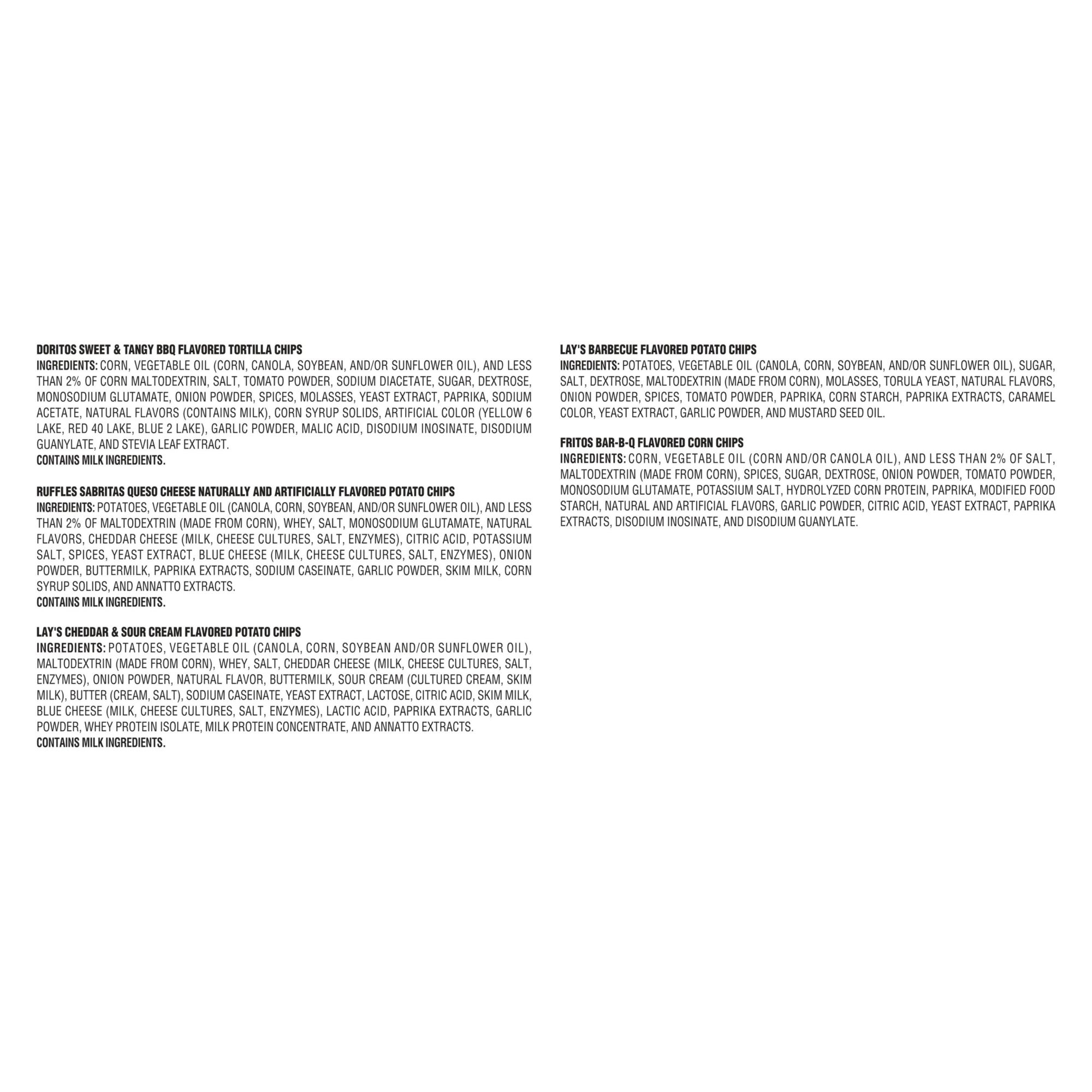 Ingredients: Doritos Tortilla Chips Sweet & Tangy Bbq Flavored Ingredients: Corn, Vegetable Oil (Corn, Canola, And/or Sunflower Oil), And Less Than 2% Of Maltodextrin (Made From Corn), Salt, Tomato Powder, Sodium Diacetate, Sugar, Dextrose, Monosodium Glutamate, Onion Powder, Spices, Molasses, Yeast Extract, Paprika, Sodium Acetate, Natural Flavors (Contains Milk), Corn Syrup Solids, Artificial Color (Yellow 6 Lake, Red 40 Lake, Blue 2 Lake), Garlic Powder, Malic Acid, Disodium Inosinate, Disodium Guanylate, And Stevia Leaf Extract. Contains Milk Ingredients. Ruffles Potato Chips Queso Cheese Flavored Ingredients: Potatoes, Vegetable Oil (Canola, Corn, Soybean, And/or Sunflower Oil), And Less Than 2% Of Maltodextrin (Made From Corn), Whey, Salt, Monosodium Glutamate, Natural Flavors, Cheddar Cheese (Milk, Cheese Cultures, Salt, Enzymes), Citric Acid, Potassium Salt, Spices, Yeast Extract, Blue Cheese (Milk, Cheese Cultures, Salt, Enzymes), Onion Powder, Buttermilk, Paprika Extracts, Sodium Caseinate, Garlic Powder, Skim Milk, Corn Syrup Solids, And Annatto Extracts. Contains Milk Ingredients. Lay's Potato Chips Cheddar & Sour Cream Flavored Ingredients: Potatoes, Vegetable Oil (Canola, Corn, Soybean And/or Sunflower Oil), Maltodextrin (Made From Corn), Whey, Salt, Cheddar Cheese (Milk, Cheese Cultures, Salt, Enzymes), Onion Powder, Natural Flavor, Buttermilk, Sour Cream (Cultured Cream, Skim Milk), Butter (Cream, Salt), Sodium Caseinate, Yeast Extract, Lactose, Citric Acid, Skim Milk, Blue Cheese (Milk, Cheese Cultures, Salt, Enzymes), Lactic Acid, Paprika Extracts, Garlic Powder, Whey Protein Isolate, Milk Protein Concentrate, And Annatto Extracts. Contains Milk Ingredients Lay's Potato Chips Barbecue Flavored Ingredients: Potatoes, Vegetable Oil (Canola, Corn, Soybean, And/or Sunflower Oil), Sugar, Salt, Dextrose, Maltodextrin (Made From Corn), Molasses, Torula Yeast, Natural Flavors, Onion Powder, Spices, Tomato Powder, Paprika, Corn Starch, Paprika Extracts, Caramel Color, Yeast Extract, Garlic Powder, And Mustard Seed Oil. Fritos Flavored Corn Chips Bar.b.q Ingredients: Corn, Vegetable Oil (Corn And/or Canola Oil), And Less Than 2% Of Salt, Maltodextrin (Made From Corn), Spices, Sugar, Dextrose, Onion Powder, Tomato Powder, Monosodium Glutamate, Potassium Salt, Hydrolyzed Corn Protein, Paprika, Modified Food Starch, Natural And Artificial Flavors, Garlic Powder, Citric Acid, Yeast Extract, Paprika Extracts, Disodium Inosinate, And Disodium Guanylate.